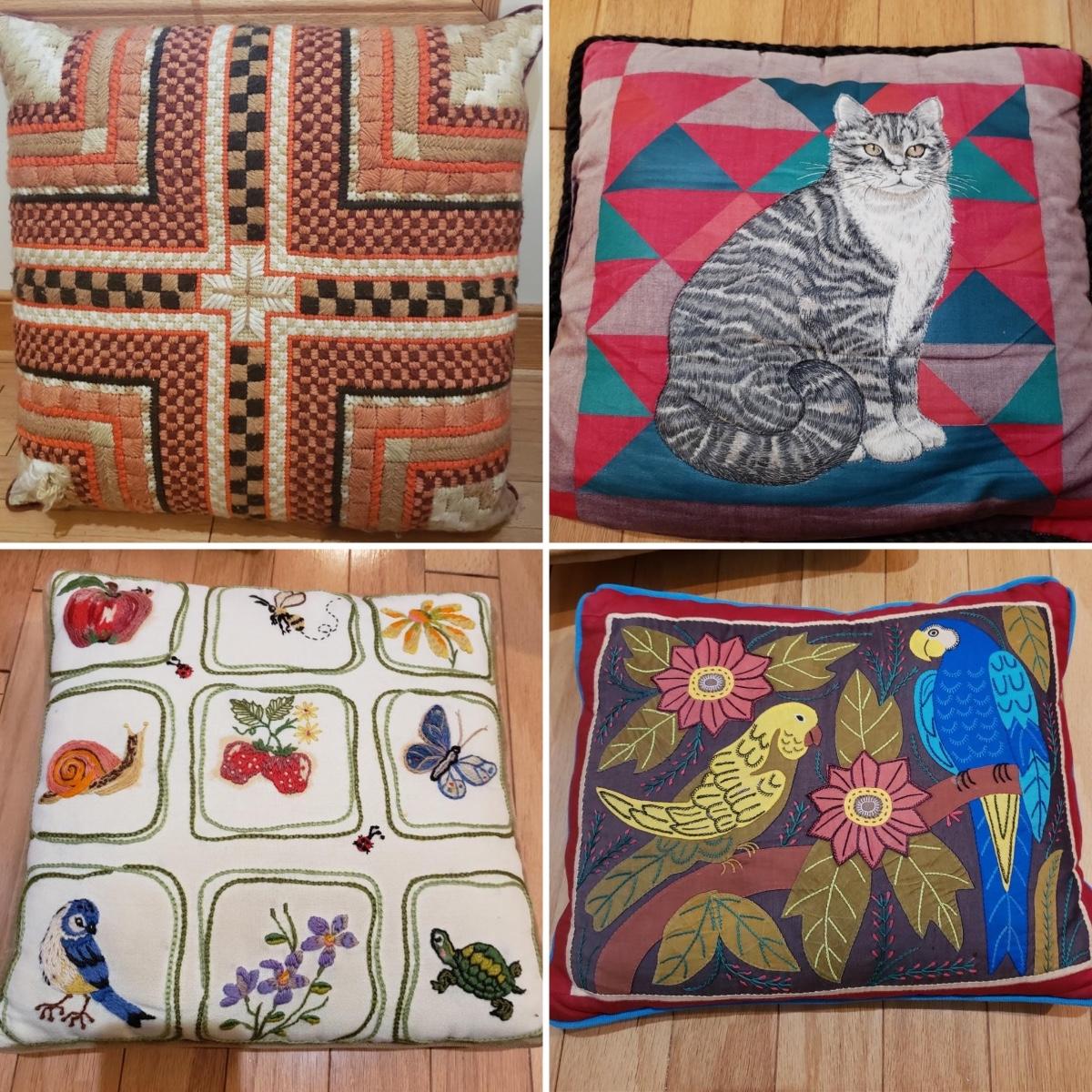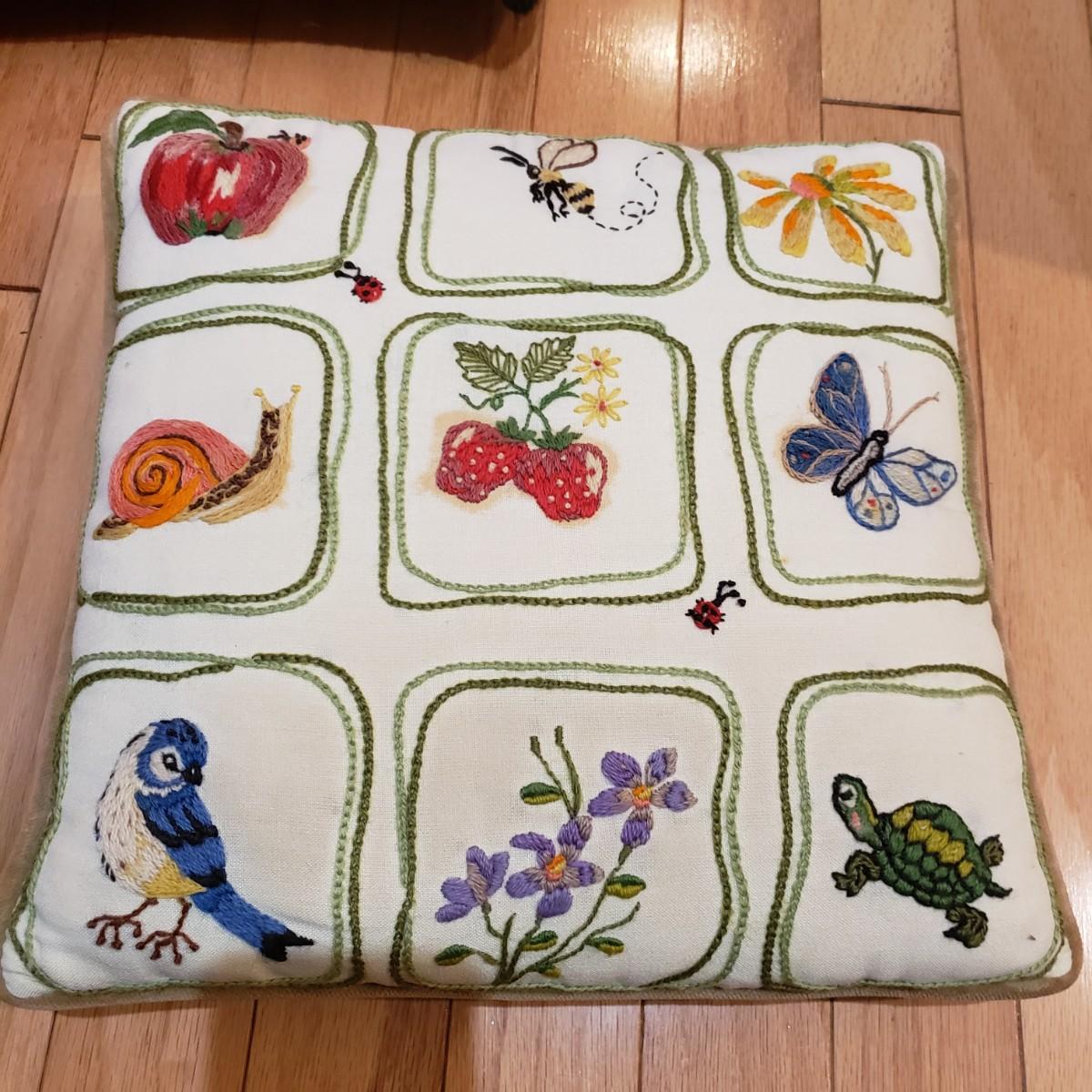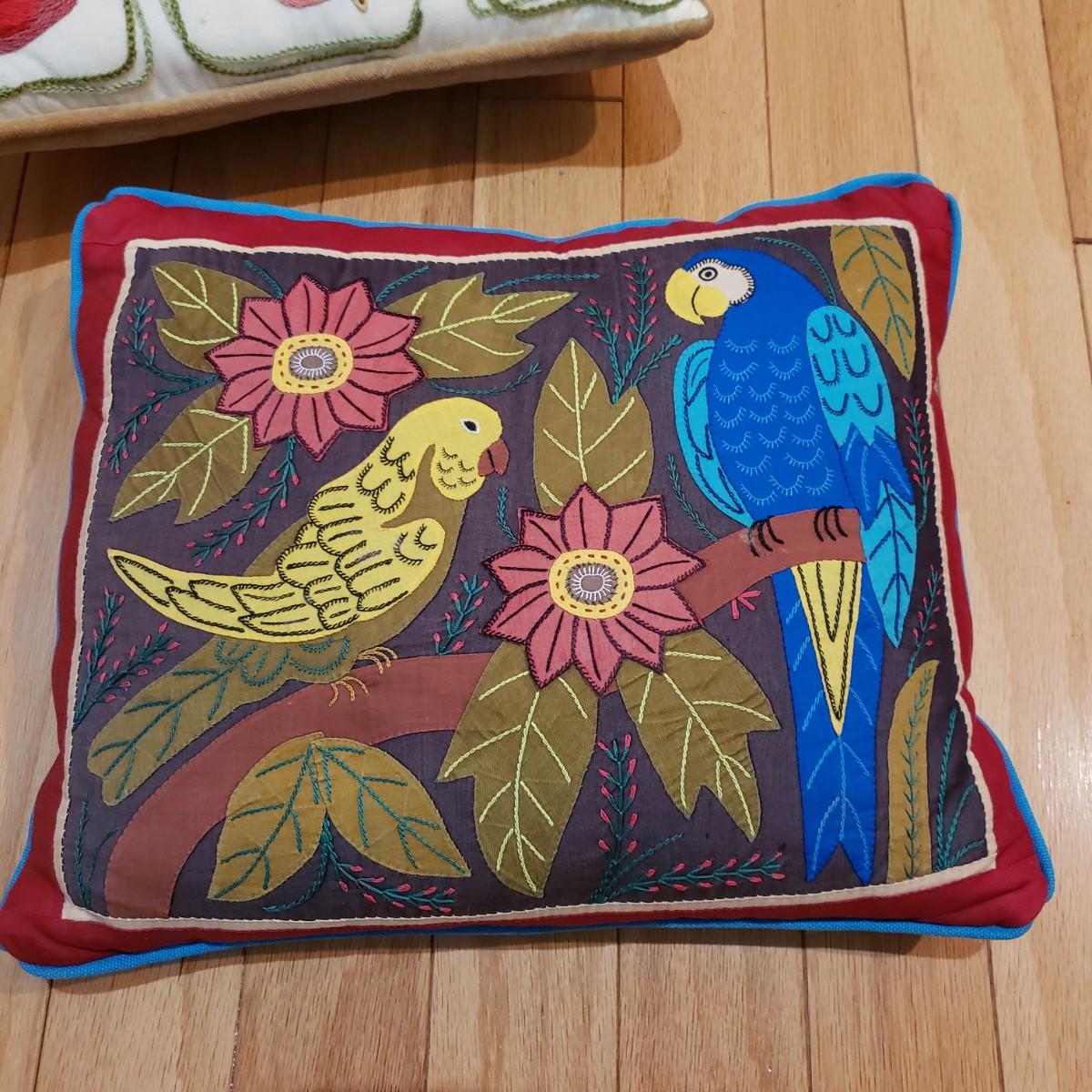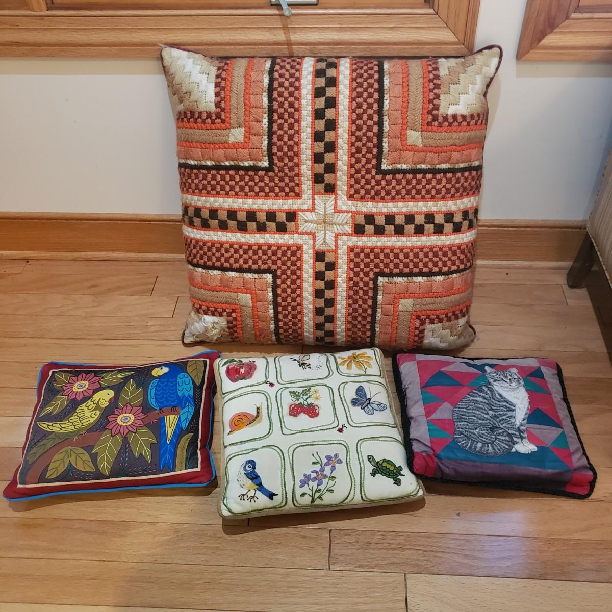 There are four fun and unique accent pillows that compile this lot. The appliqué bird pillow measures 15" x 12". The back is covered in a heavy canvas-like material. The back of the embroidered flower and insect pillow is covered in a crushed velvet material. There is some light staining around the edges of a few of the designs on this pillow. The quilted-style cat pillow has a twisted cord border around the edge. Finally, the crocheted pillow in browns, and oranges measures 28" x 26" x 5"H. The back is also covered in a rust crushed velvet. There is one corner that is frayed, see pictures.