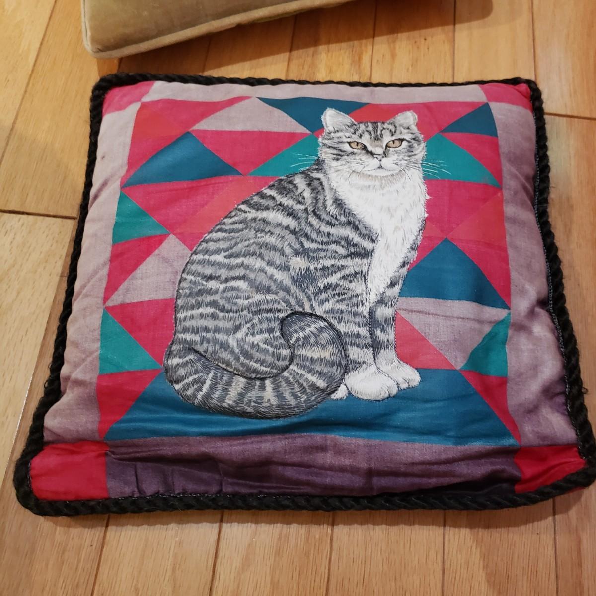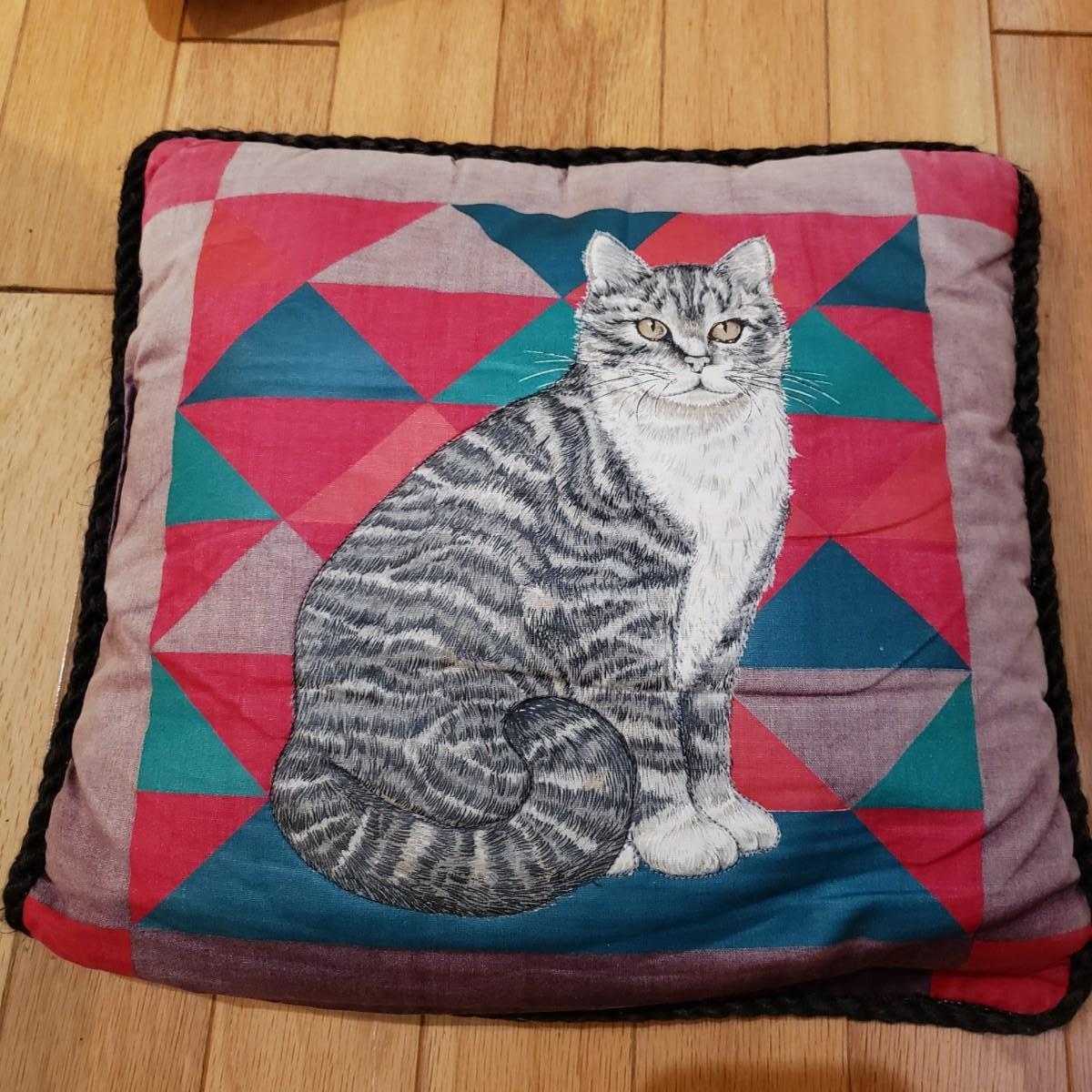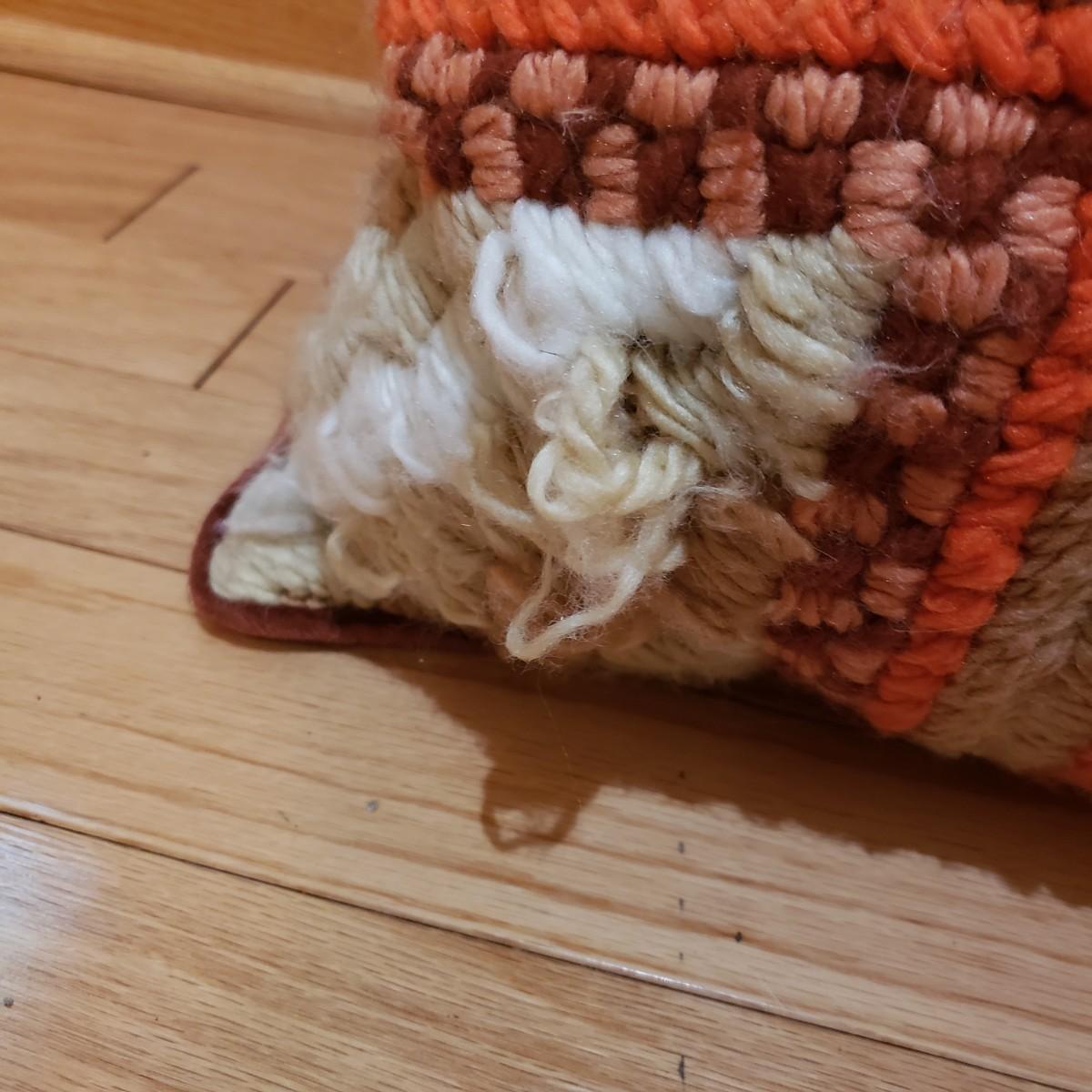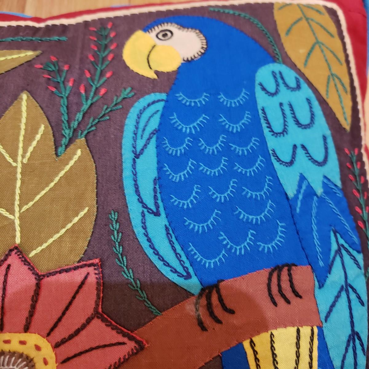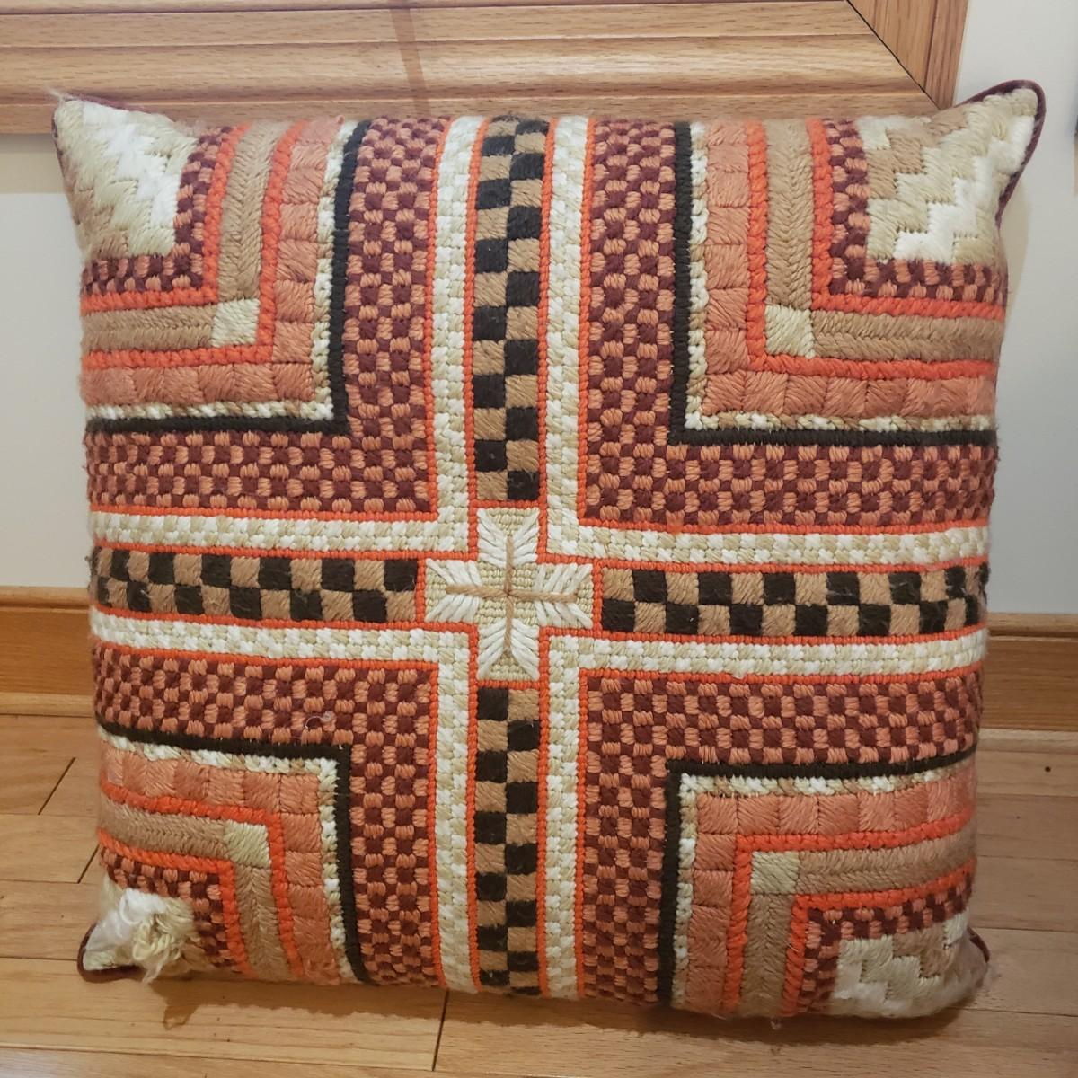 There are four fun and unique accent pillows that compile this lot. The appliqué bird pillow measures 15" x 12". The back is covered in a heavy canvas-like material. The back of the embroidered flower and insect pillow is covered in a crushed velvet material. There is some light staining around the edges of a few of the designs on this pillow. The quilted-style cat pillow has a twisted cord border around the edge. Finally, the crocheted pillow in browns, and oranges measures 28" x 26" x 5"H. The back is also covered in a rust crushed velvet. There is one corner that is frayed, see pictures.