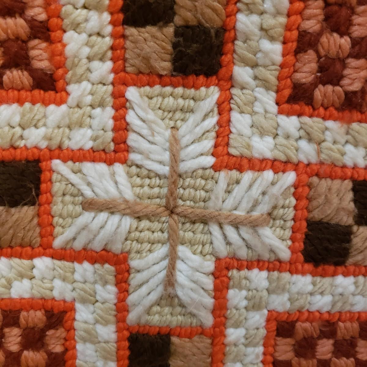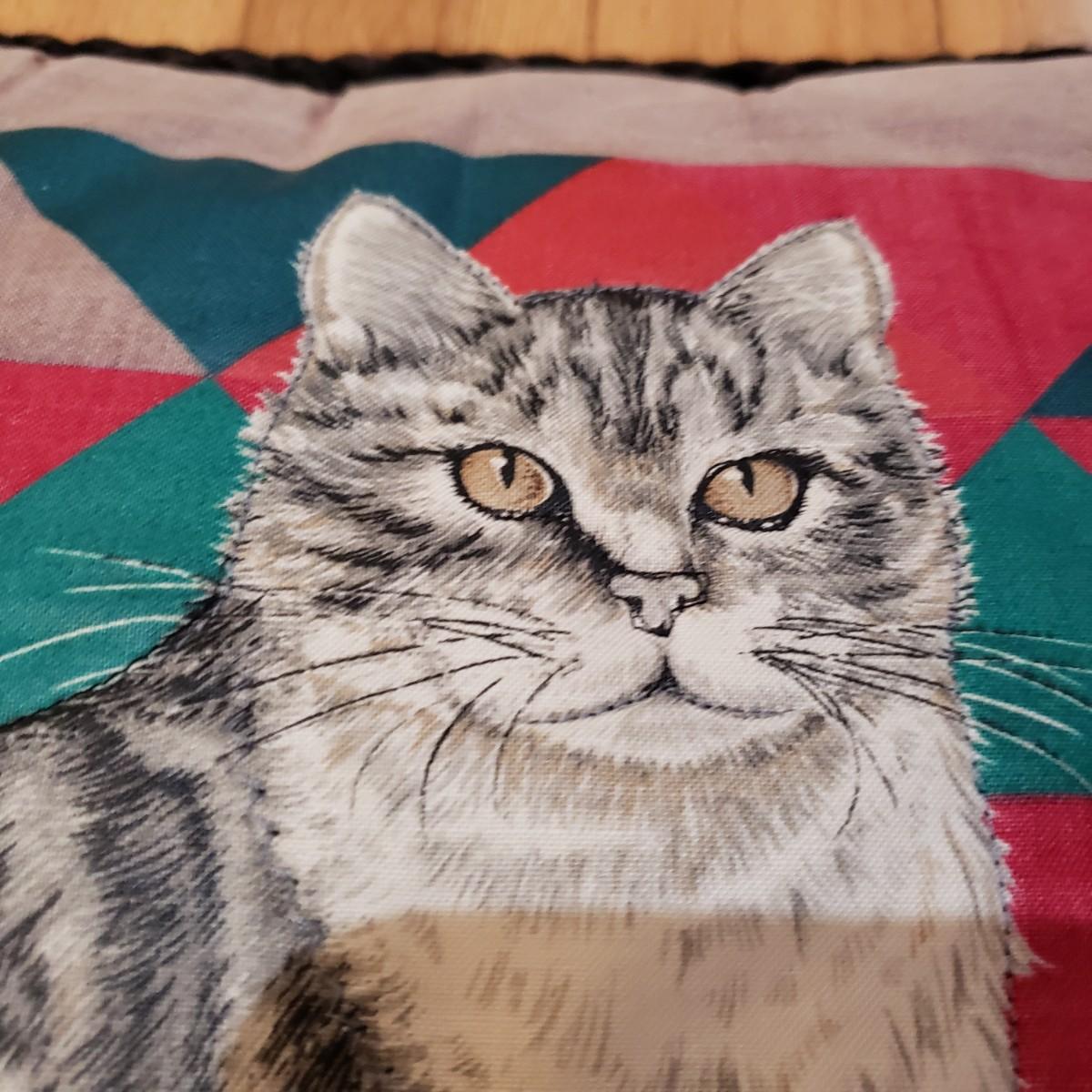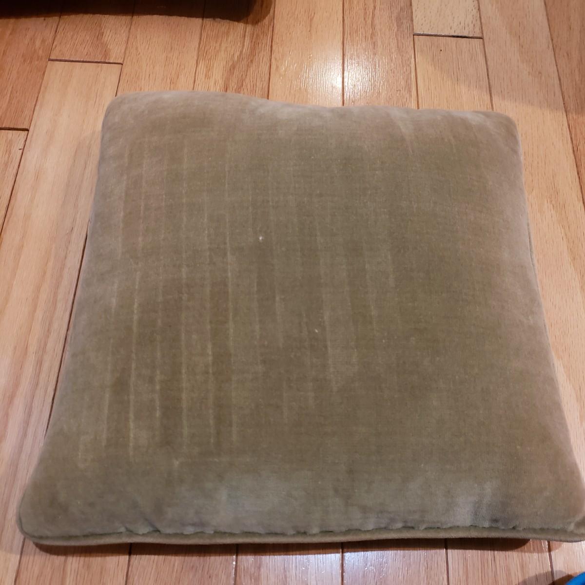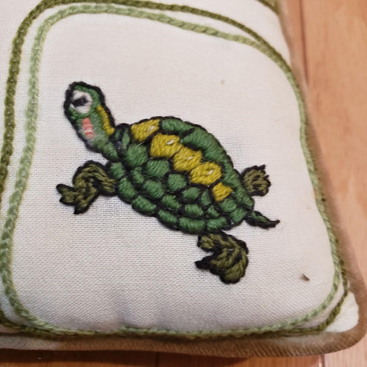 There are four fun and unique accent pillows that compile this lot. The appliqué bird pillow measures 15" x 12". The back is covered in a heavy canvas-like material. The back of the embroidered flower and insect pillow is covered in a crushed velvet material. There is some light staining around the edges of a few of the designs on this pillow. The quilted-style cat pillow has a twisted cord border around the edge. Finally, the crocheted pillow in browns, and oranges measures 28" x 26" x 5"H. The back is also covered in a rust crushed velvet. There is one corner that is frayed, see pictures.