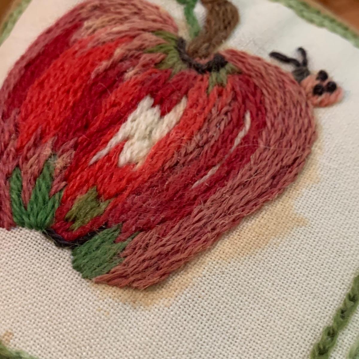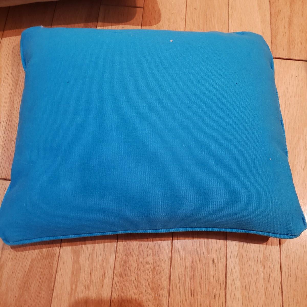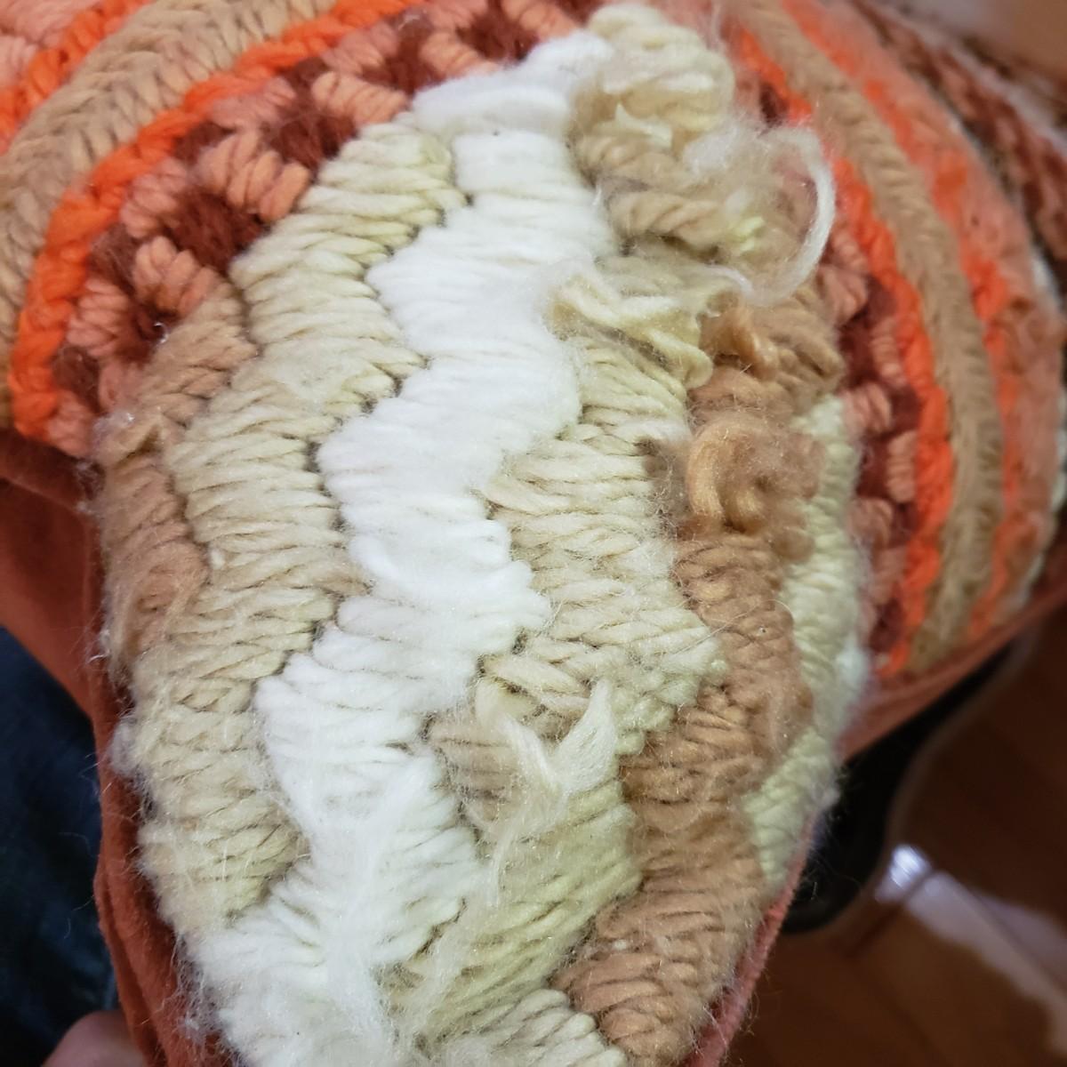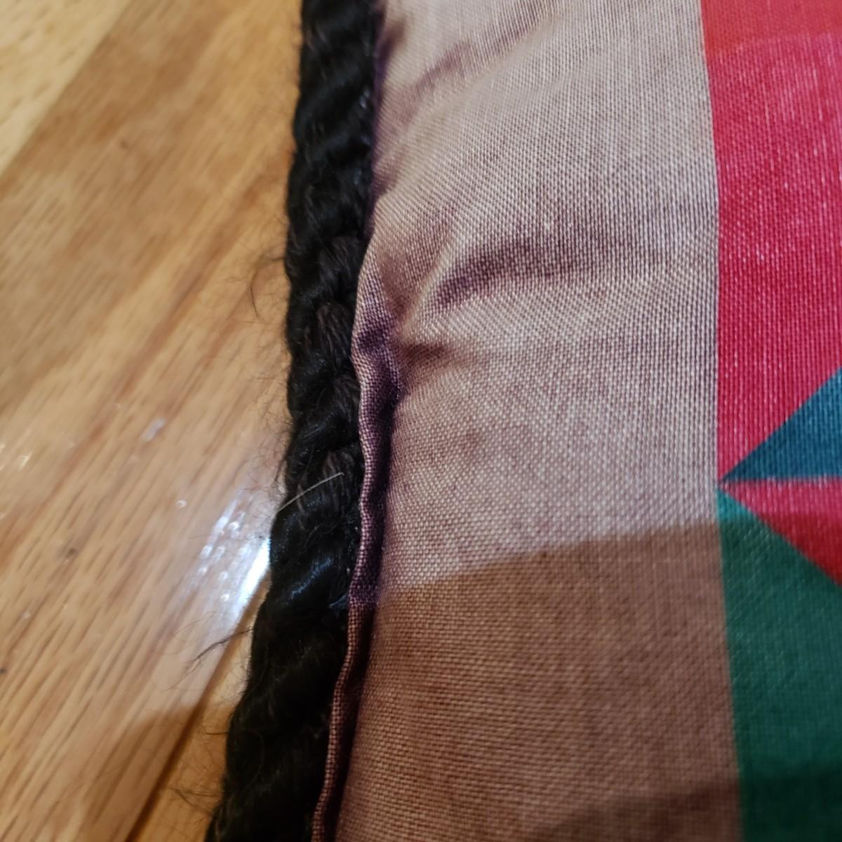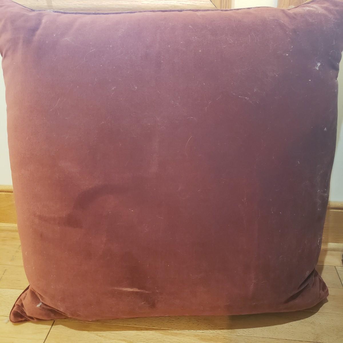There are four fun and unique accent pillows that compile this lot. The appliqué bird pillow measures 15" x 12". The back is covered in a heavy canvas-like material. The back of the embroidered flower and insect pillow is covered in a crushed velvet material. There is some light staining around the edges of a few of the designs on this pillow. The quilted-style cat pillow has a twisted cord border around the edge. Finally, the crocheted pillow in browns, and oranges measures 28" x 26" x 5"H. The back is also covered in a rust crushed velvet. There is one corner that is frayed, see pictures.