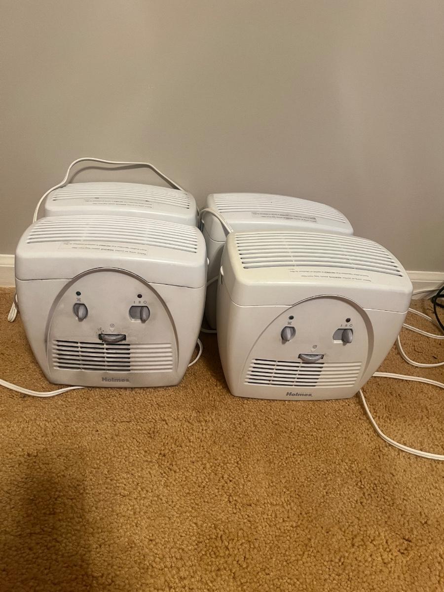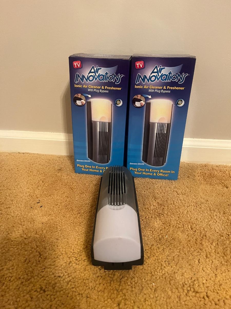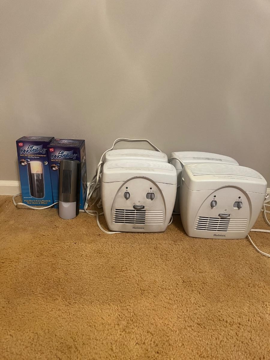Lot includes four Holmes air purifiers and three Air Innovations ionic air cleaners. All items powered on when plugged in. Holmes air purifiers measure 9” x 9” x 6”H. Items are dirty, see pictures.