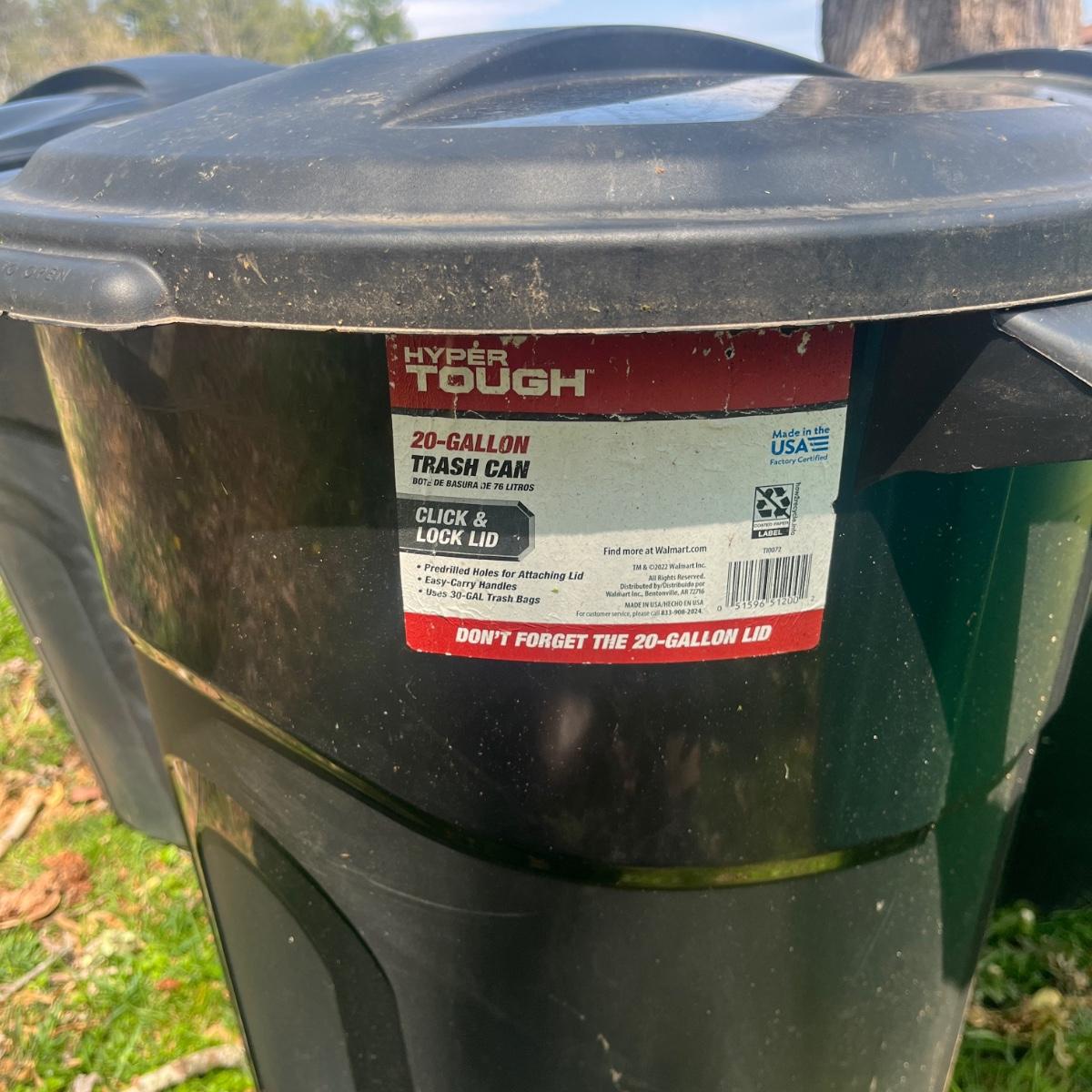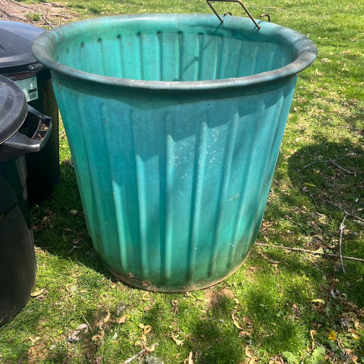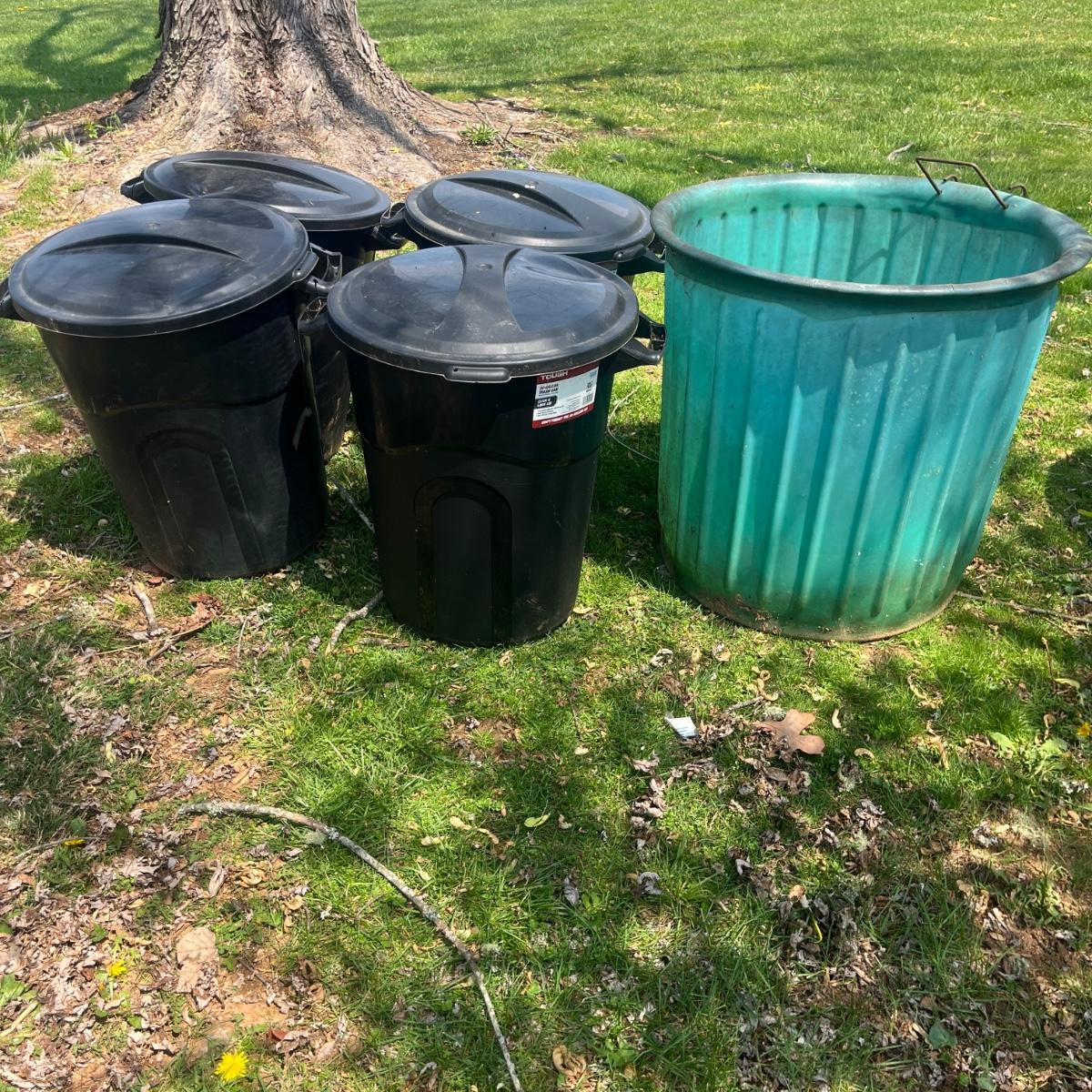 Lot includes four plastic Hyper Tough 20 gallon garbage cans with lids and one plastic container that measures 28”D x 27.5”H; a few light cracks in the rim of this green container, see images.
