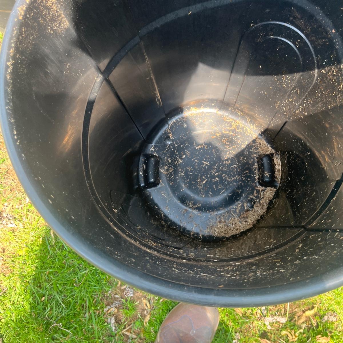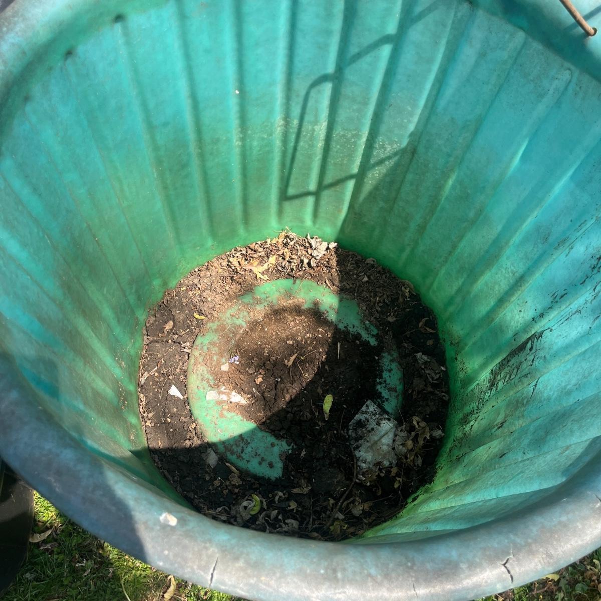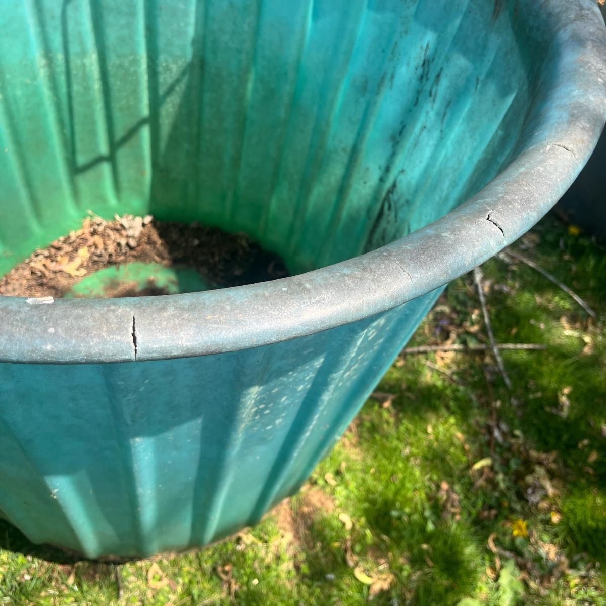 Lot includes four plastic Hyper Tough 20 gallon garbage cans with lids and one plastic container that measures 28”D x 27.5”H; a few light cracks in the rim of this green container, see images.