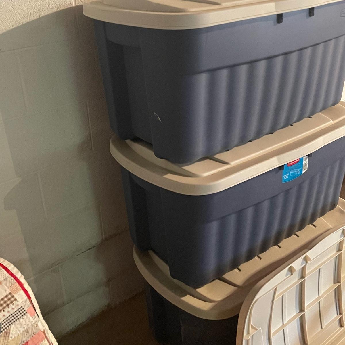 Four jumbo storage bins with hinged lids and 40 gallon capacity.