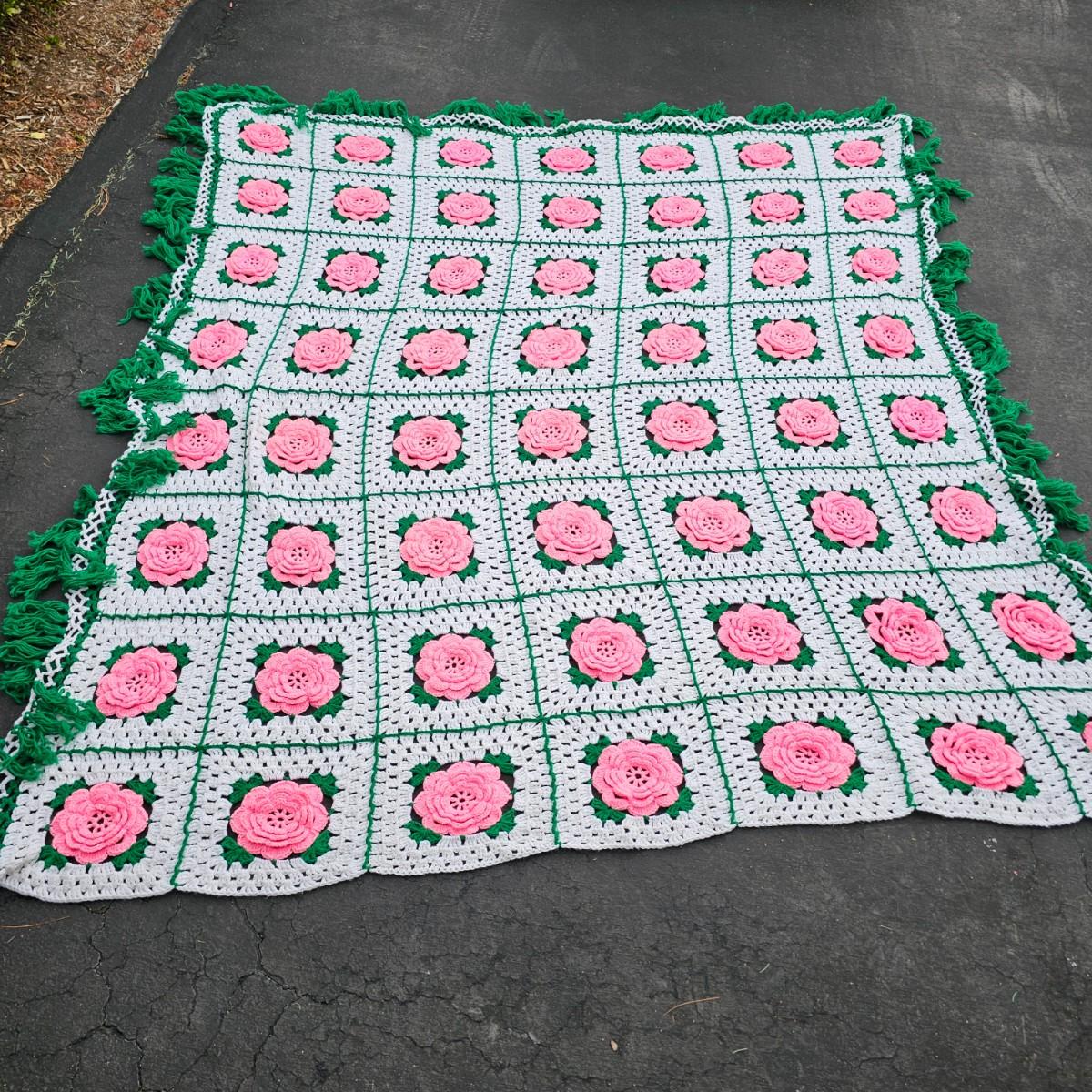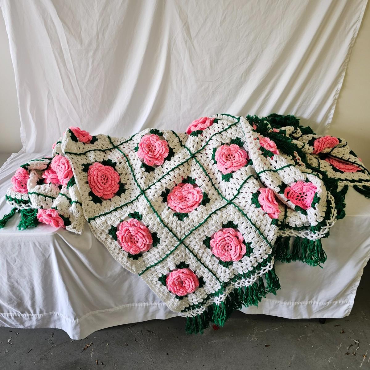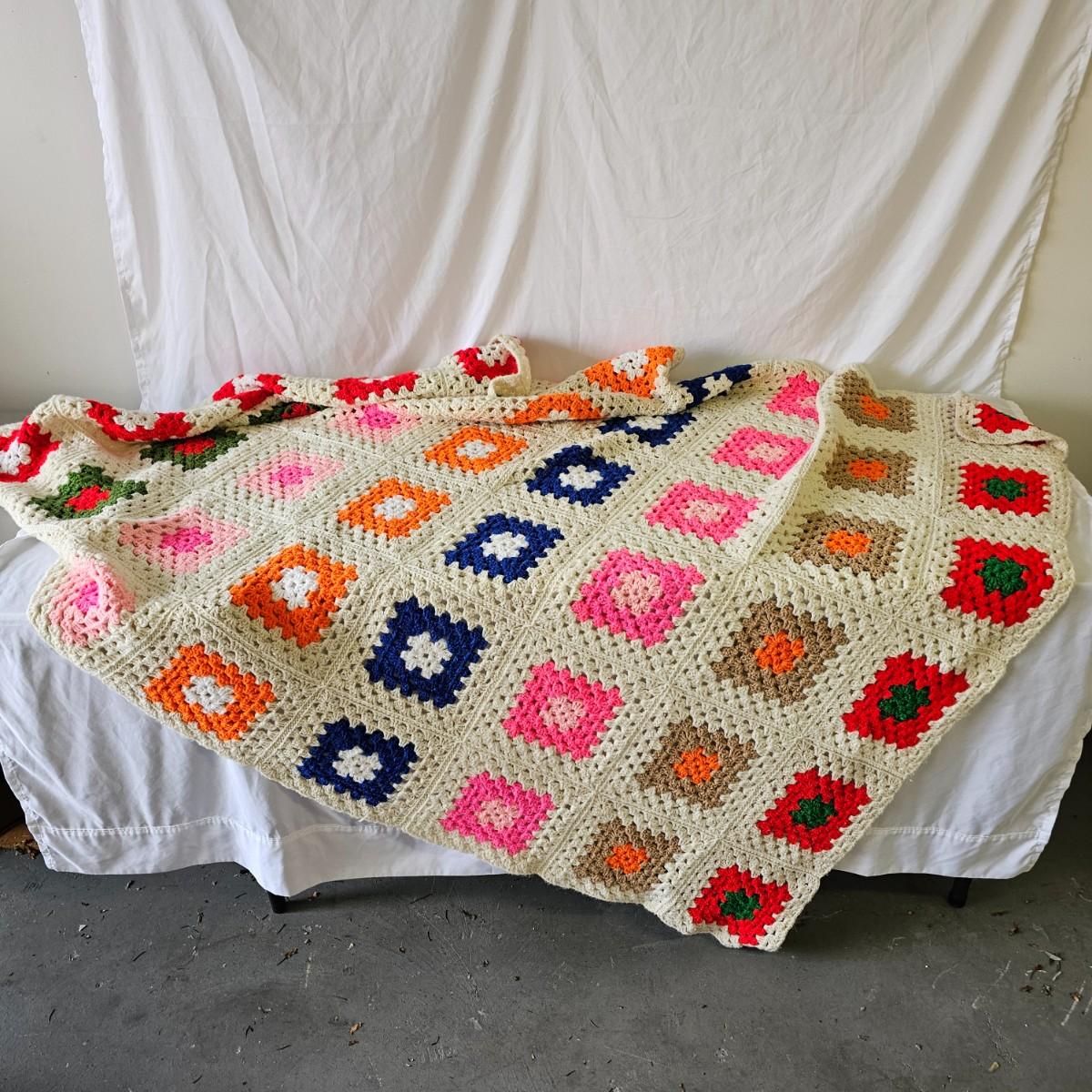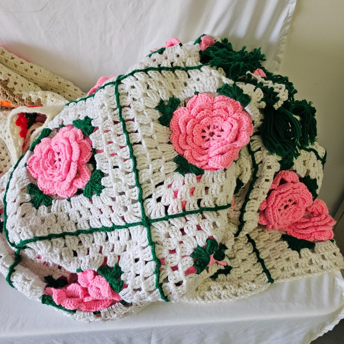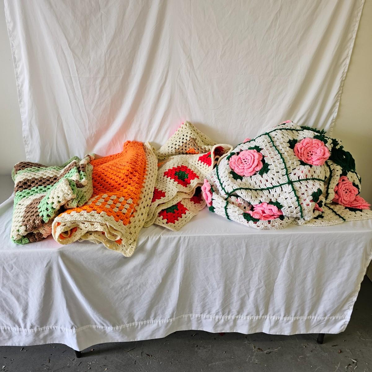 Four multicolored knit afghans, all different styles and sizes. Brown/green piece is 52" x 58". Orange piece is 54" x 62". Pink/red/blue item is 52" x 68". Pink flowers with green fringe measures 90" x 96", could serve as a bedspread. One flower has minor tears in center. See photos for details. Shipping available.