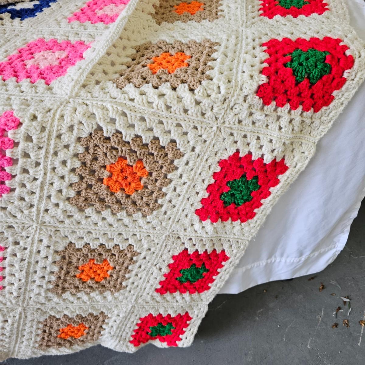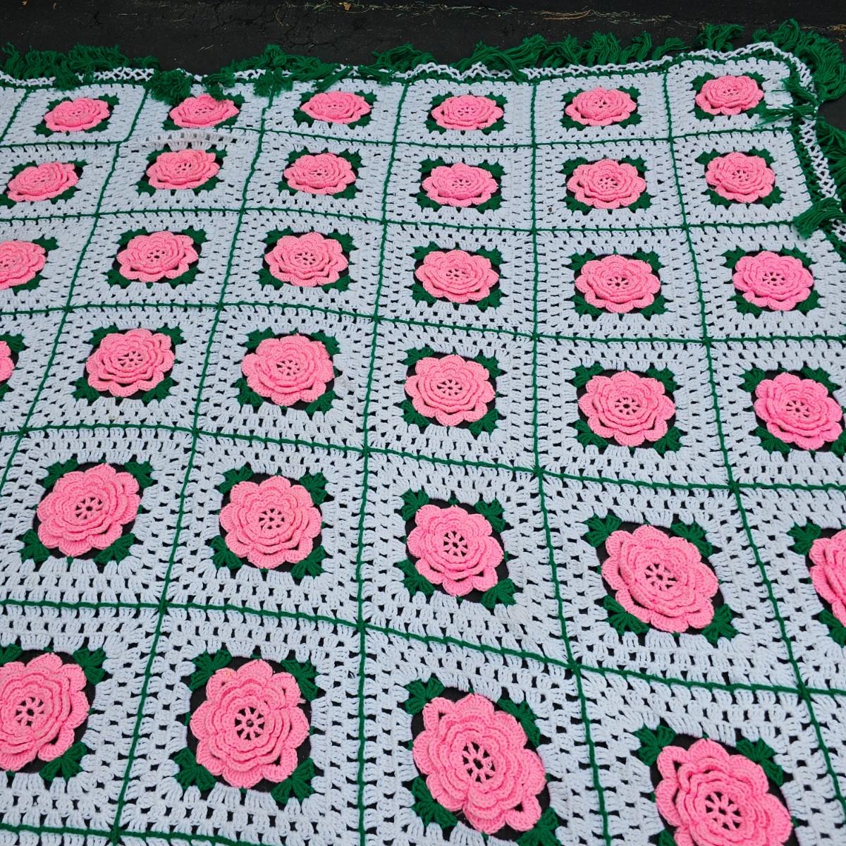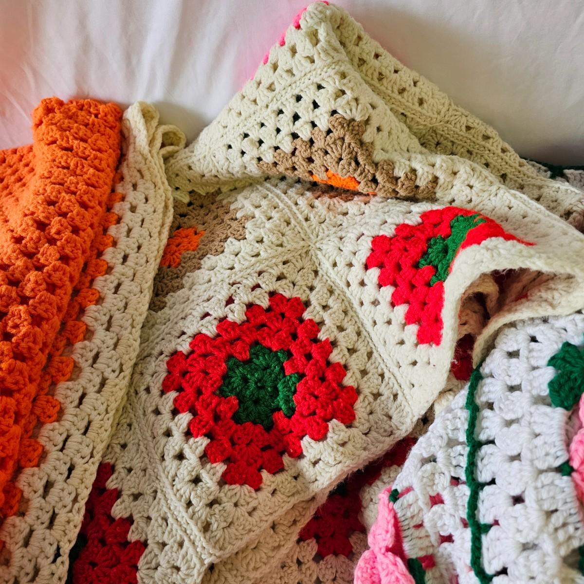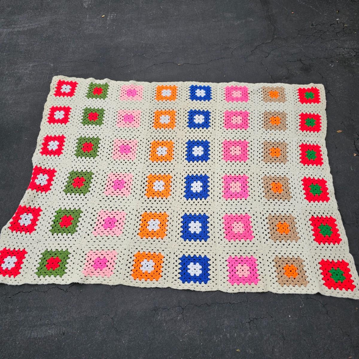 Four multicolored knit afghans, all different styles and sizes. Brown/green piece is 52" x 58". Orange piece is 54" x 62". Pink/red/blue item is 52" x 68". Pink flowers with green fringe measures 90" x 96", could serve as a bedspread. One flower has minor tears in center. See photos for details. Shipping available.