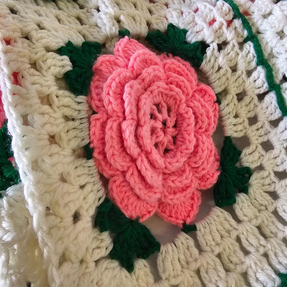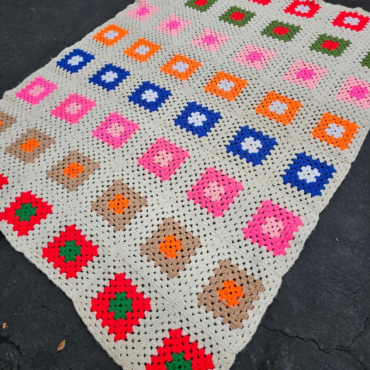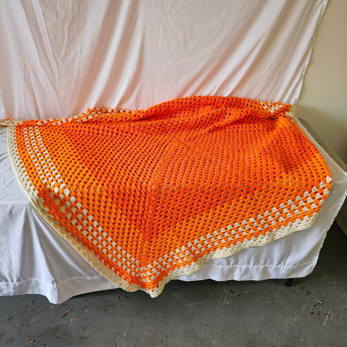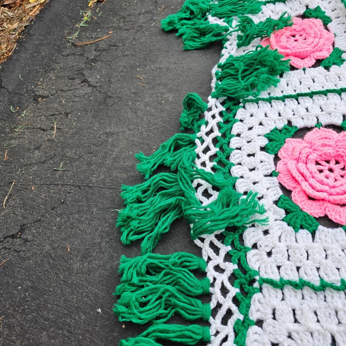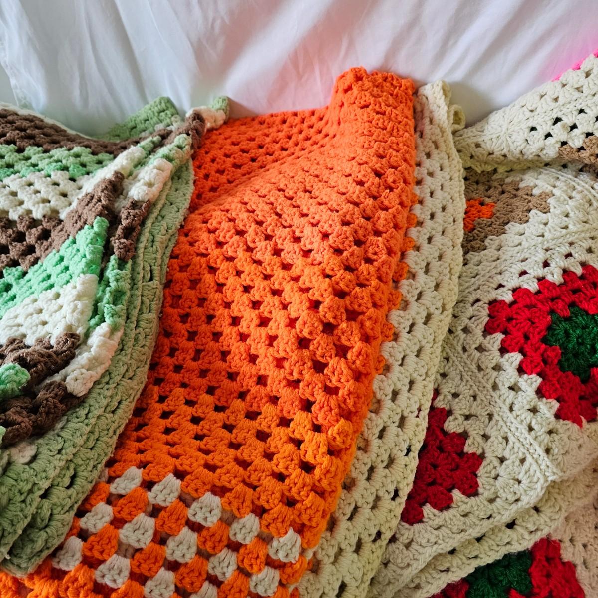 Four multicolored knit afghans, all different styles and sizes. Brown/green piece is 52" x 58". Orange piece is 54" x 62". Pink/red/blue item is 52" x 68". Pink flowers with green fringe measures 90" x 96", could serve as a bedspread. One flower has minor tears in center. See photos for details. Shipping available.