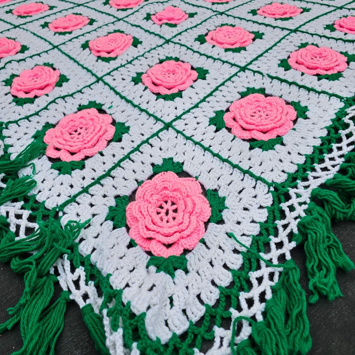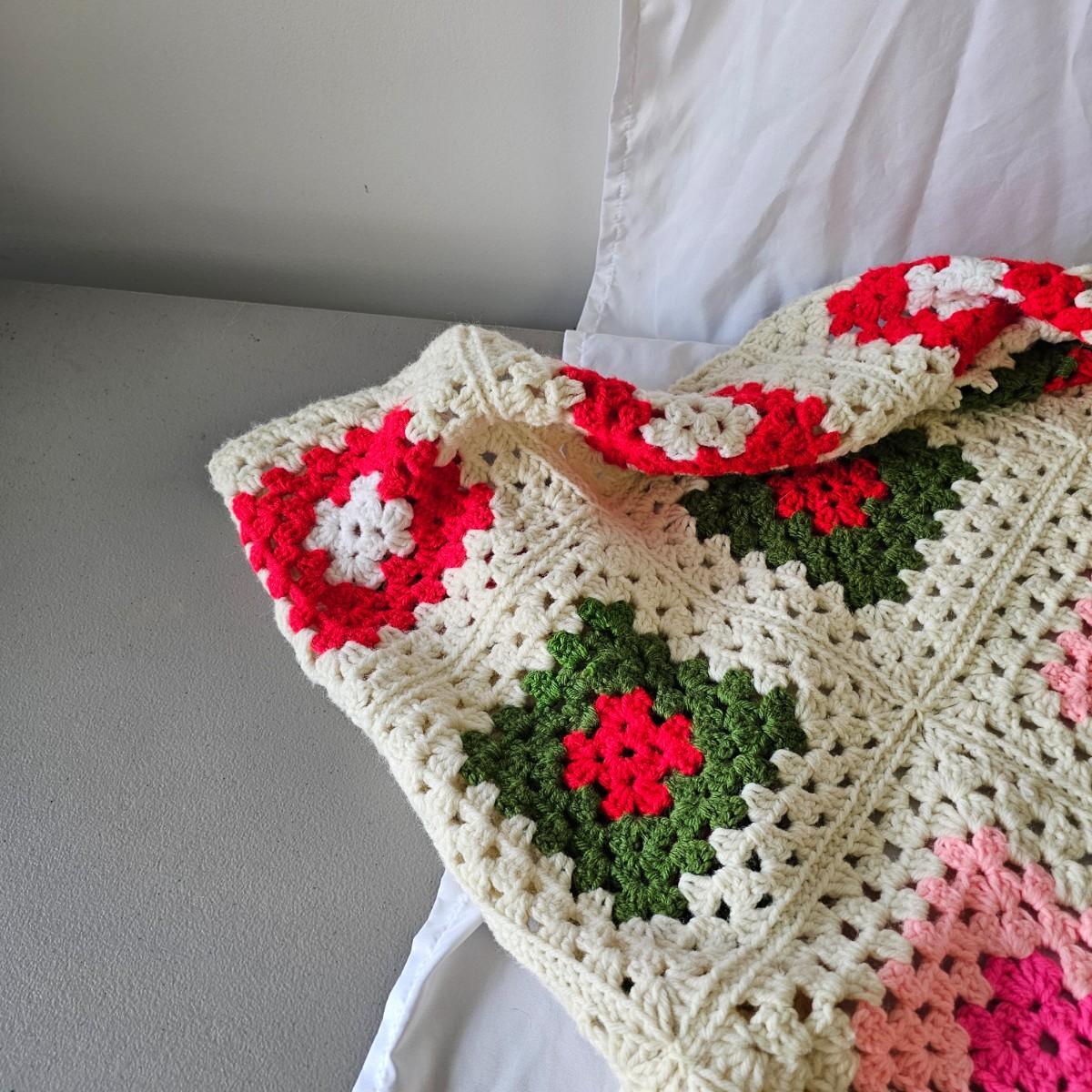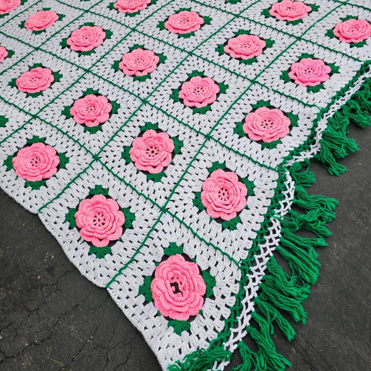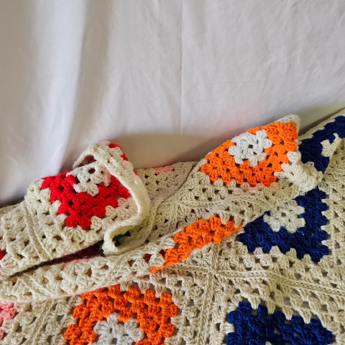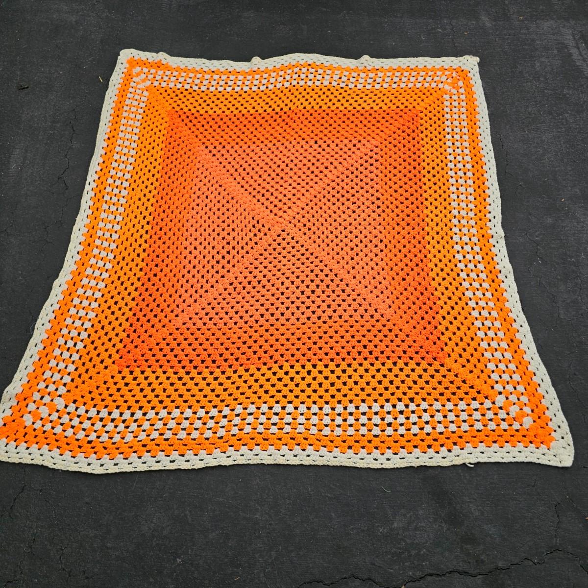 Four multicolored knit afghans, all different styles and sizes. Brown/green piece is 52" x 58". Orange piece is 54" x 62". Pink/red/blue item is 52" x 68". Pink flowers with green fringe measures 90" x 96", could serve as a bedspread. One flower has minor tears in center. See photos for details. Shipping available.