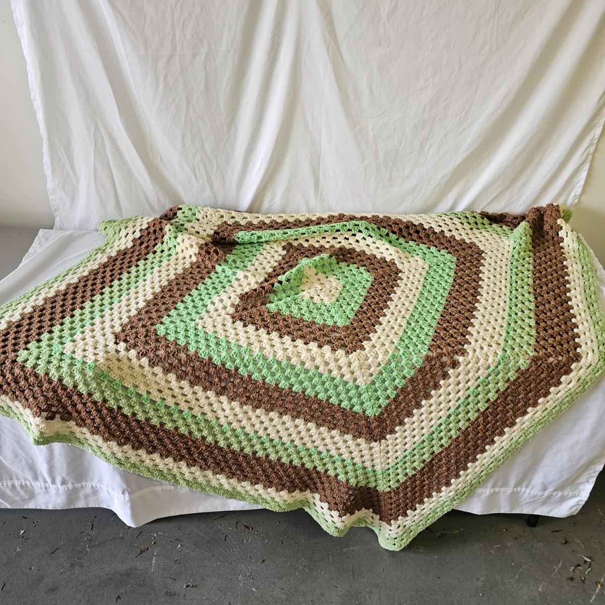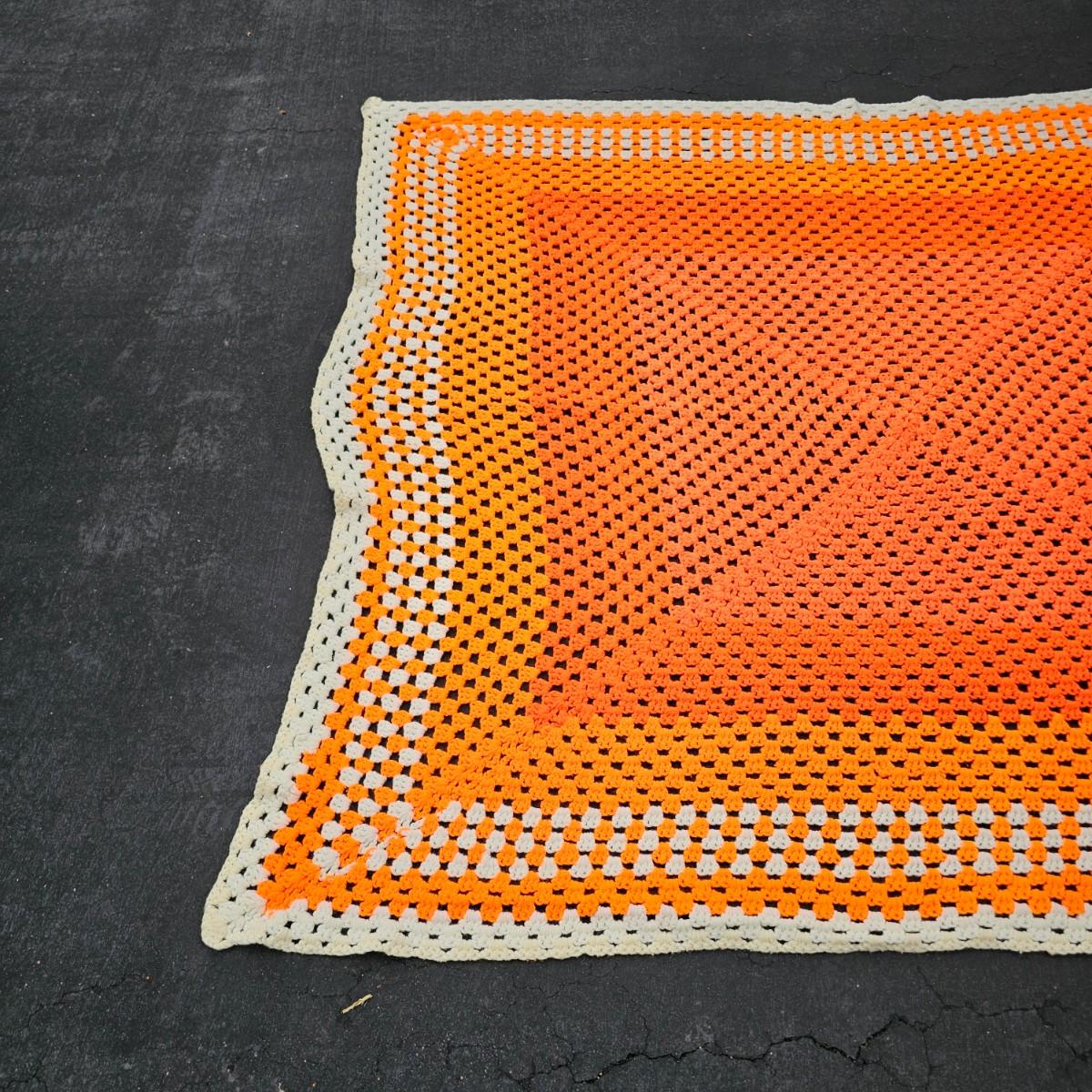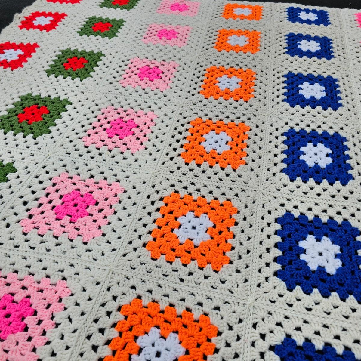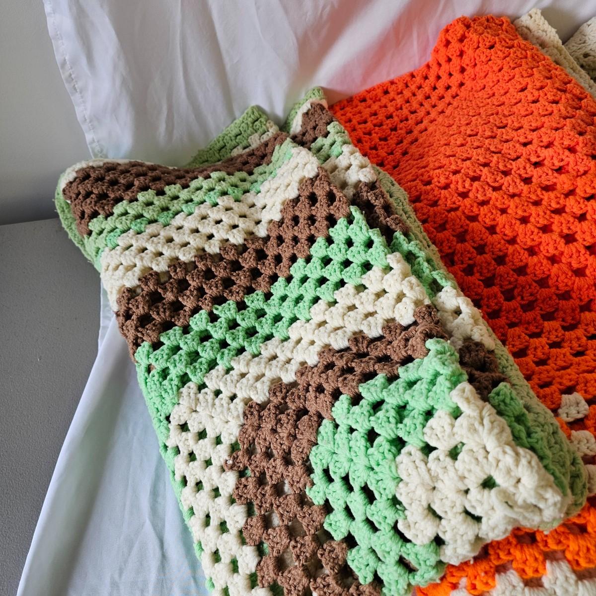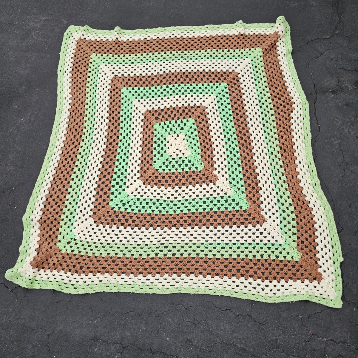 Four multicolored knit afghans, all different styles and sizes. Brown/green piece is 52" x 58". Orange piece is 54" x 62". Pink/red/blue item is 52" x 68". Pink flowers with green fringe measures 90" x 96", could serve as a bedspread. One flower has minor tears in center. See photos for details. Shipping available.
