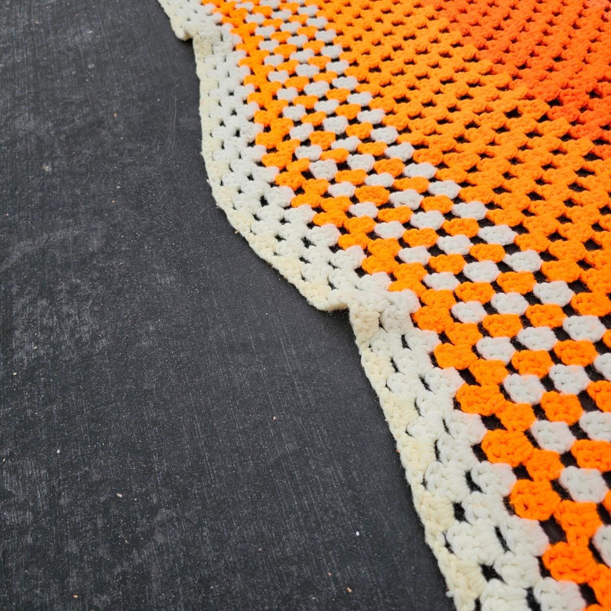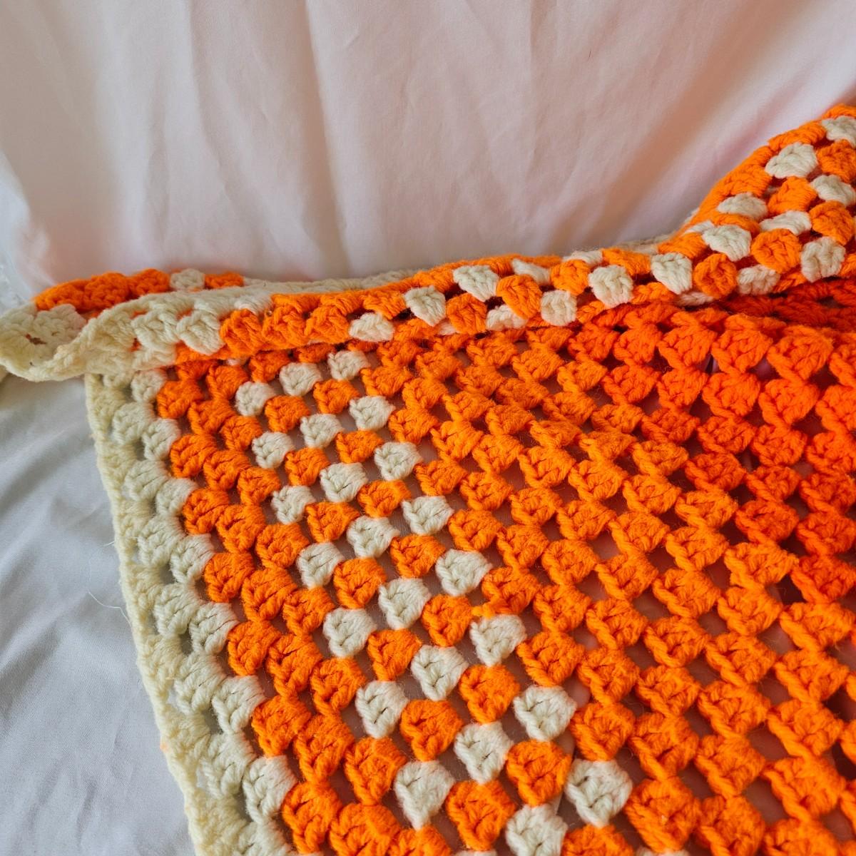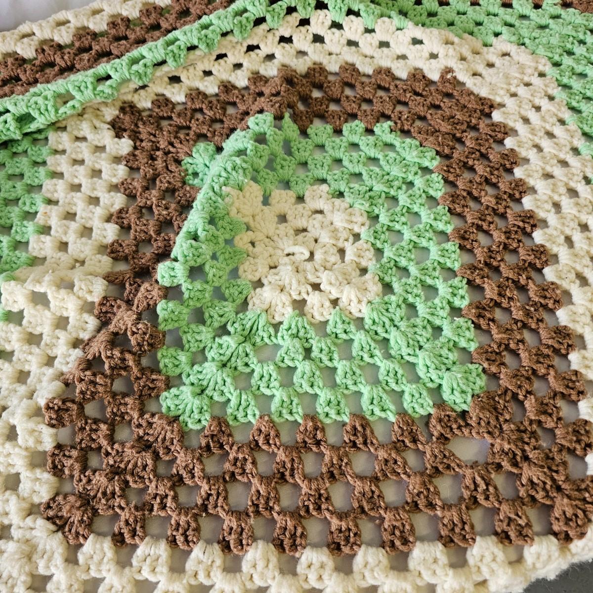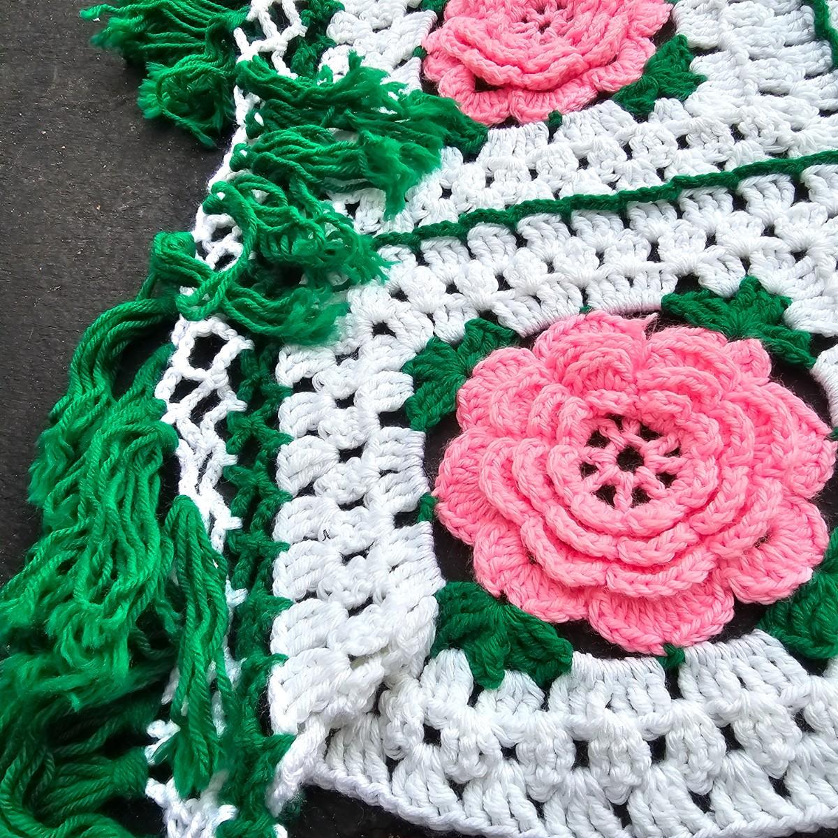 Four multicolored knit afghans, all different styles and sizes. Brown/green piece is 52" x 58". Orange piece is 54" x 62". Pink/red/blue item is 52" x 68". Pink flowers with green fringe measures 90" x 96", could serve as a bedspread. One flower has minor tears in center. See photos for details. Shipping available.
