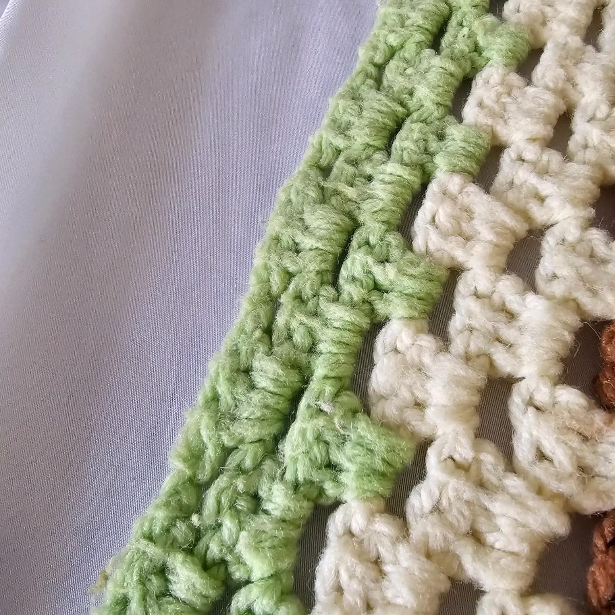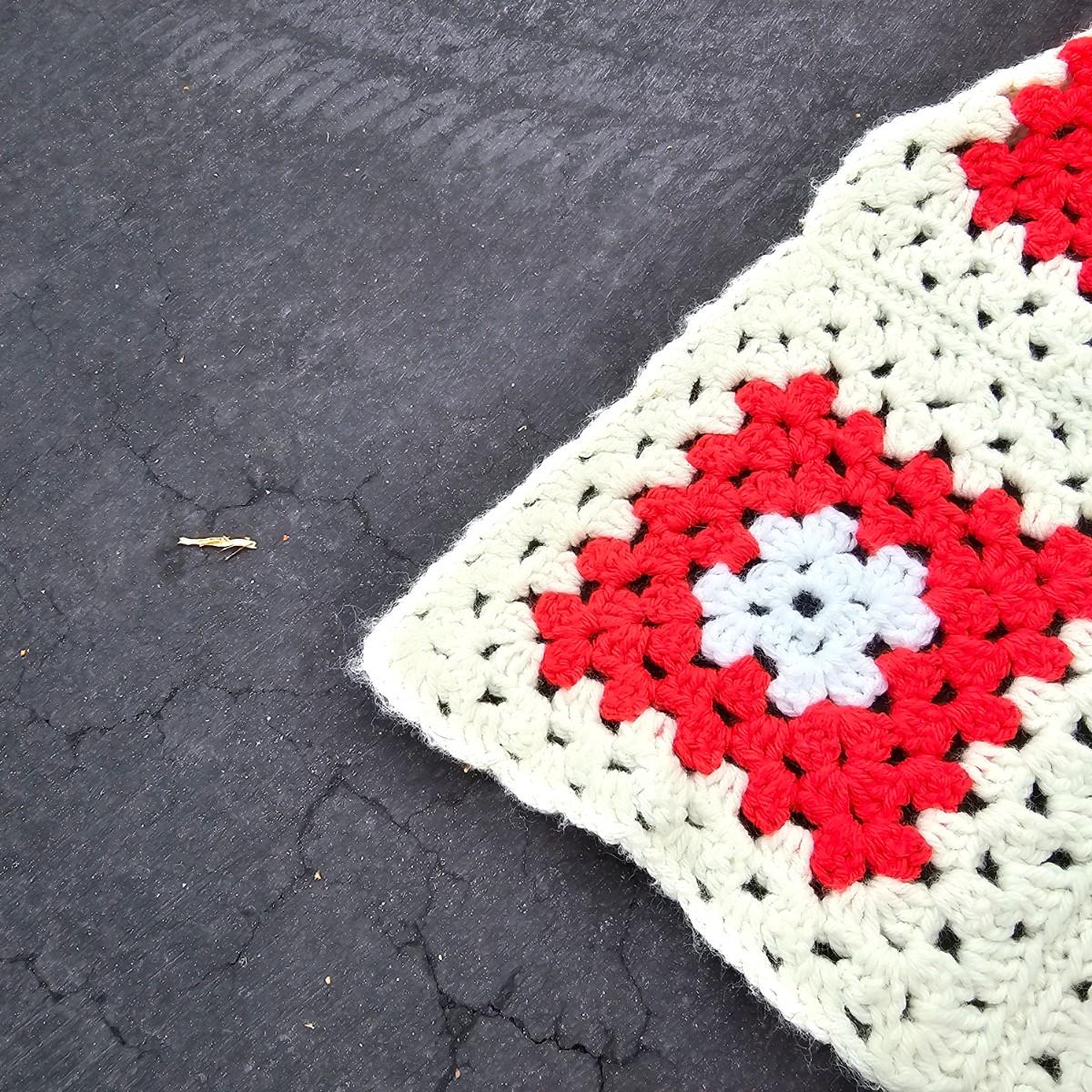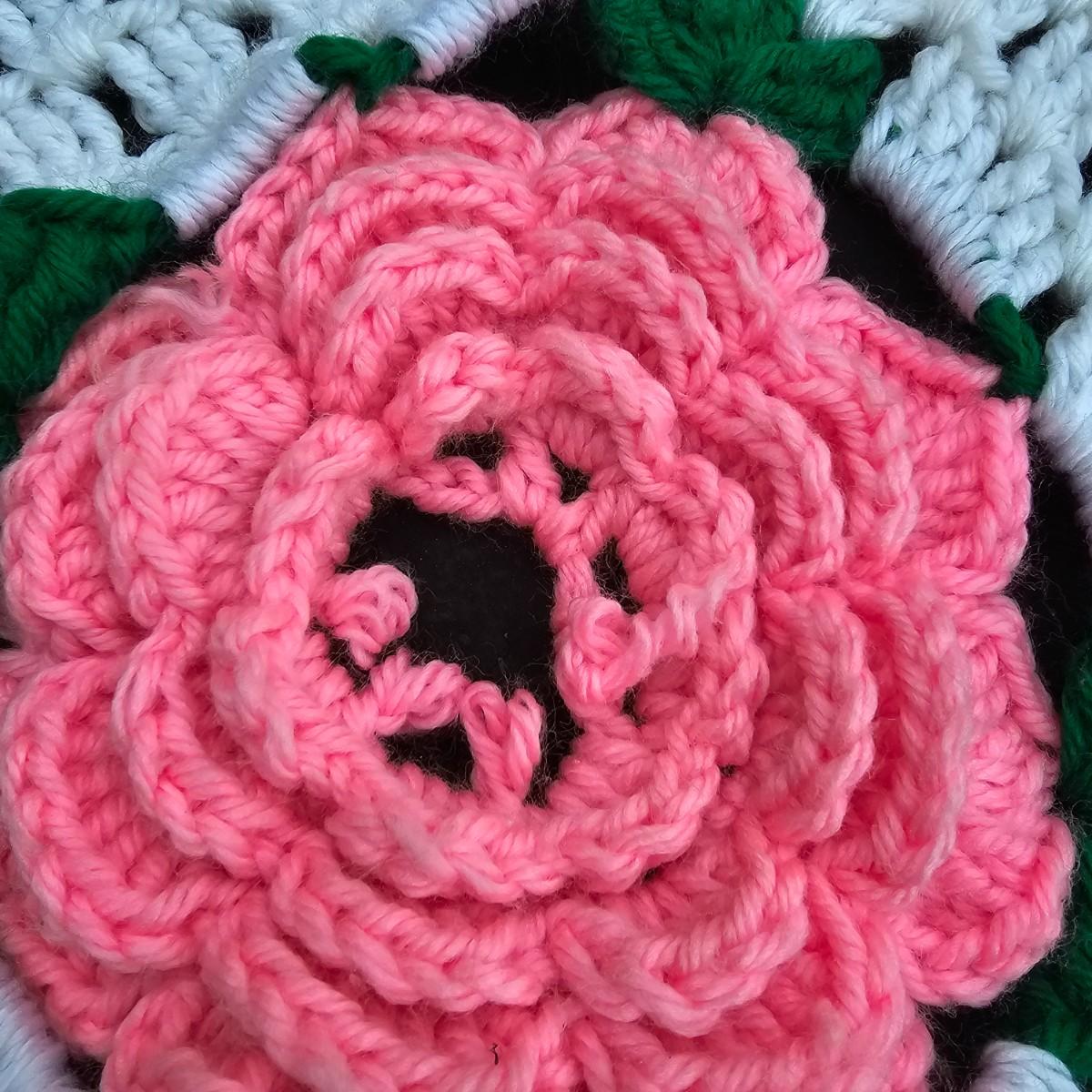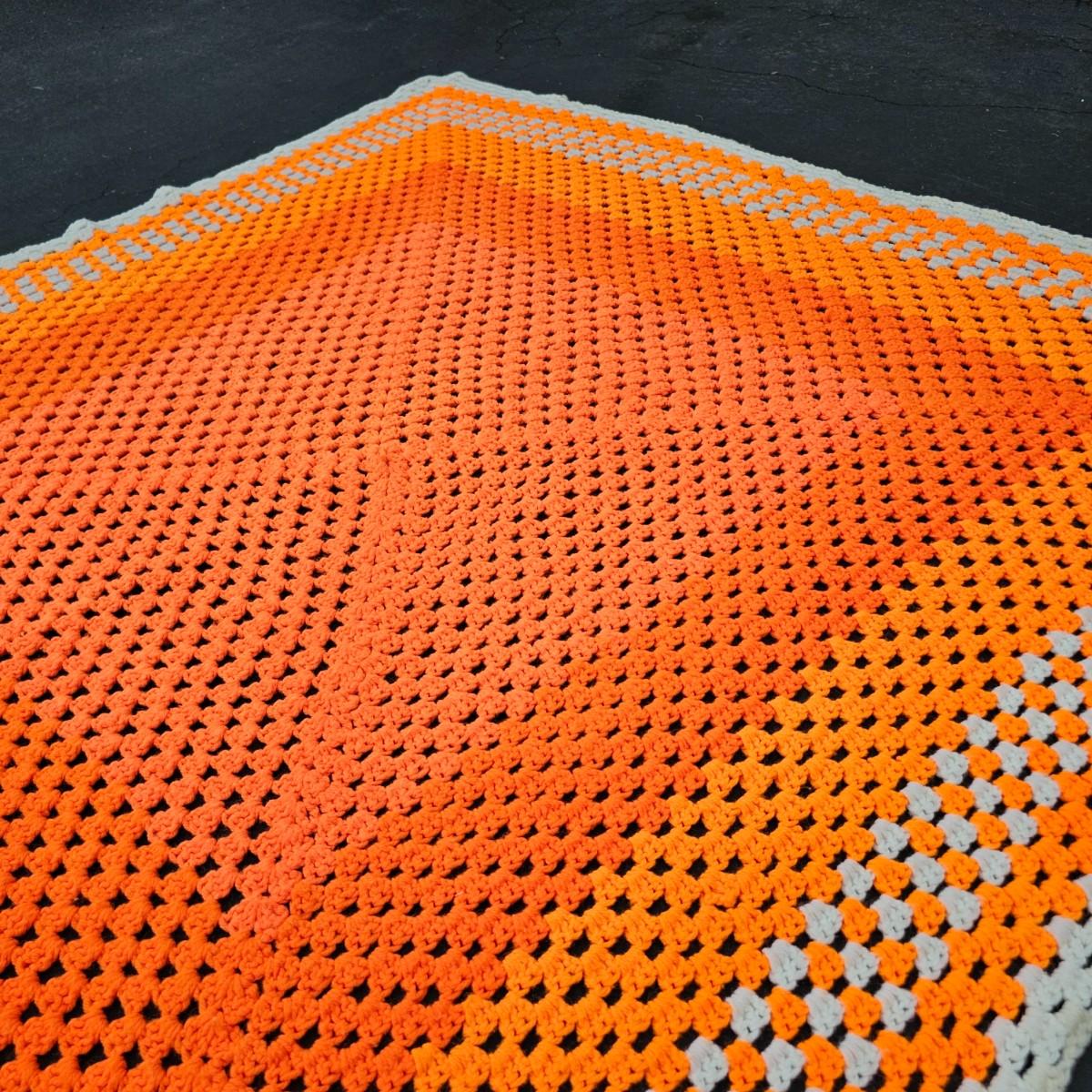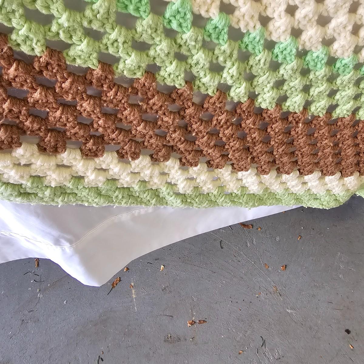 Four multicolored knit afghans, all different styles and sizes. Brown/green piece is 52" x 58". Orange piece is 54" x 62". Pink/red/blue item is 52" x 68". Pink flowers with green fringe measures 90" x 96", could serve as a bedspread. One flower has minor tears in center. See photos for details. Shipping available.