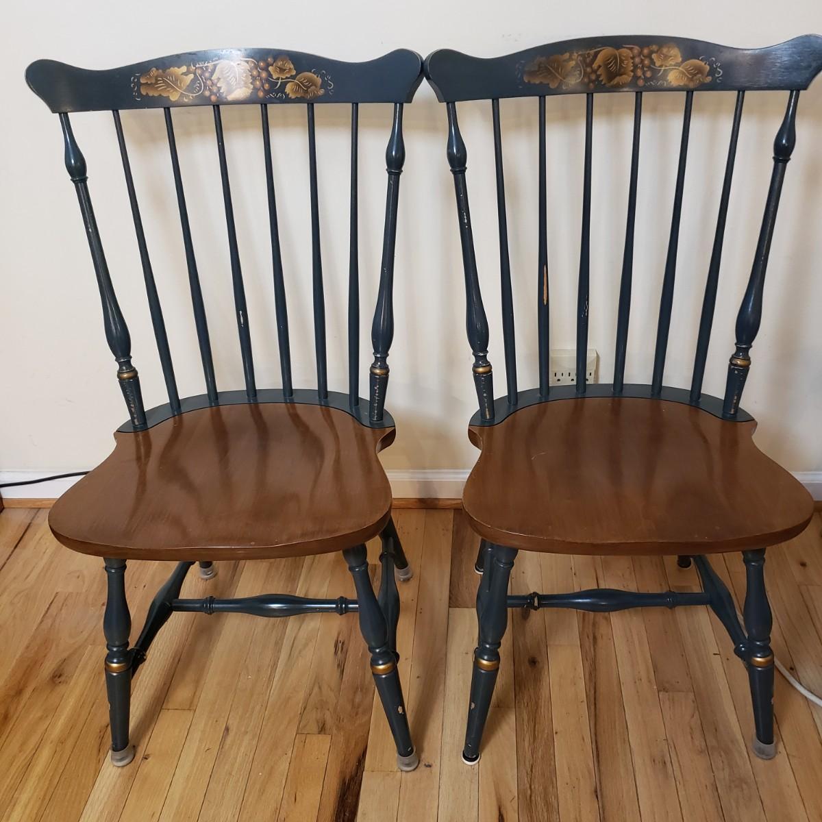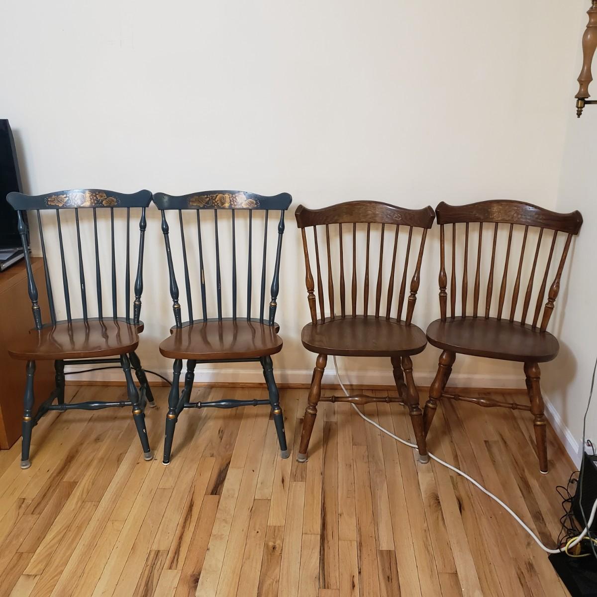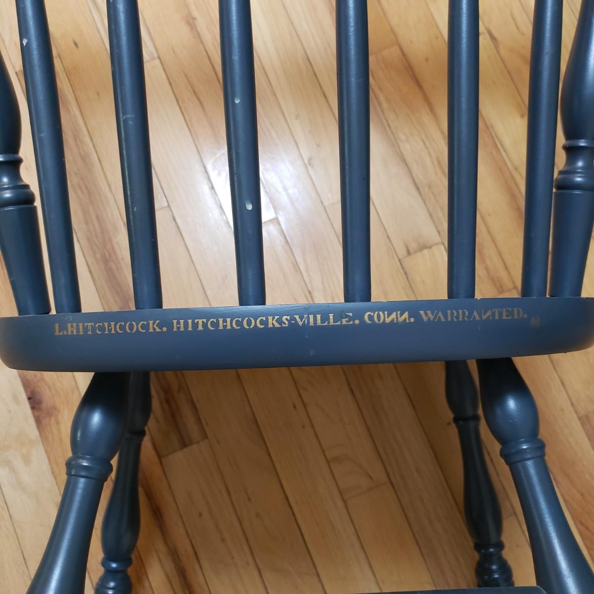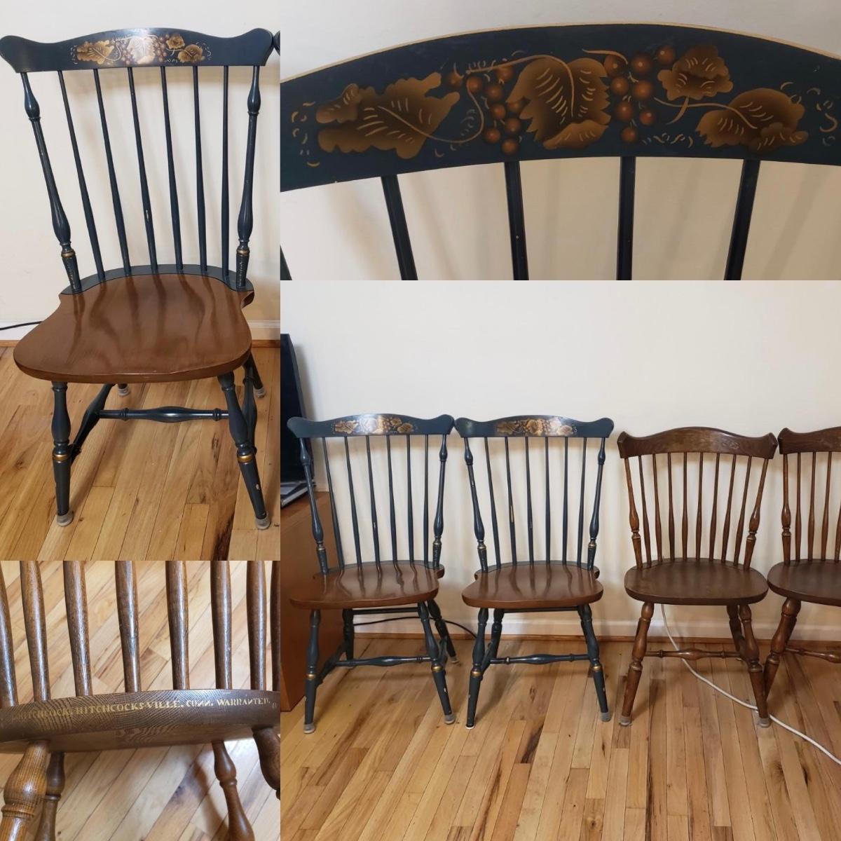 This lot features four L. Hitchcock chairs. The two matching green and wood chairs have a gold leaf design on the top. The green chairs measure 17" x 16" x 37"H. The seat height is 18". There is some paint off the green part, see picture. The all wood matching chairs also feature a leaf design. These chairs measure 18"x 16" x 36"H. The seat height is 18"