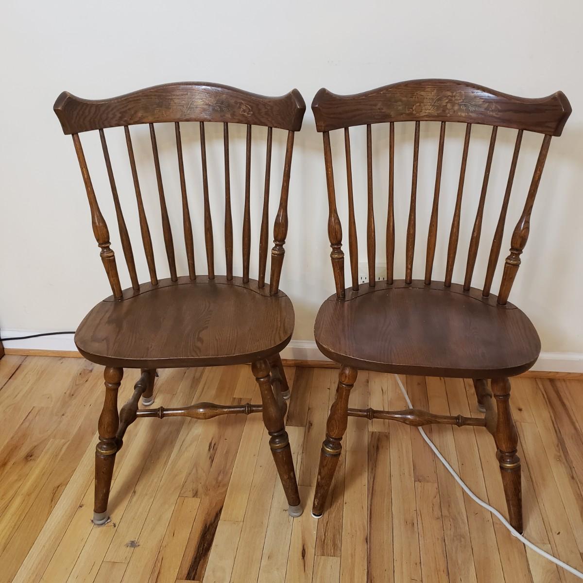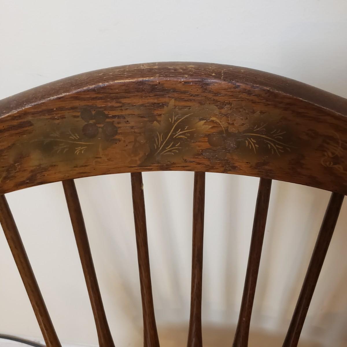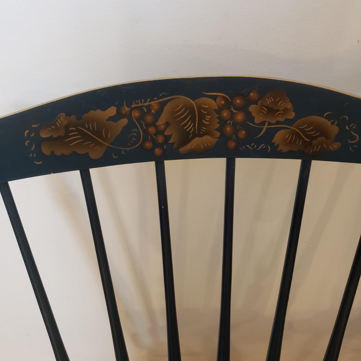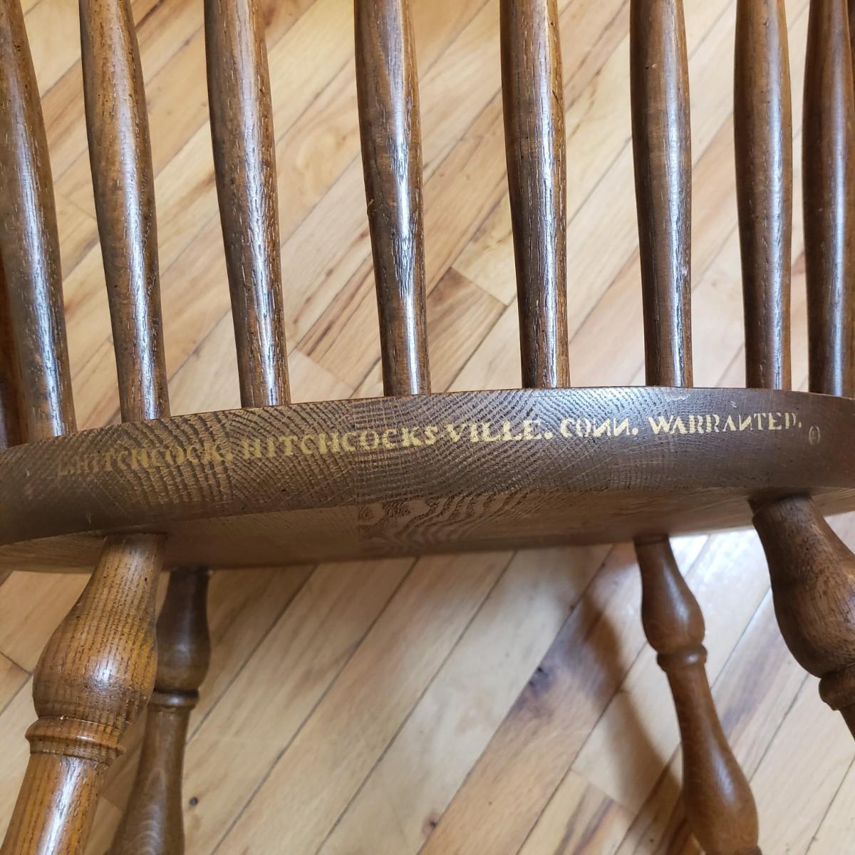 This lot features four L. Hitchcock chairs. The two matching green and wood chairs have a gold leaf design on the top. The green chairs measure 17" x 16" x 37"H. The seat height is 18". There is some paint off the green part, see picture. The all wood matching chairs also feature a leaf design. These chairs measure 18"x 16" x 36"H. The seat height is 18"
