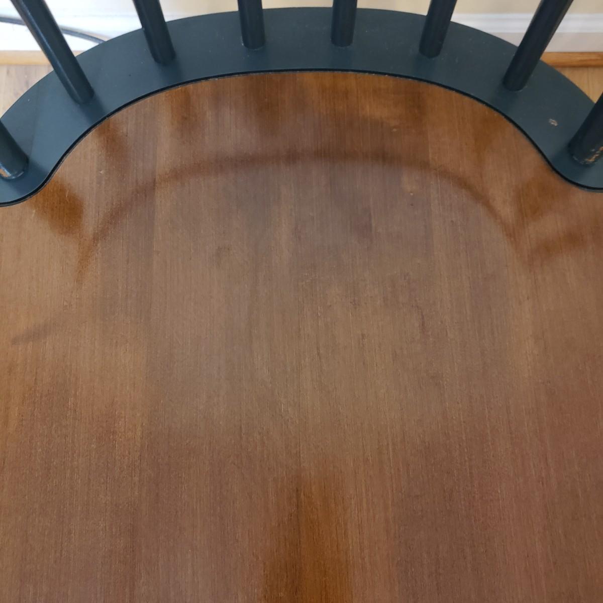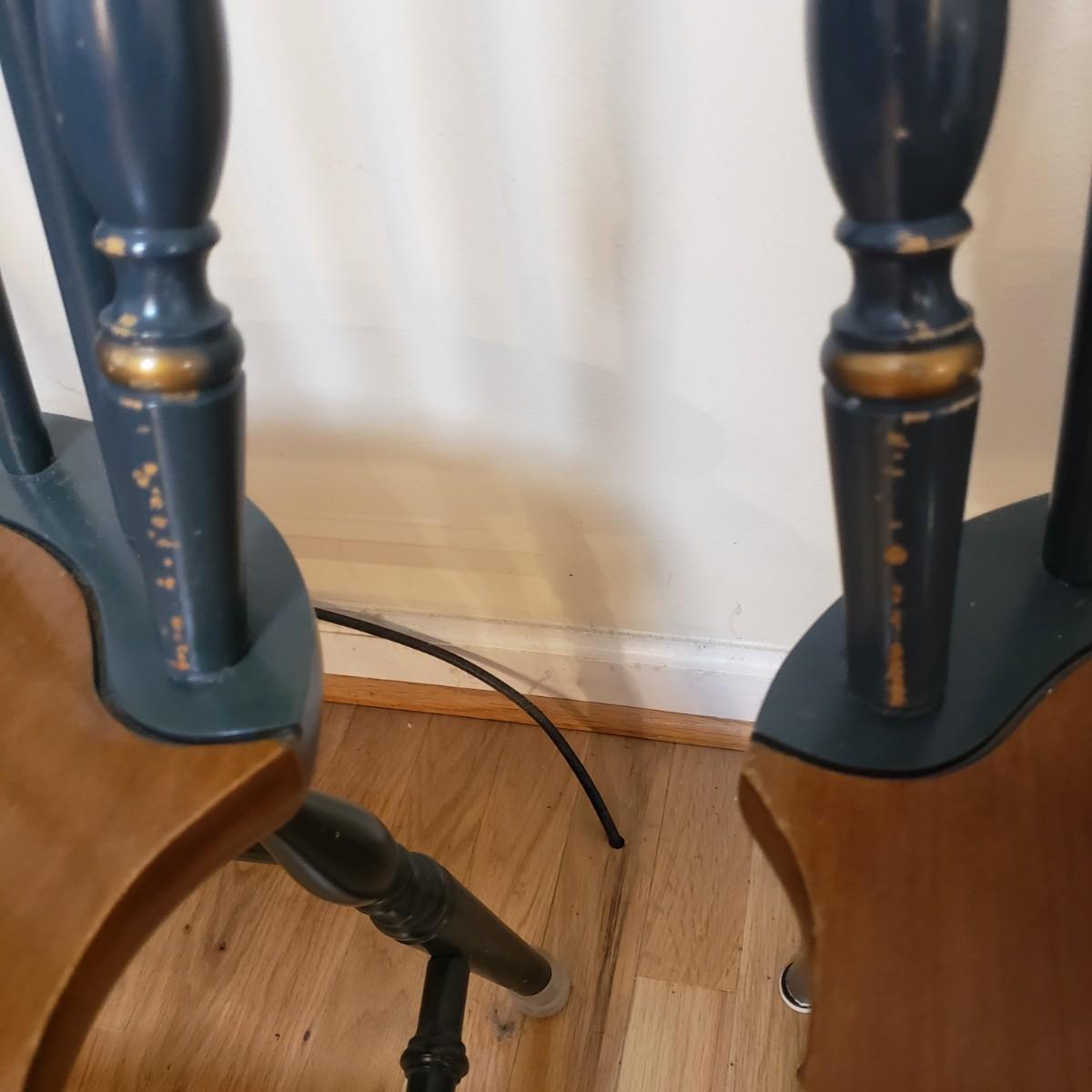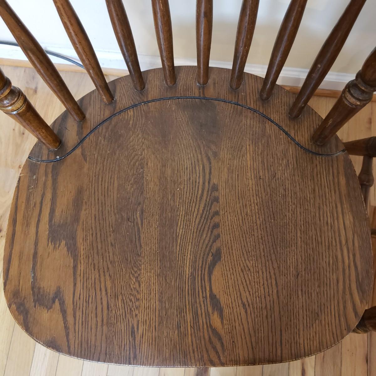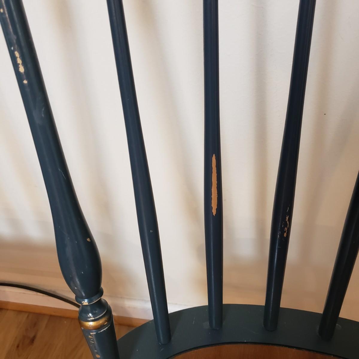 This lot features four L. Hitchcock chairs. The two matching green and wood chairs have a gold leaf design on the top. The green chairs measure 17" x 16" x 37"H. The seat height is 18". There is some paint off the green part, see picture. The all wood matching chairs also feature a leaf design. These chairs measure 18"x 16" x 36"H. The seat height is 18"