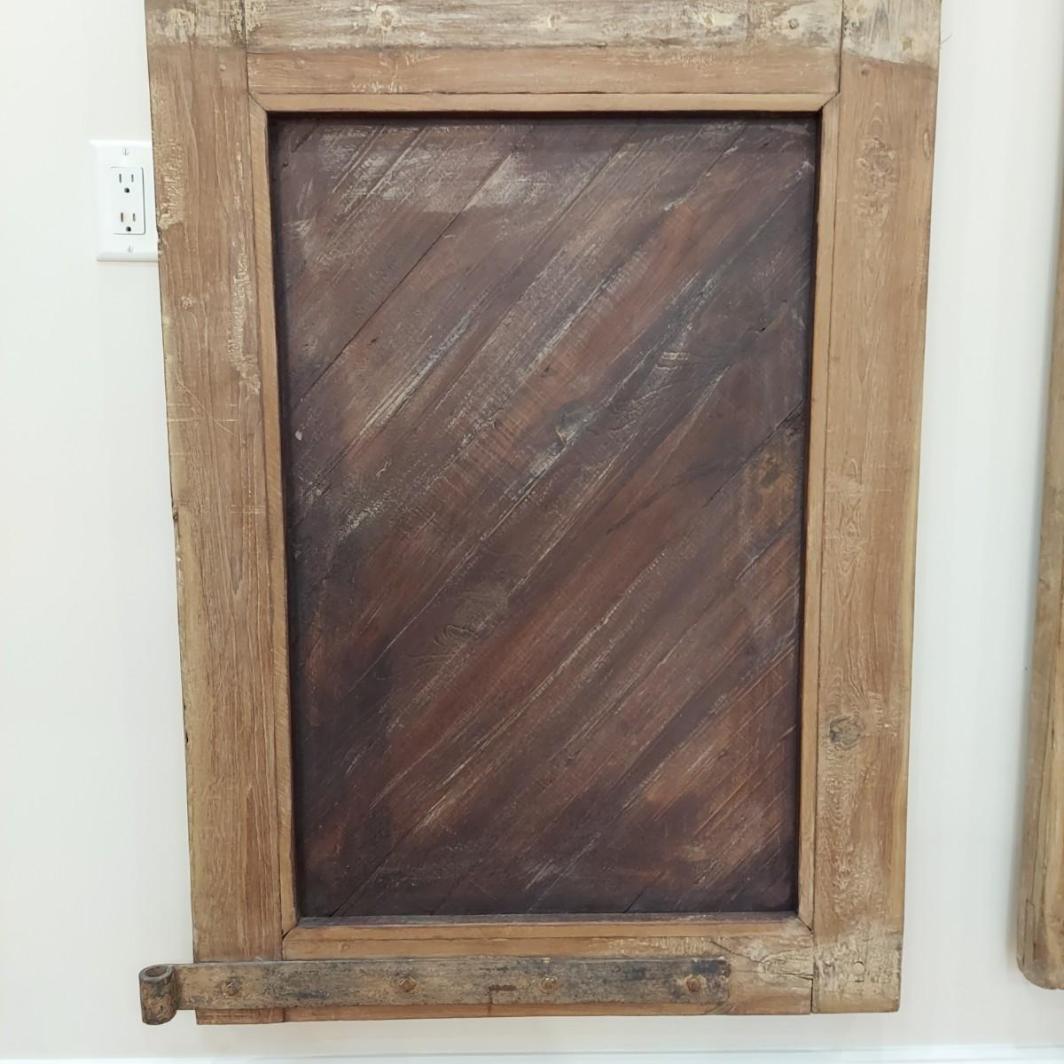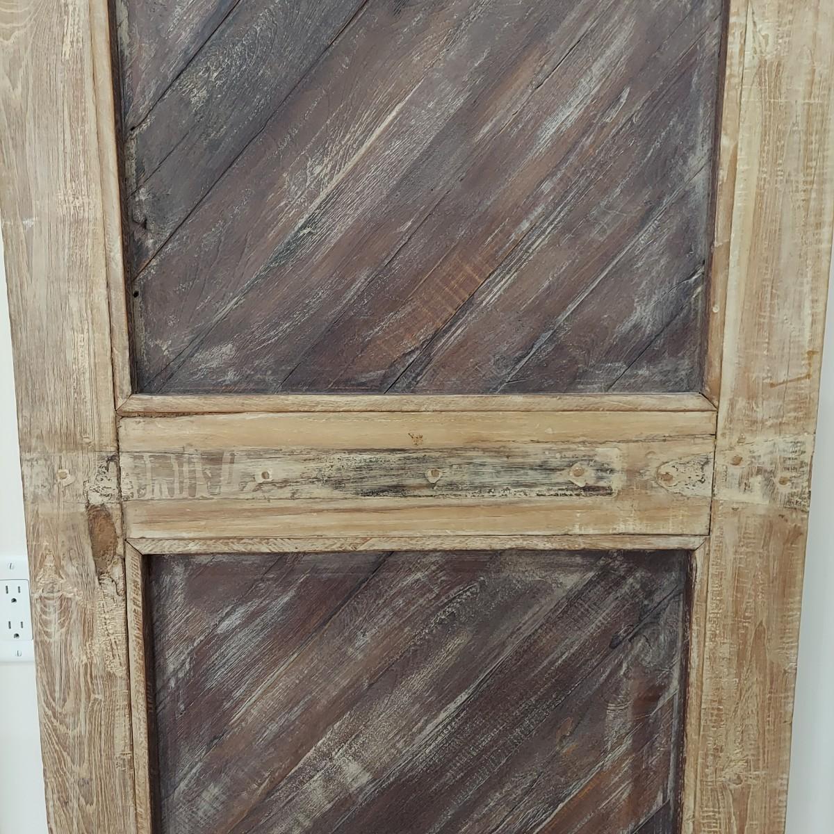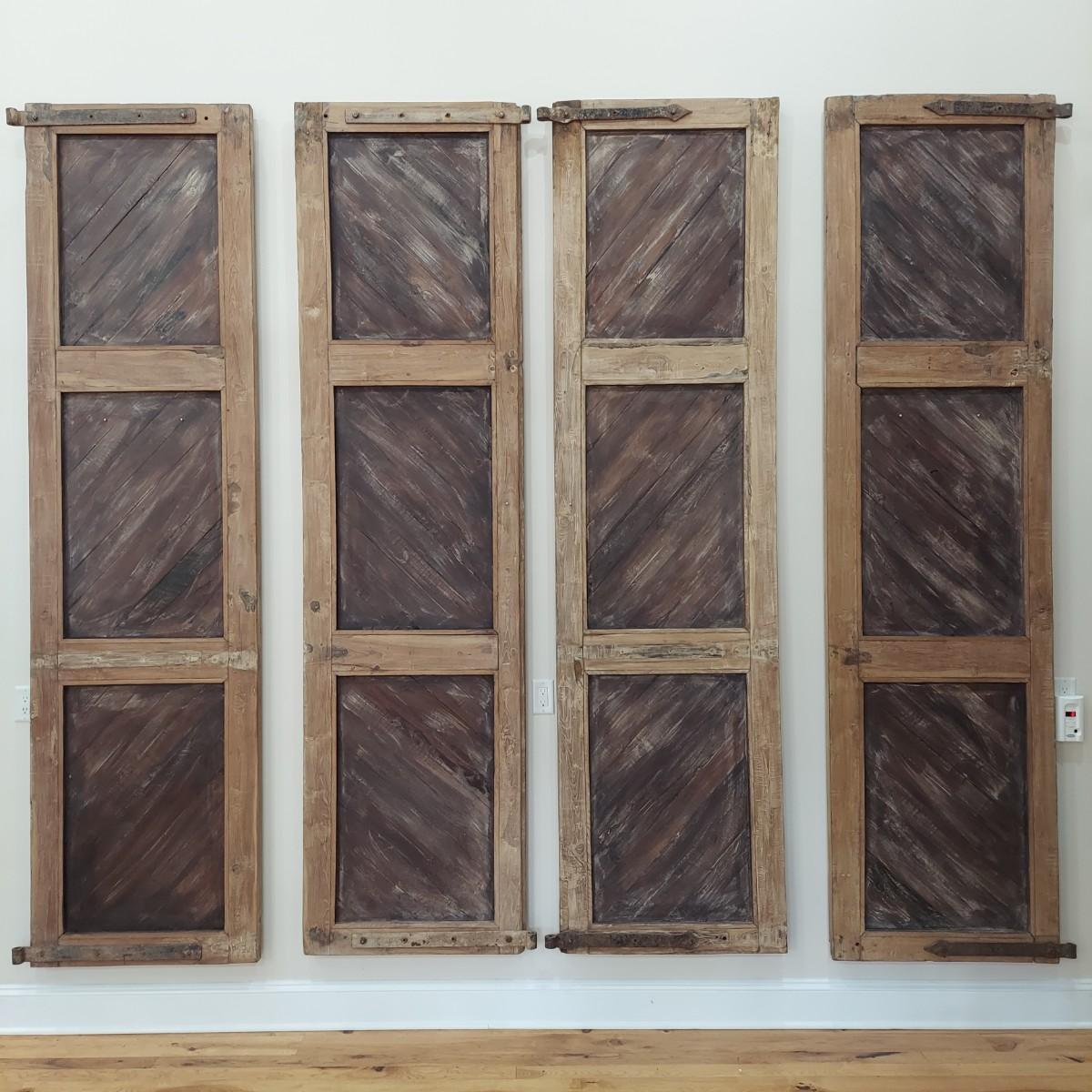 Lot of four wooden doors that have been used as wall decor. They are a rustic style with large metal hinges. Each door is approximately 32" x 2" x 113.5". There were previously some items hung from them and the screws are still visible (these Phillips head screws are not what is mounting the doors to the wall). The screws can likely be removed. Local Pickup Only. Winning bidder must bring assistance to help dismount, move and load these items due to their weight and/or size. They appear to be bolted to wood braces at the top and bottom. It would be a good idea to bring a variety of tools.