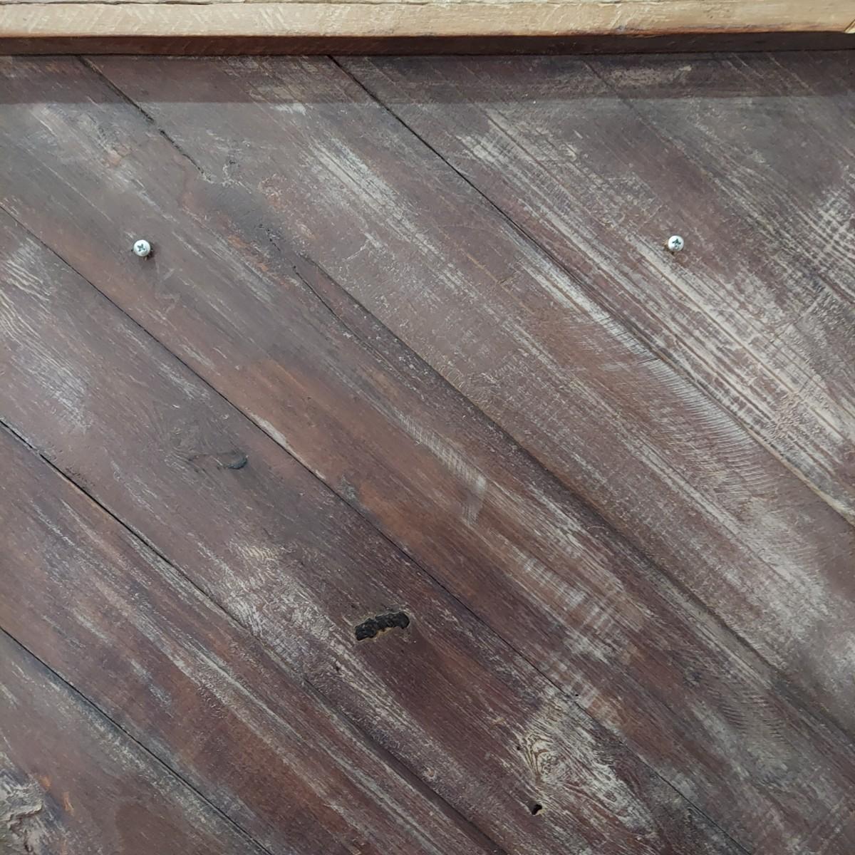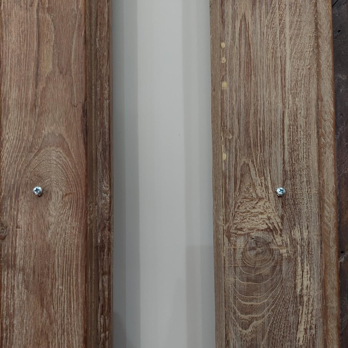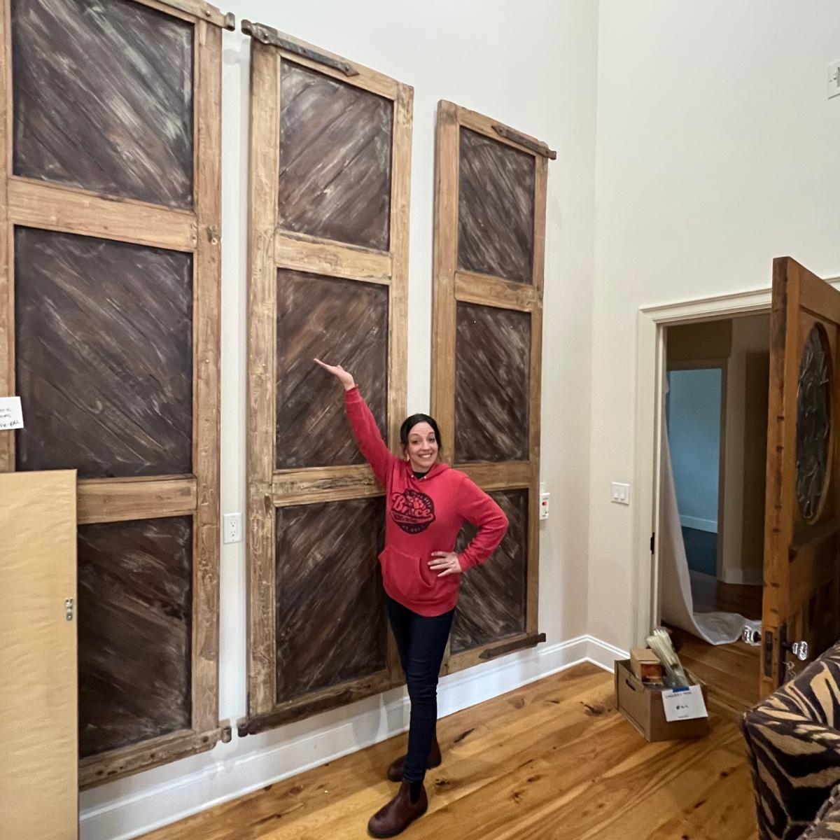 Lot of four wooden doors that have been used as wall decor. They are a rustic style with large metal hinges. Each door is approximately 32" x 2" x 113.5". There were previously some items hung from them and the screws are still visible (these Phillips head screws are not what is mounting the doors to the wall). The screws can likely be removed. Local Pickup Only. Winning bidder must bring assistance to help dismount, move and load these items due to their weight and/or size. They appear to be bolted to wood braces at the top and bottom. It would be a good idea to bring a variety of tools.