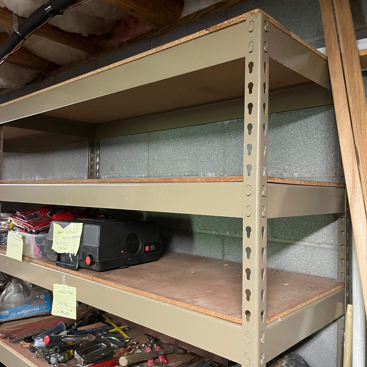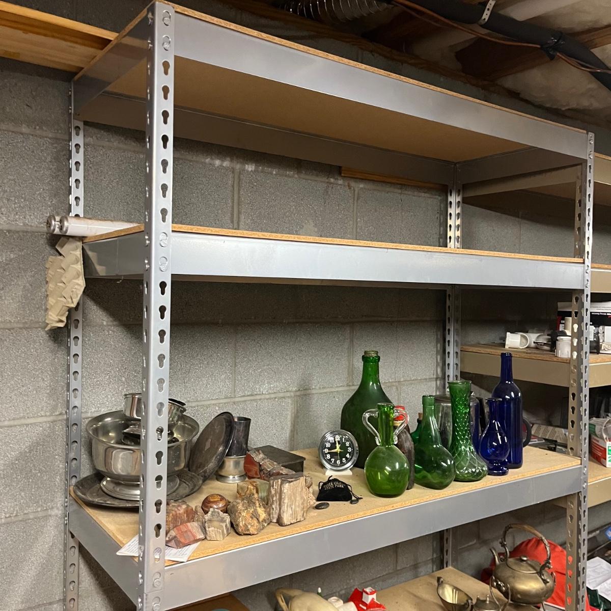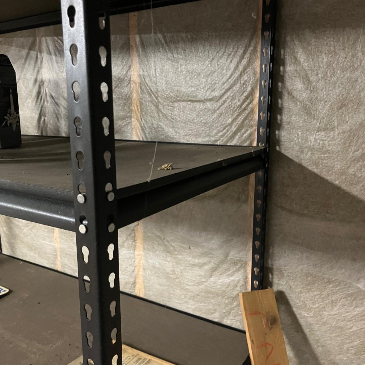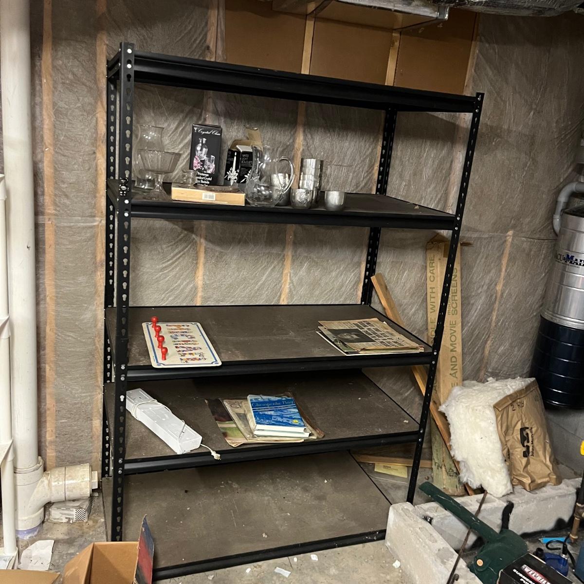 Lot contains four metal shelving units with removable and adjustable pressed wood shelves. Two units measure 18” x 48” x 83”, one measures 19” x 48” x 84”, and the black one measures 24” x 48” x 72”. Units break down for ease of transport. Contents of shelves are NOT included.