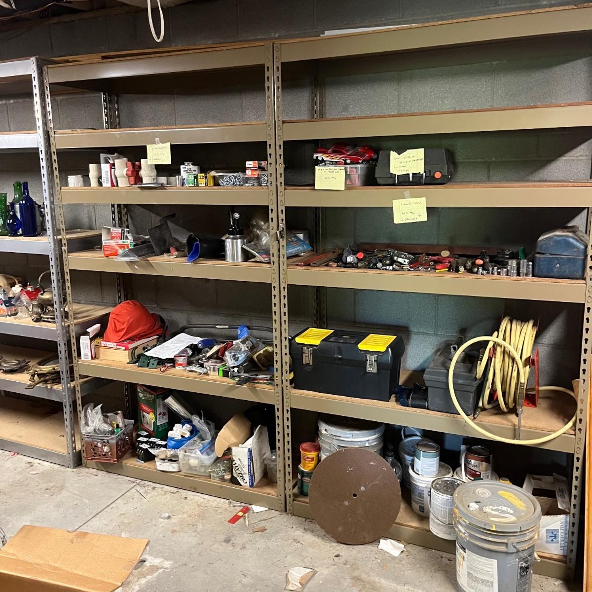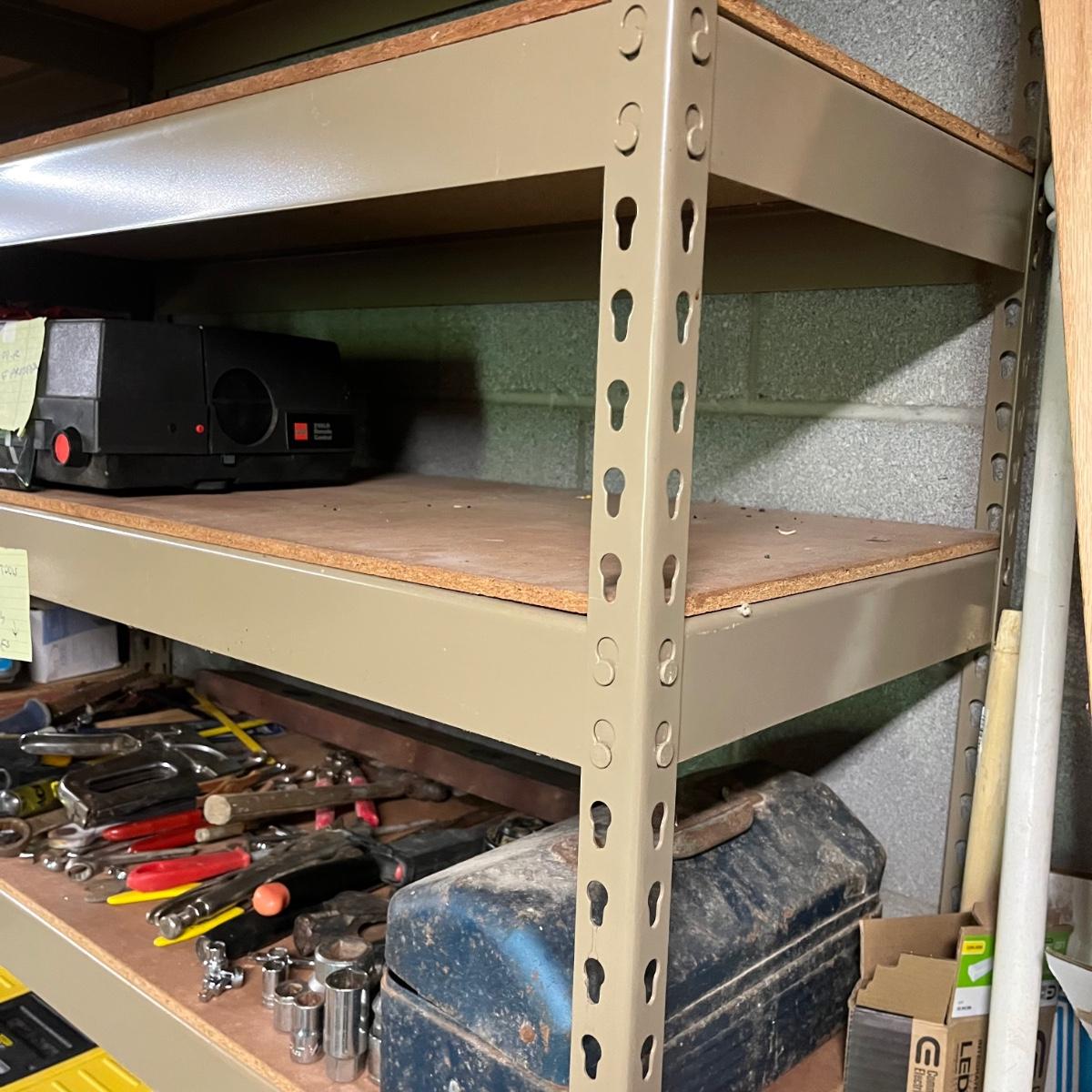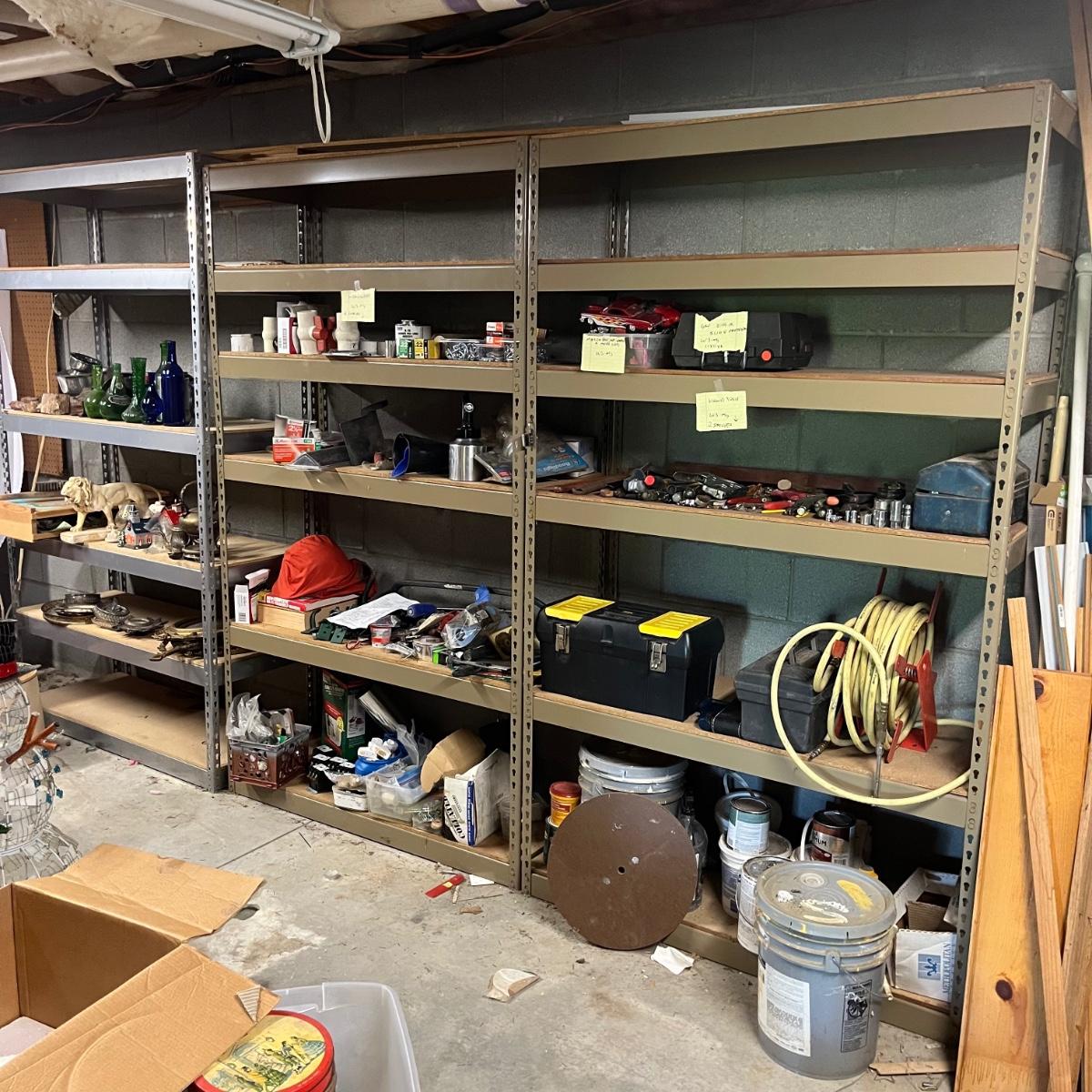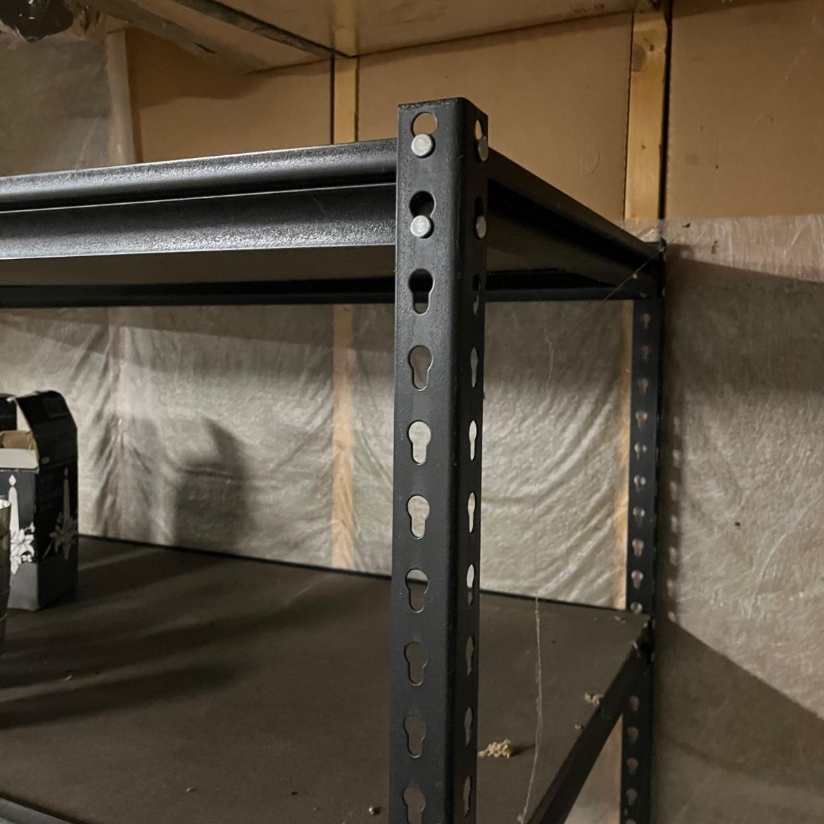 Lot contains four metal shelving units with removable and adjustable pressed wood shelves. Two units measure 18” x 48” x 83”, one measures 19” x 48” x 84”, and the black one measures 24” x 48” x 72”. Units break down for ease of transport. Contents of shelves are NOT included.