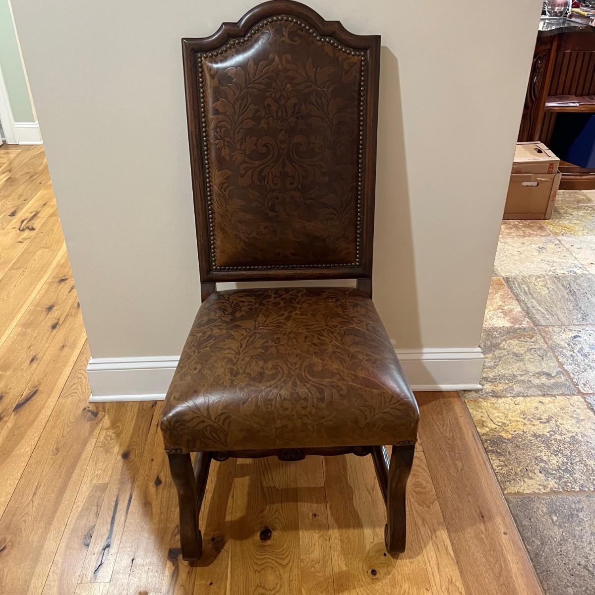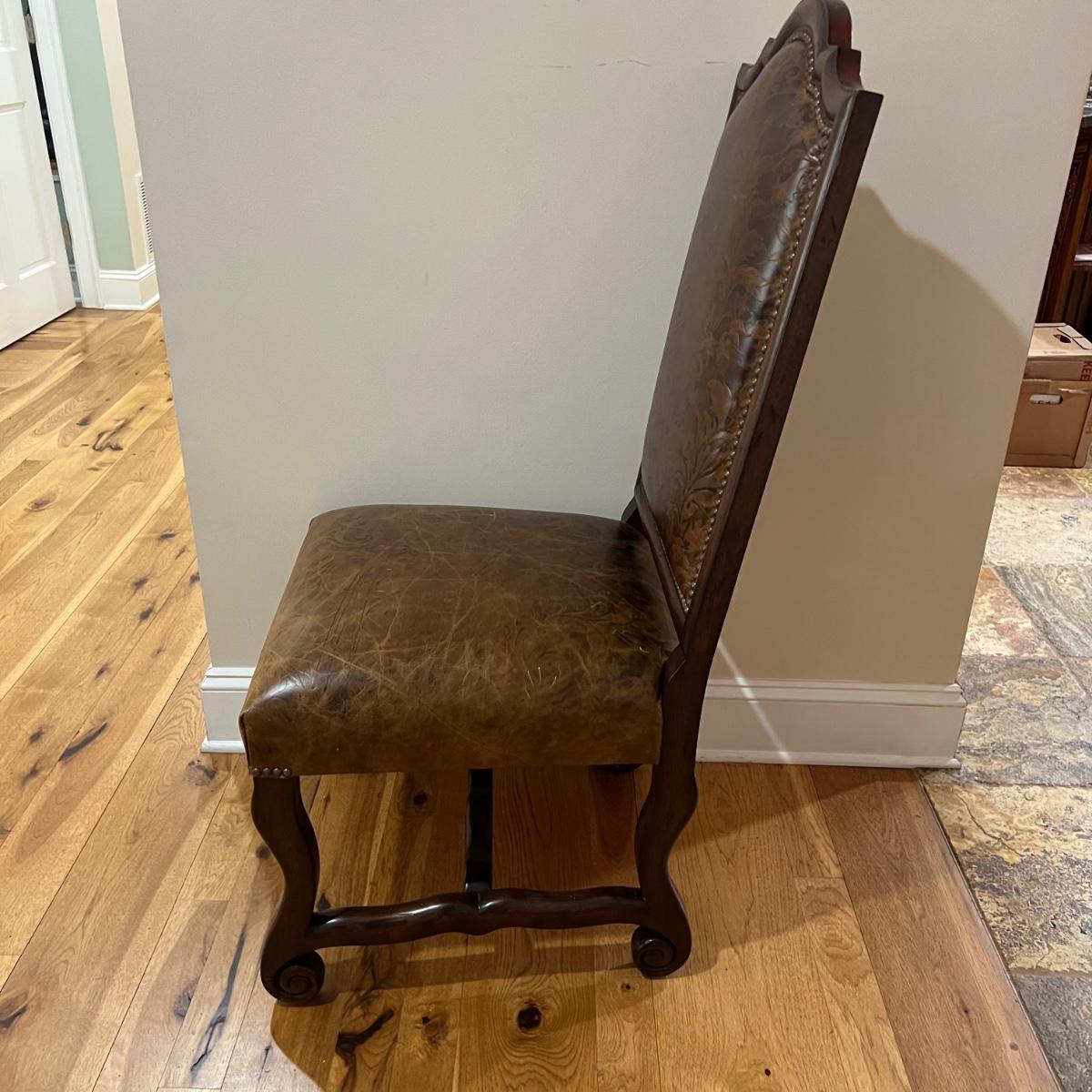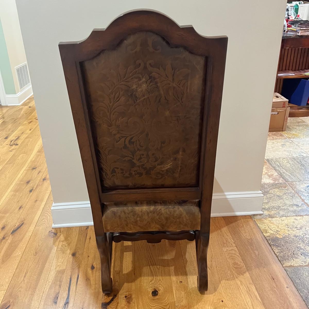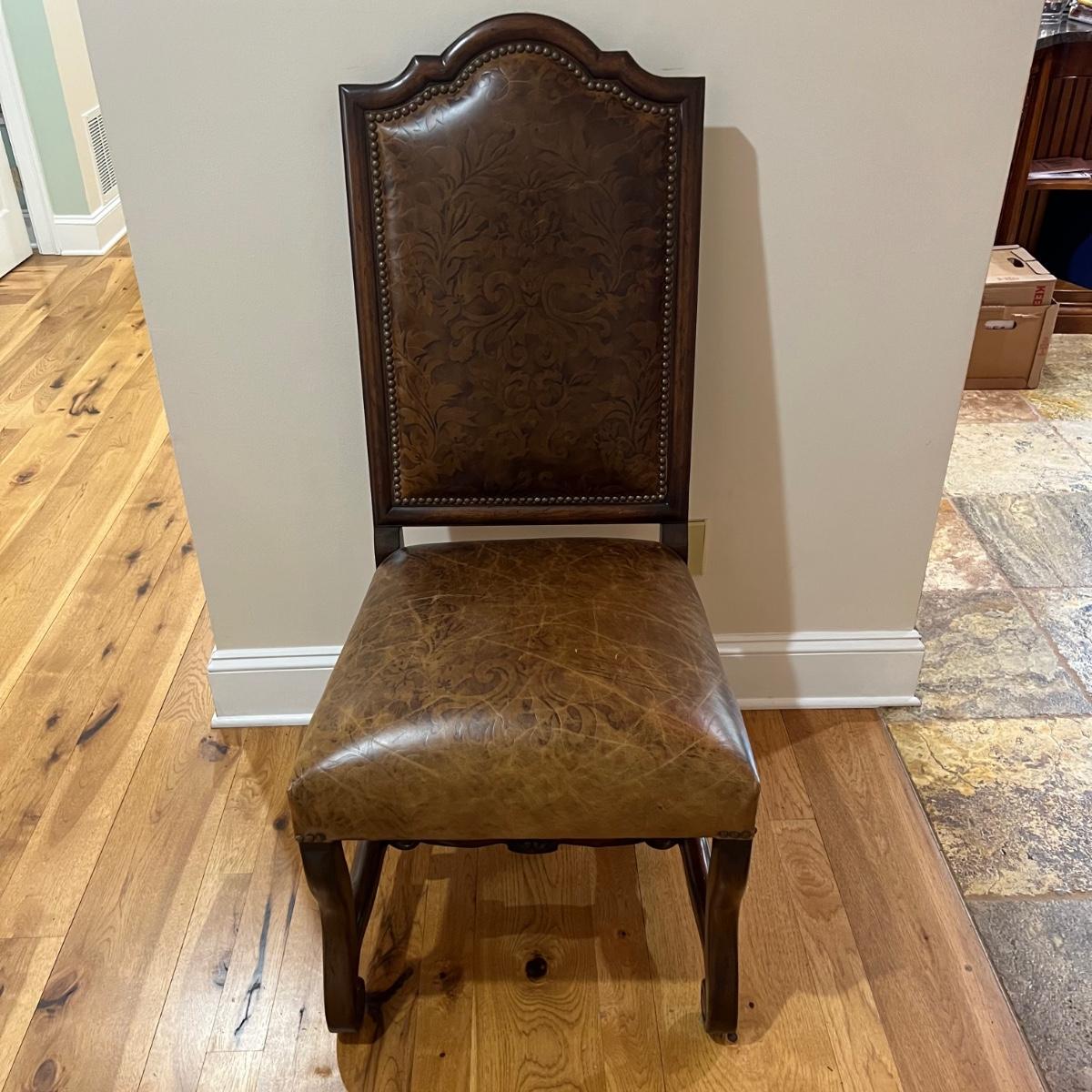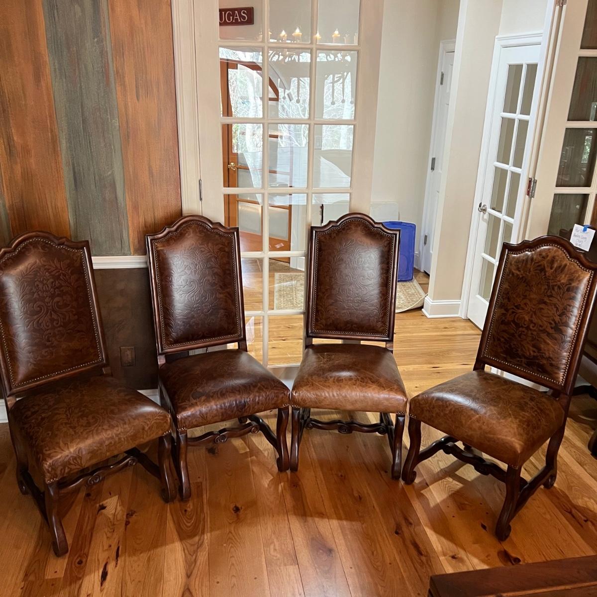 Four wood and brown leather riveted dining chairs. The ornate darker brown brown and light brown leather is the same on the back of the chairs as the seat of the chairs. Each chair measures 21.5” x 21.5” x 47”H with a 22” seat height. Please note small scratch in leather on one chair as shown in the photograph.
