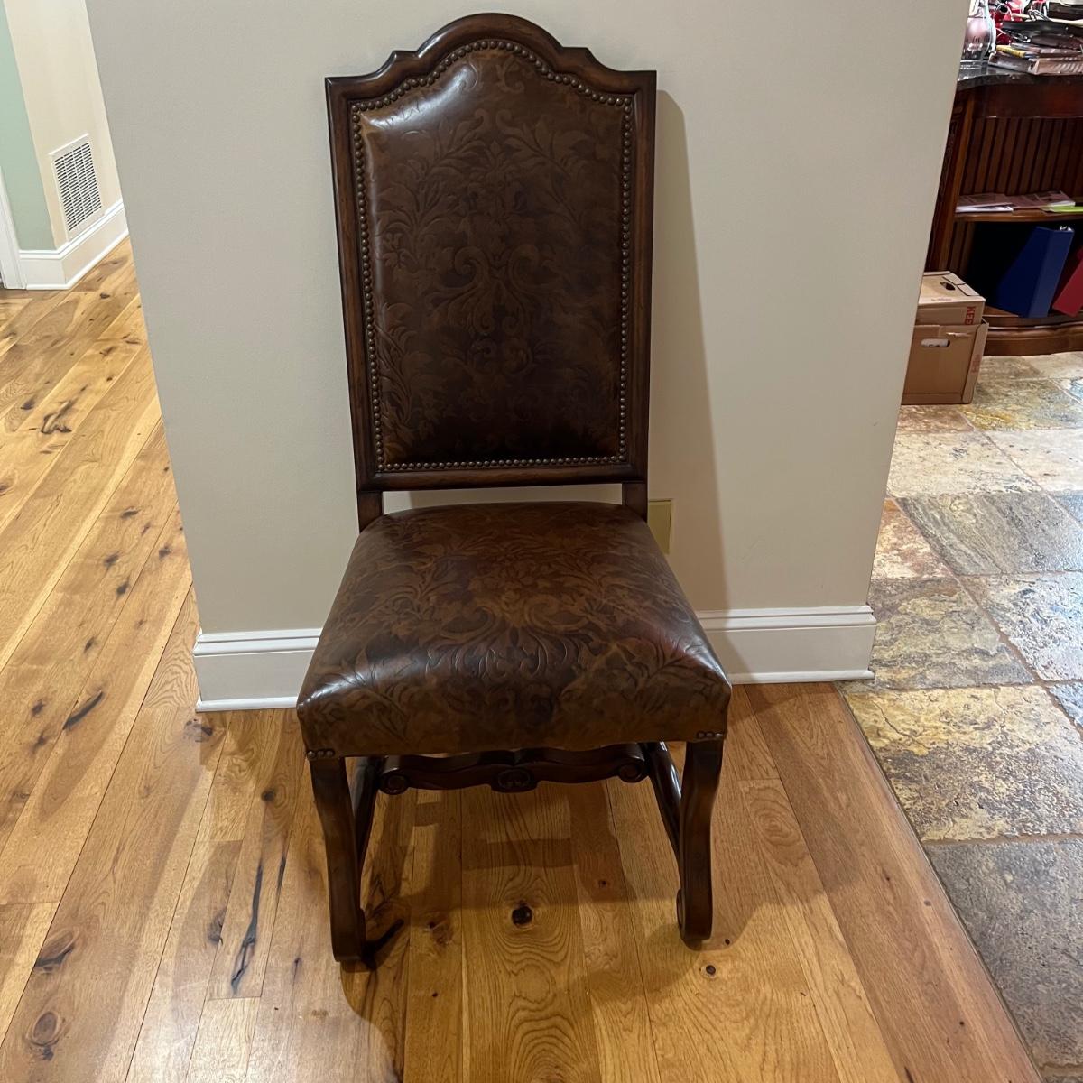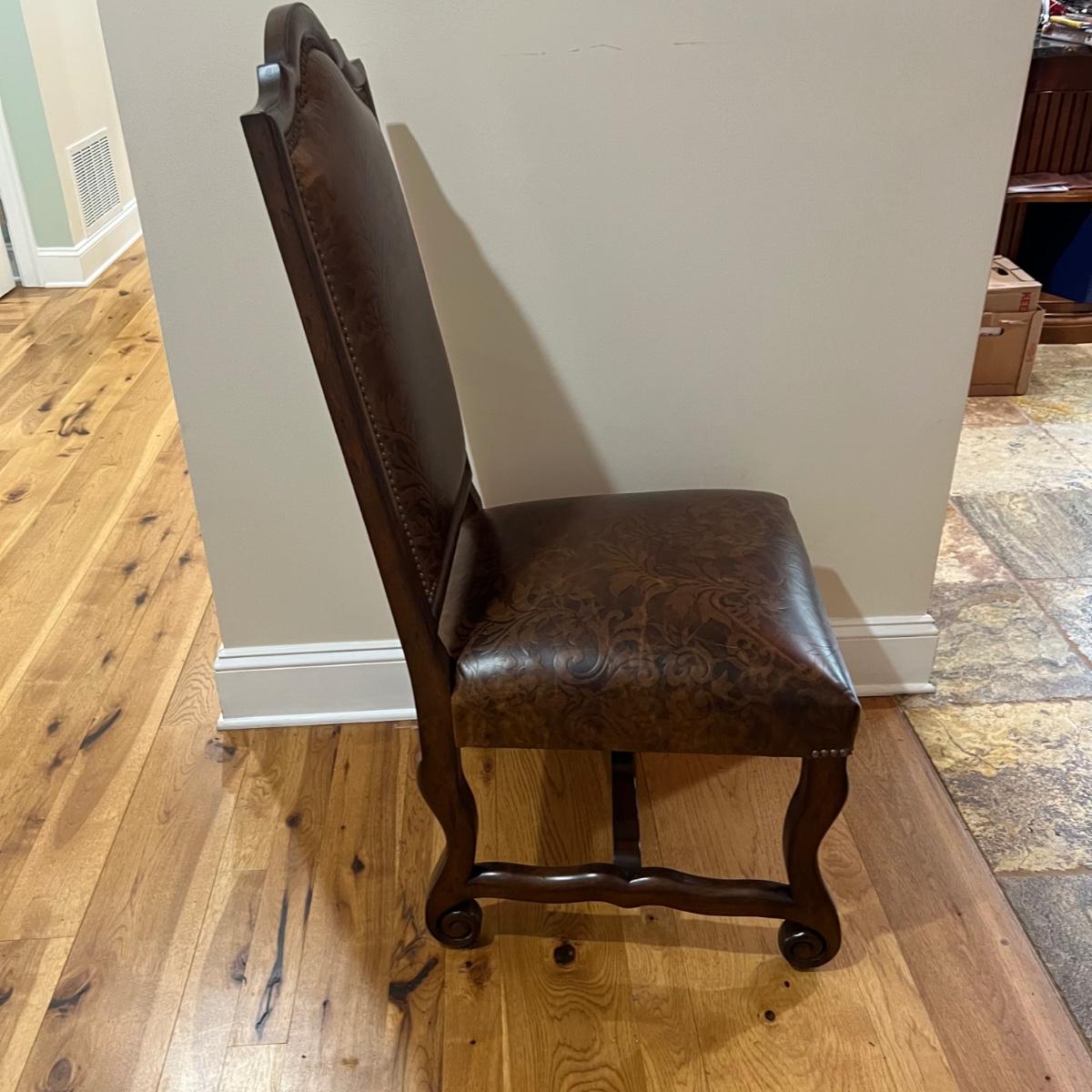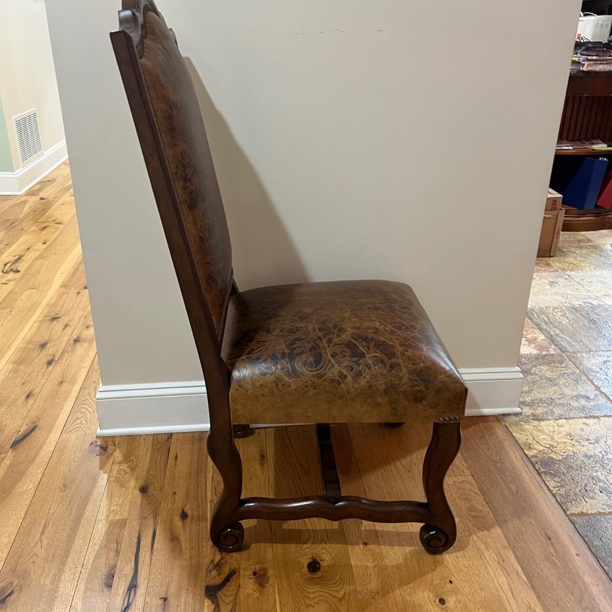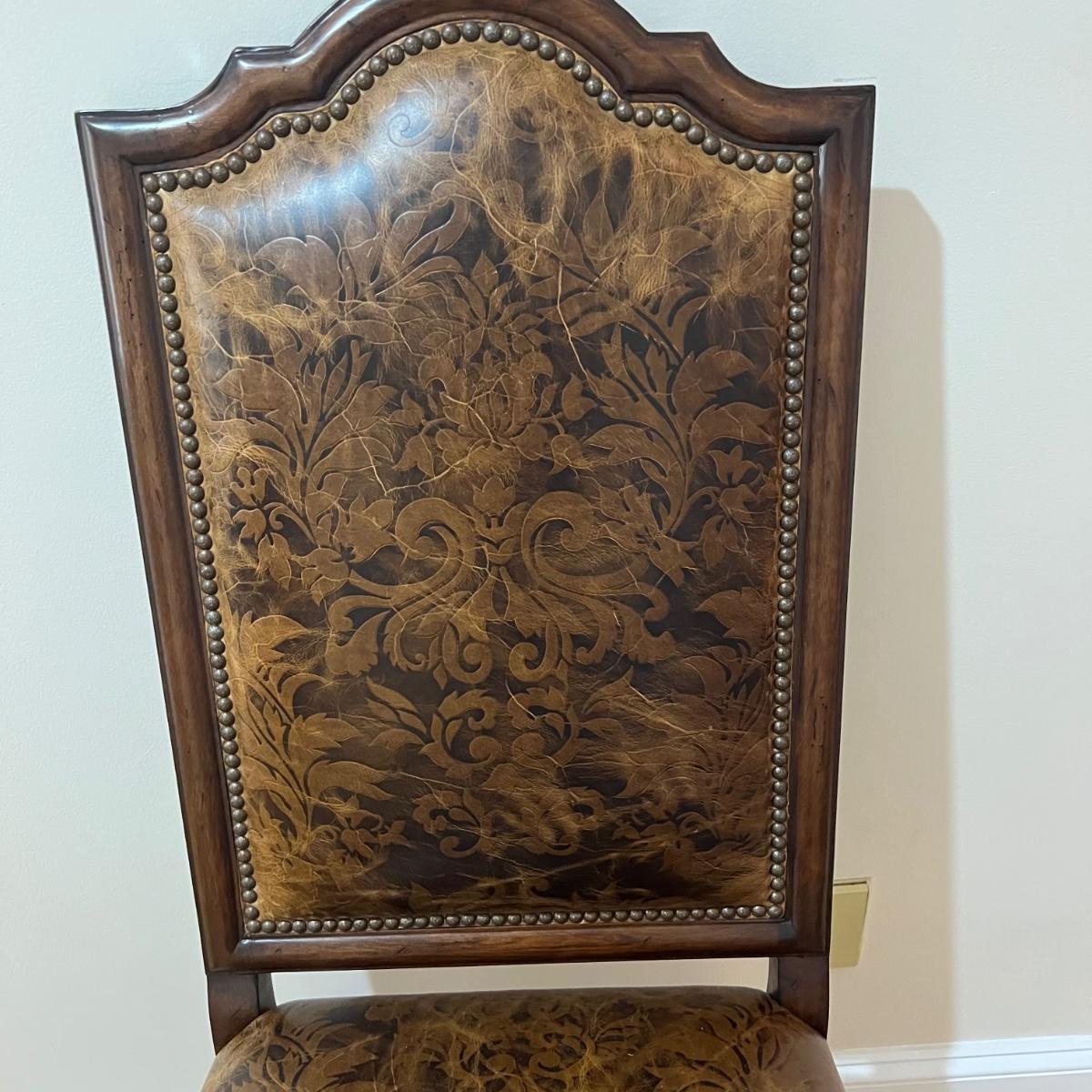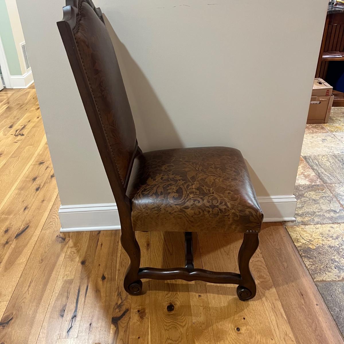 Four wood and brown leather riveted dining chairs. The ornate darker brown brown and light brown leather is the same on the back of the chairs as the seat of the chairs. Each chair measures 21.5” x 21.5” x 47”H with a 22” seat height. Please note small scratch in leather on one chair as shown in the photograph.