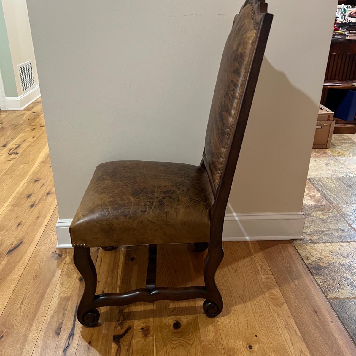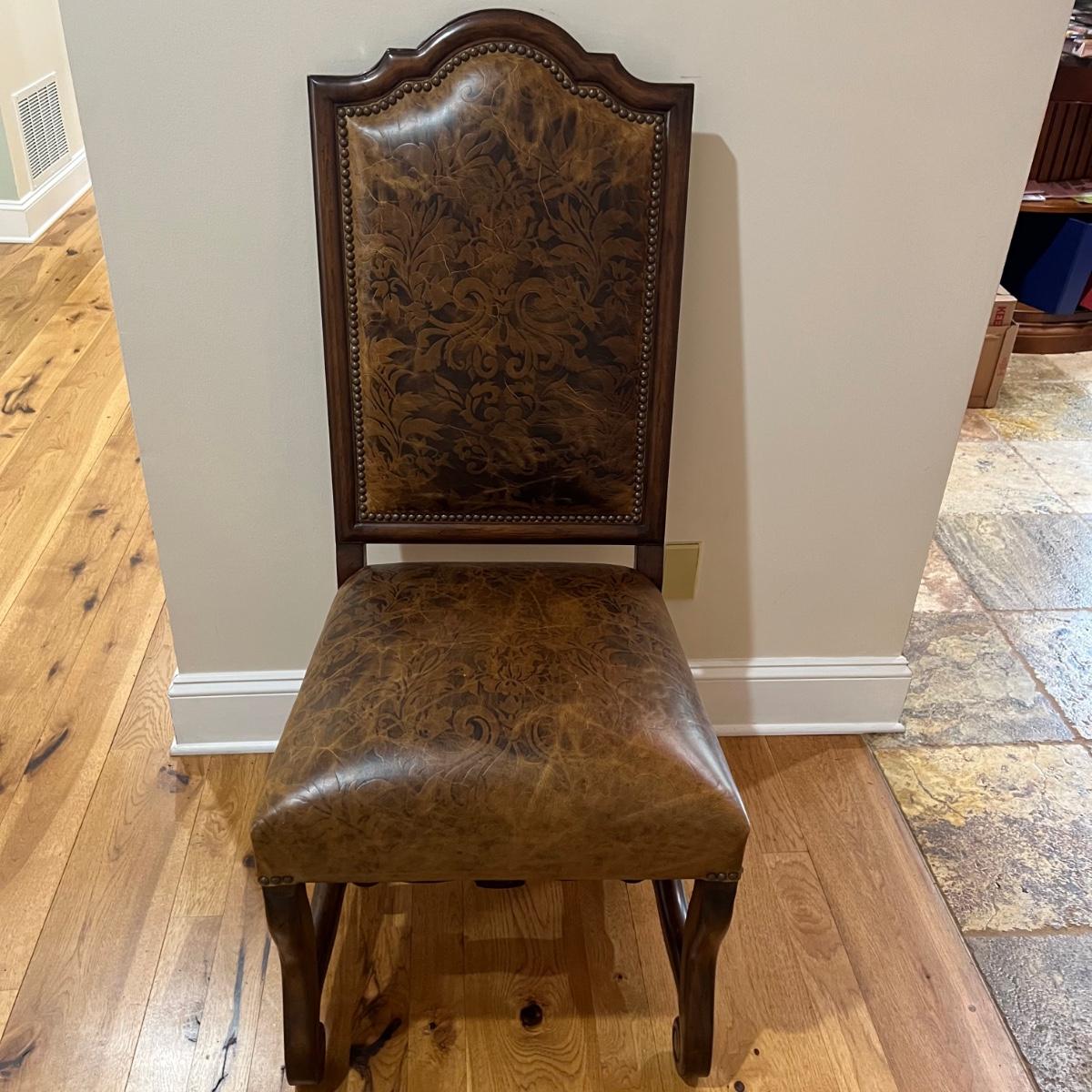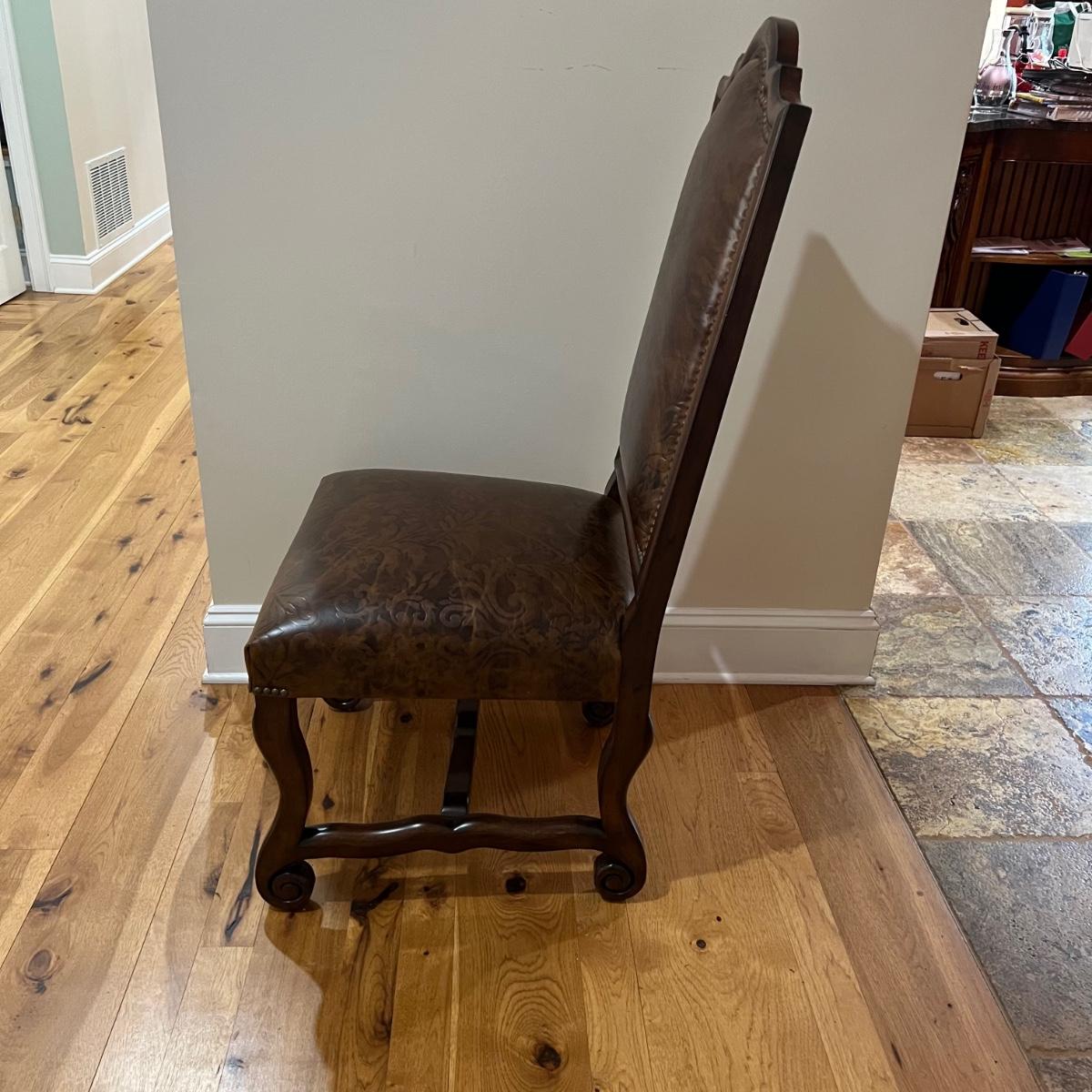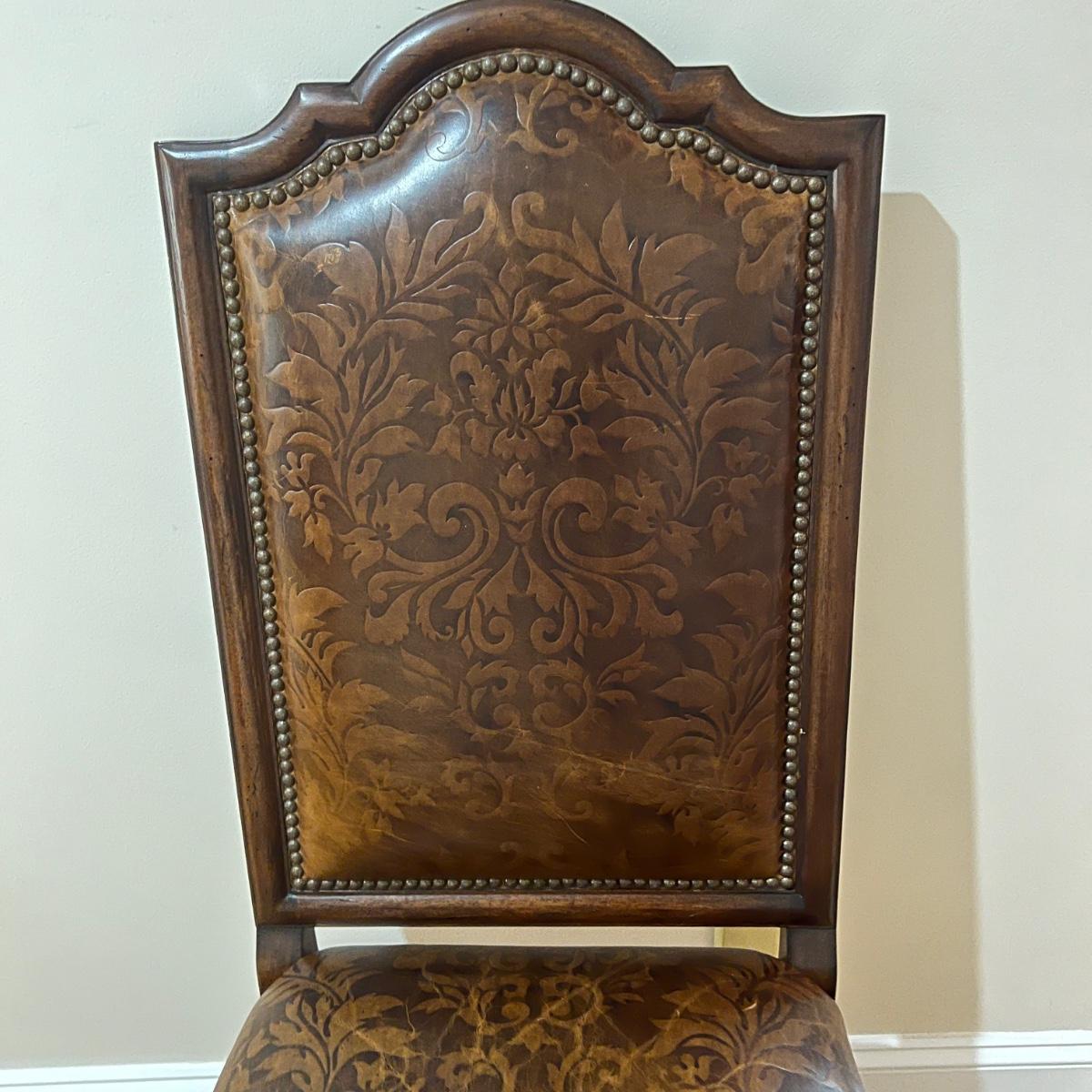 Four wood and brown leather riveted dining chairs. The ornate darker brown brown and light brown leather is the same on the back of the chairs as the seat of the chairs. Each chair measures 21.5” x 21.5” x 47”H with a 22” seat height. Please note small scratch in leather on one chair as shown in the photograph.