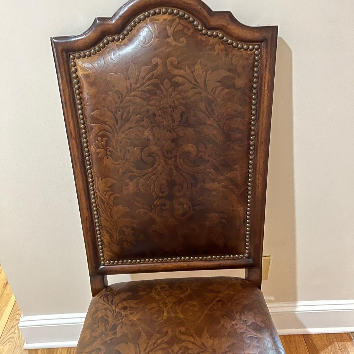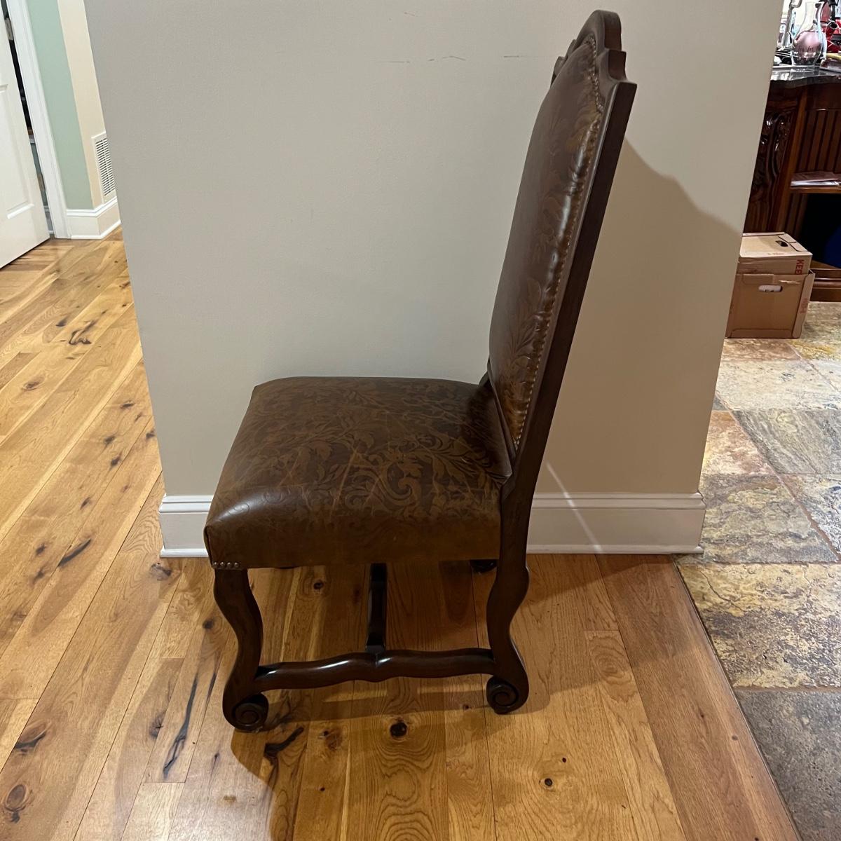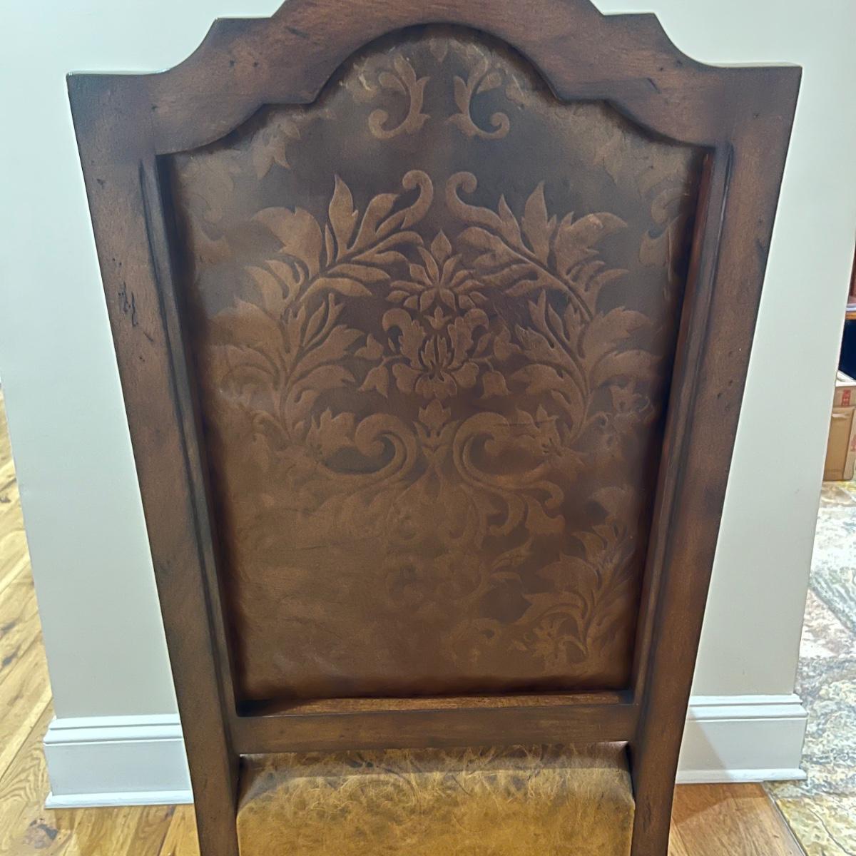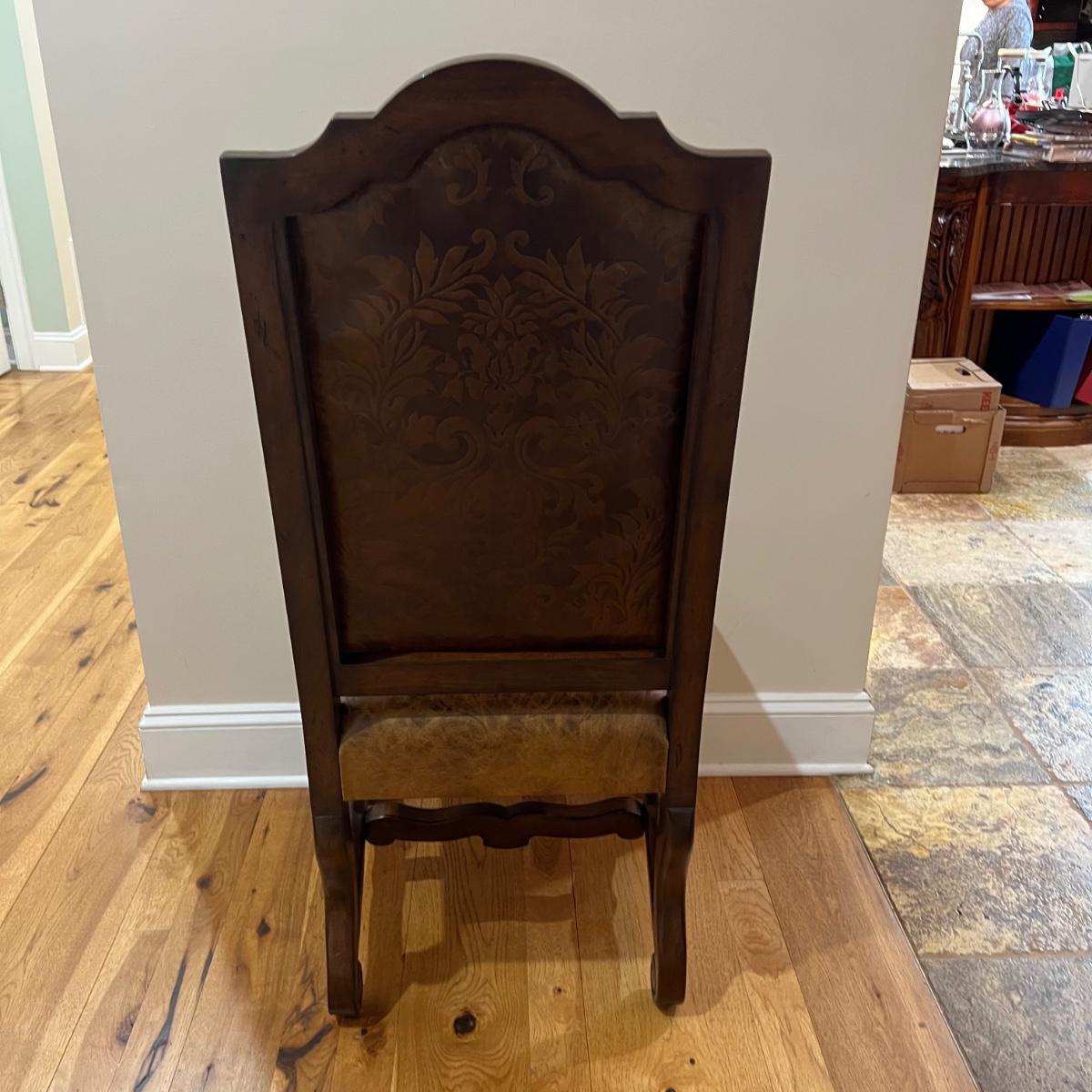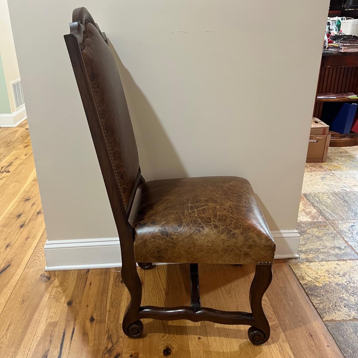 Four wood and brown leather riveted dining chairs. The ornate darker brown brown and light brown leather is the same on the back of the chairs as the seat of the chairs. Each chair measures 21.5” x 21.5” x 47”H with a 22” seat height. Please note small scratch in leather on one chair as shown in the photograph.