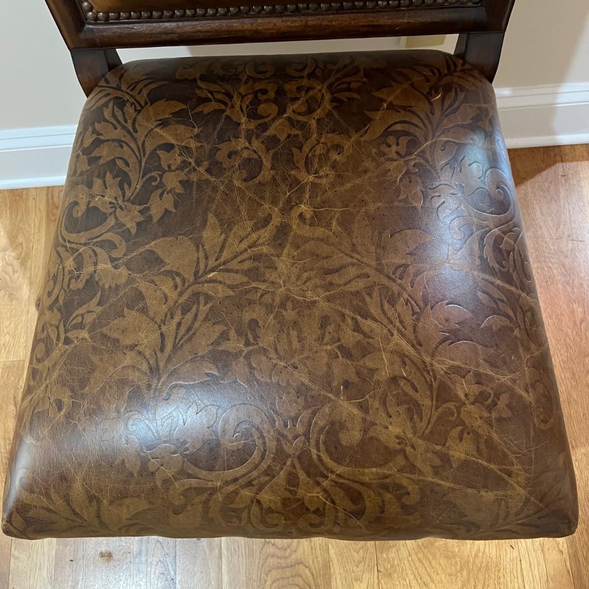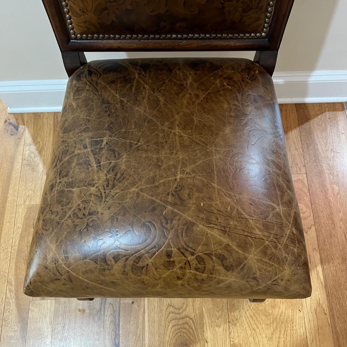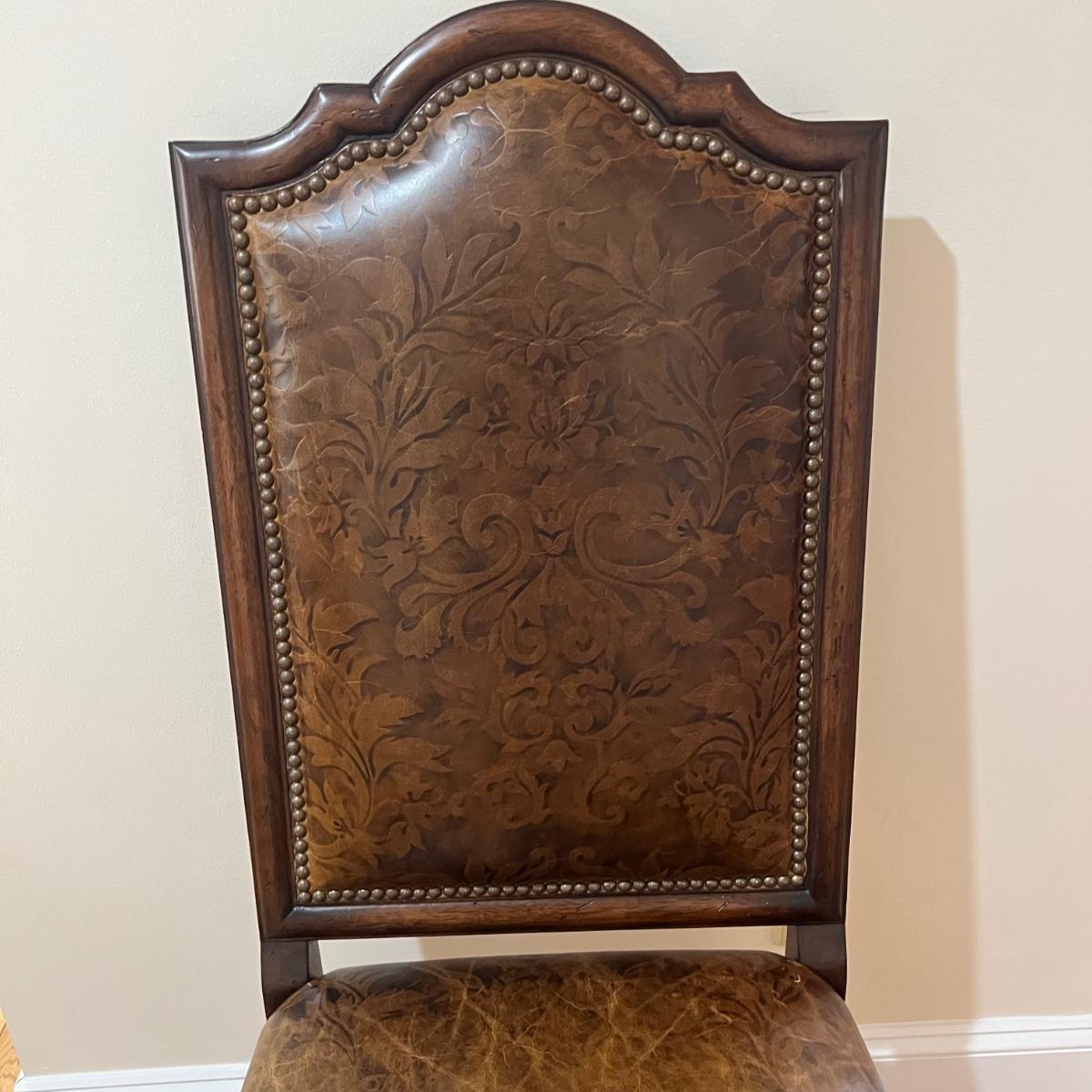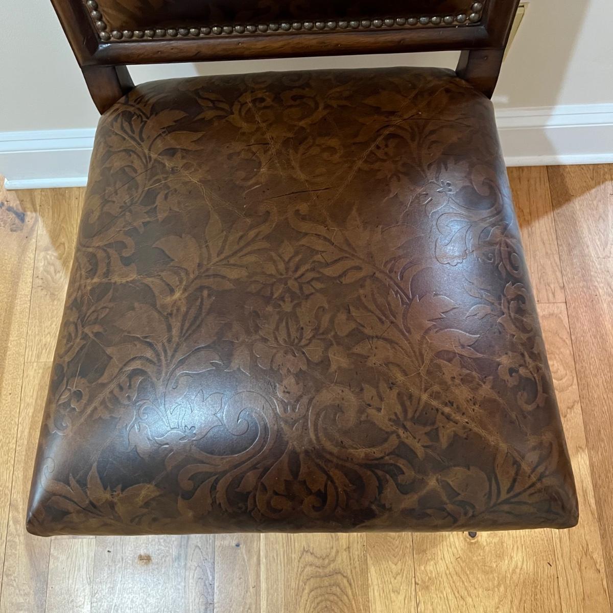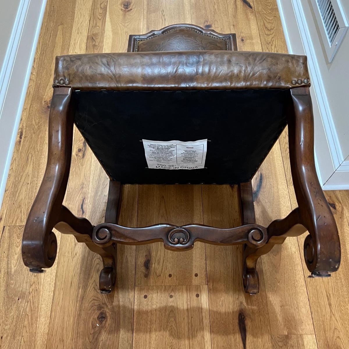 Four wood and brown leather riveted dining chairs. The ornate darker brown brown and light brown leather is the same on the back of the chairs as the seat of the chairs. Each chair measures 21.5” x 21.5” x 47”H with a 22” seat height. Please note small scratch in leather on one chair as shown in the photograph.