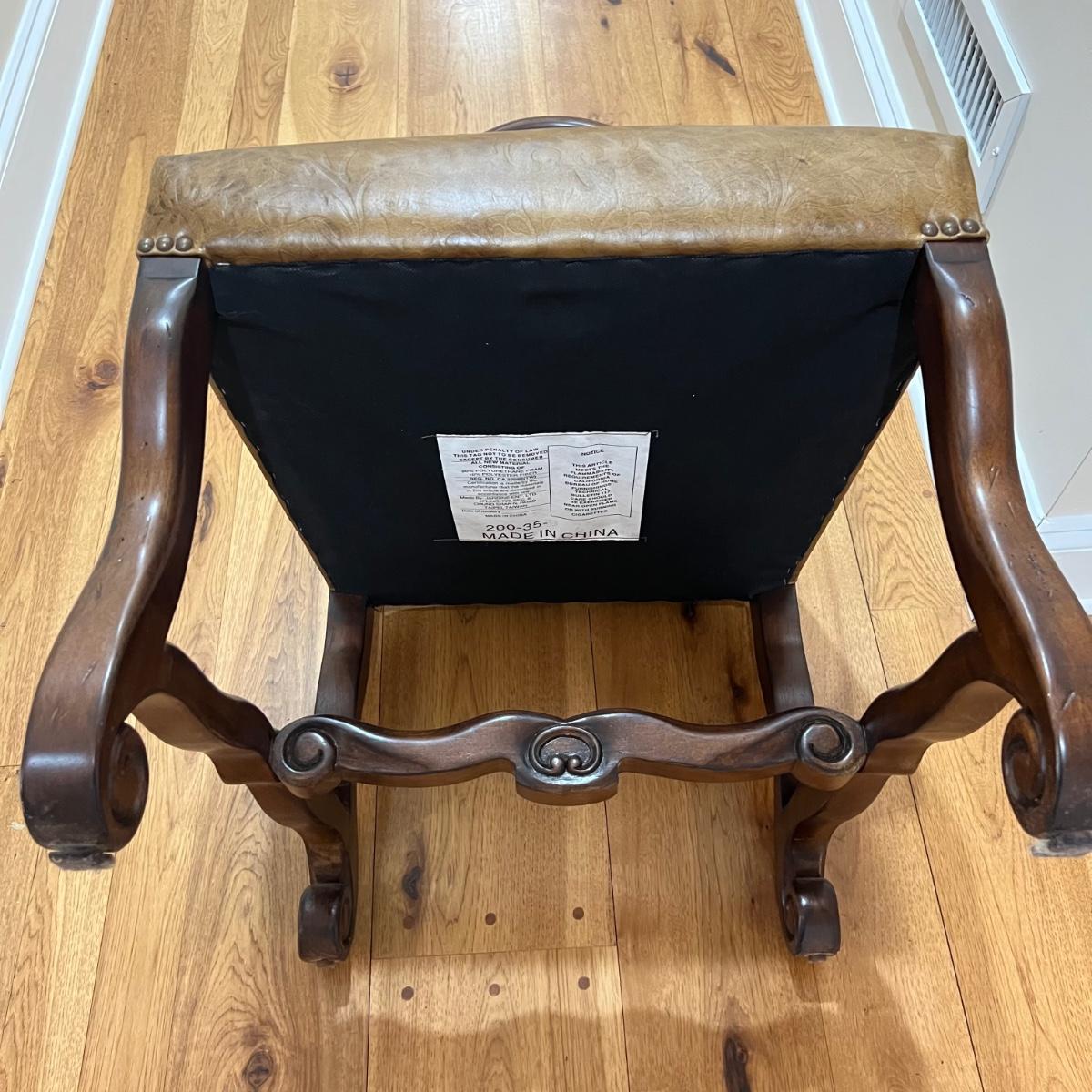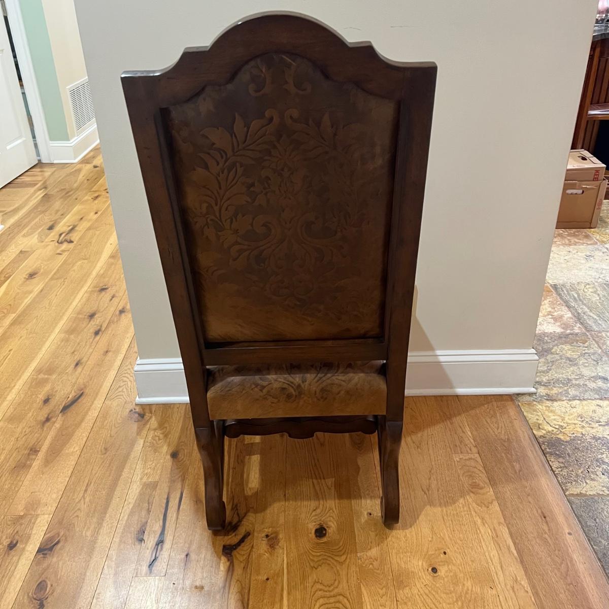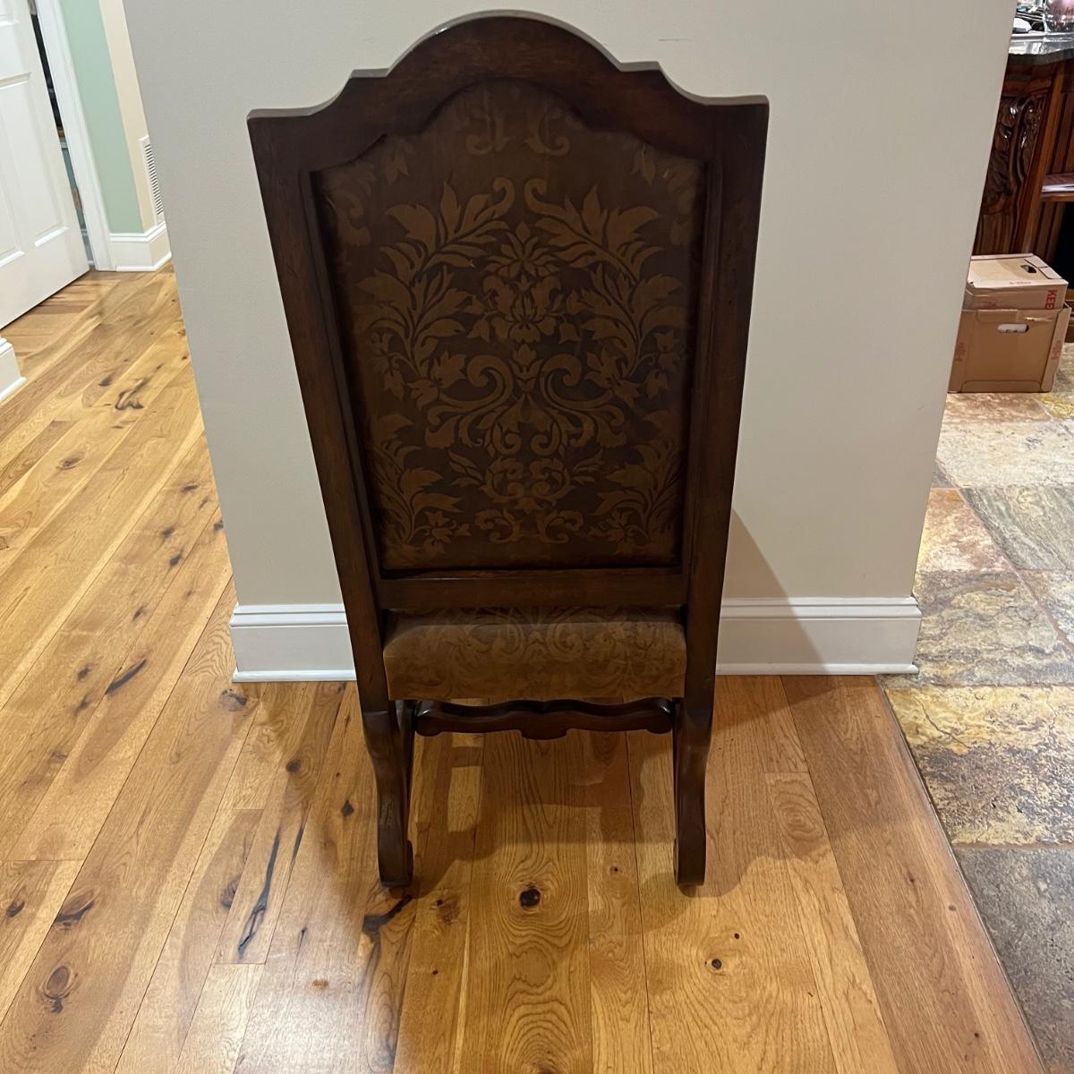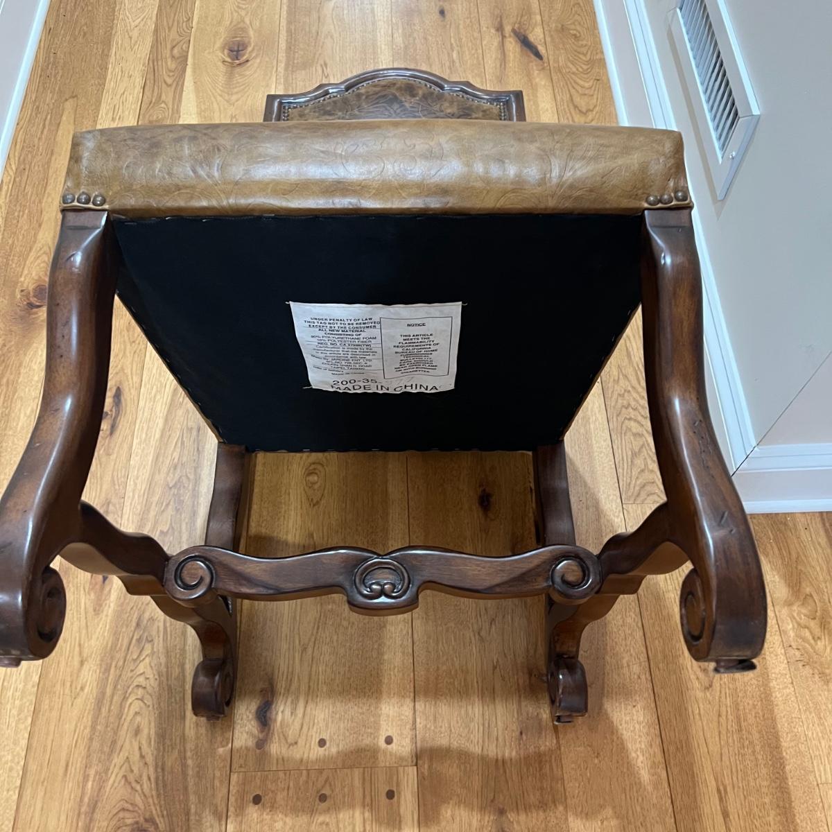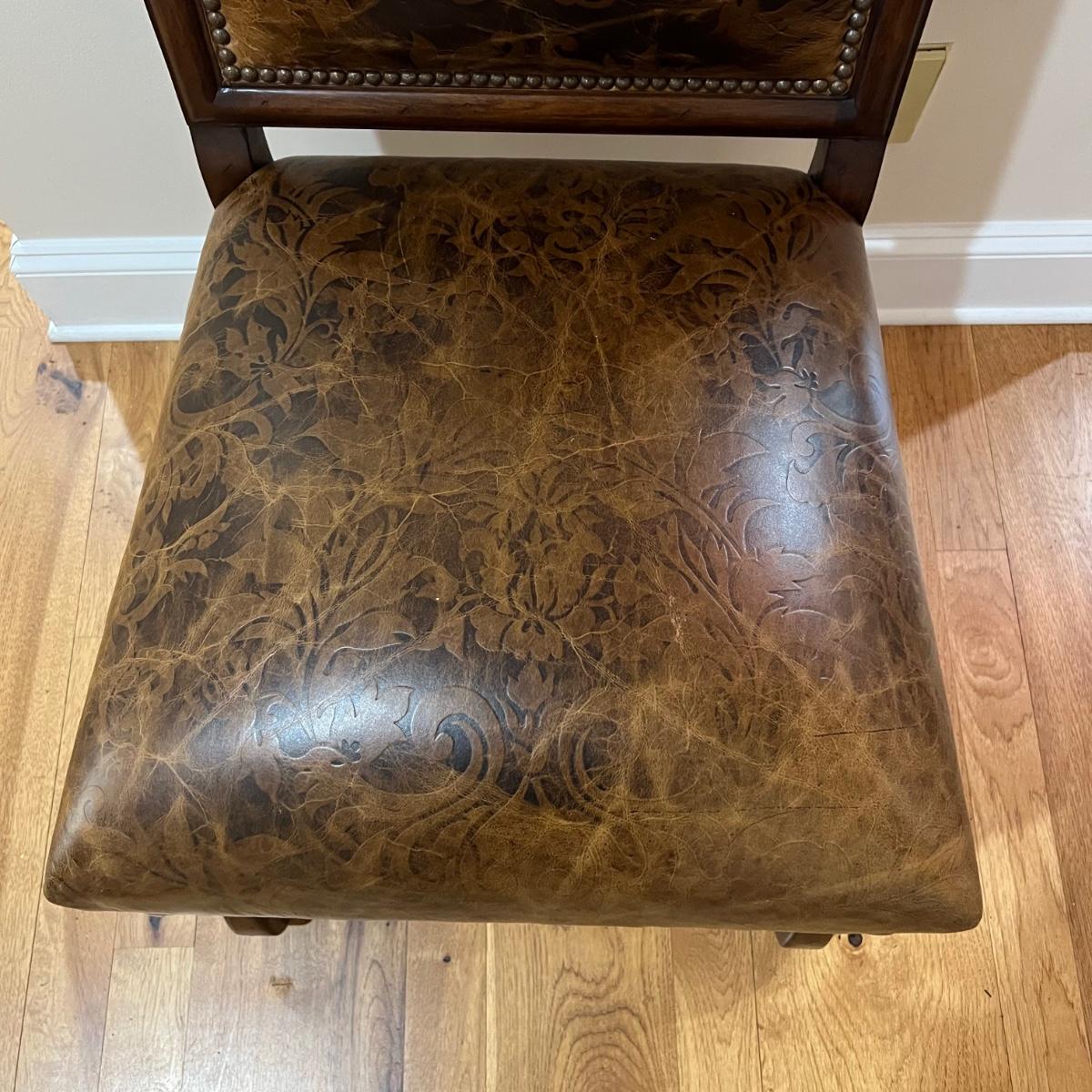 Four wood and brown leather riveted dining chairs. The ornate darker brown brown and light brown leather is the same on the back of the chairs as the seat of the chairs. Each chair measures 21.5” x 21.5” x 47”H with a 22” seat height. Please note small scratch in leather on one chair as shown in the photograph.