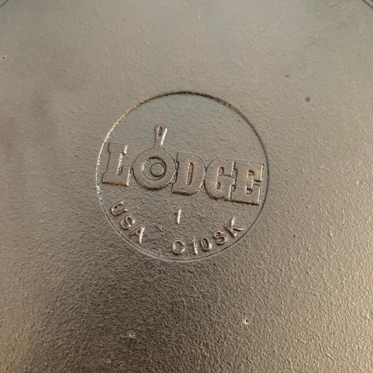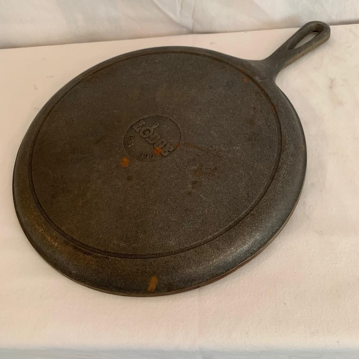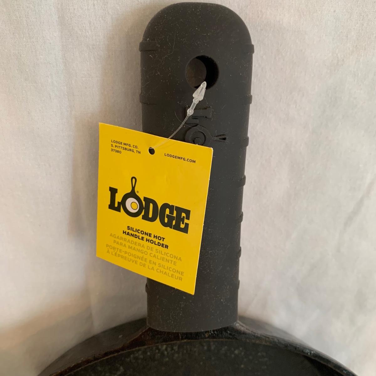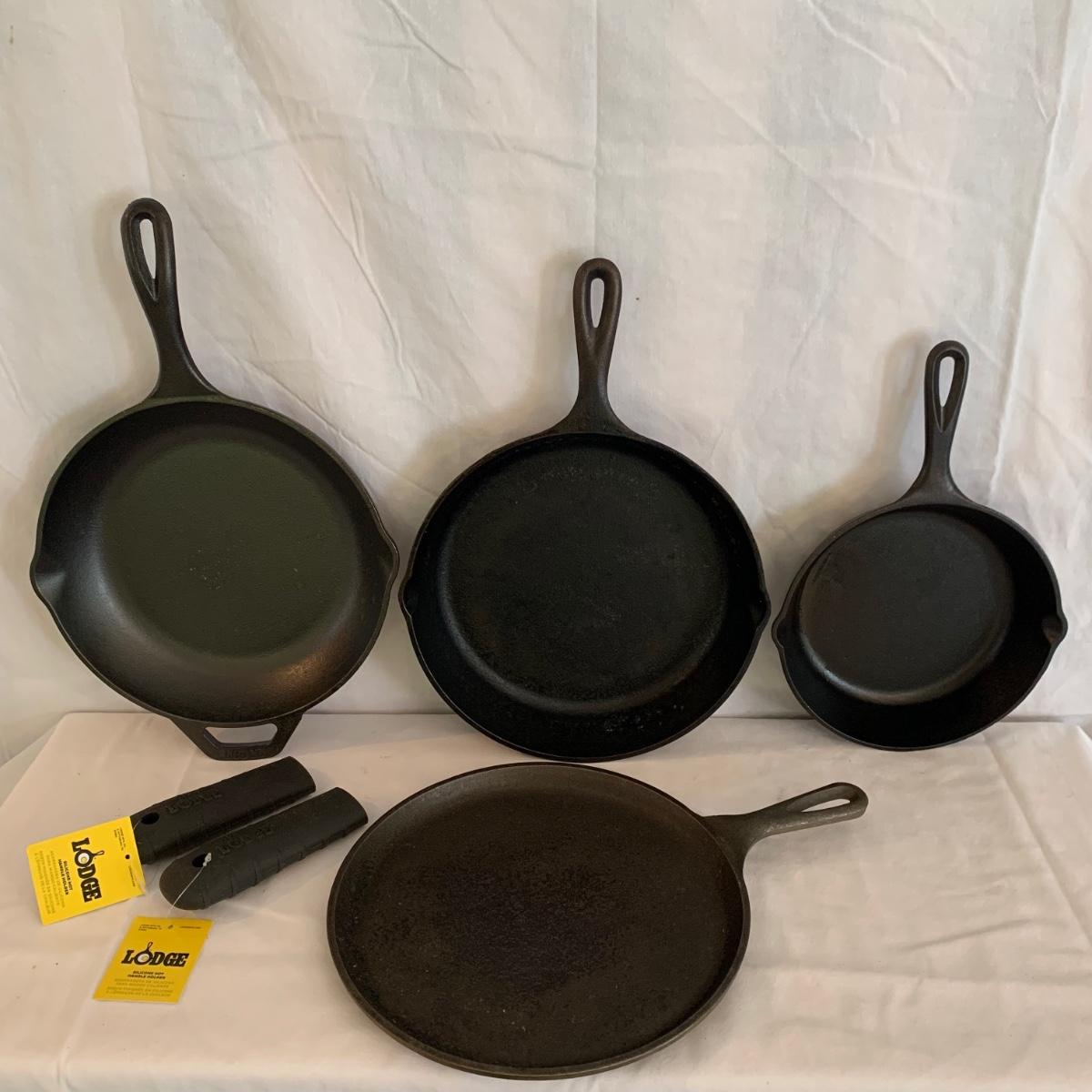 Four Lodge cast iron skillets. Two are about 10”D, one is 8”D, and the last is a 10”D round flat skillet. One of the larger skillet appears to be unused, the rest appear to be used. Two new with tags Lodge silicone hot handle holders are included as well.