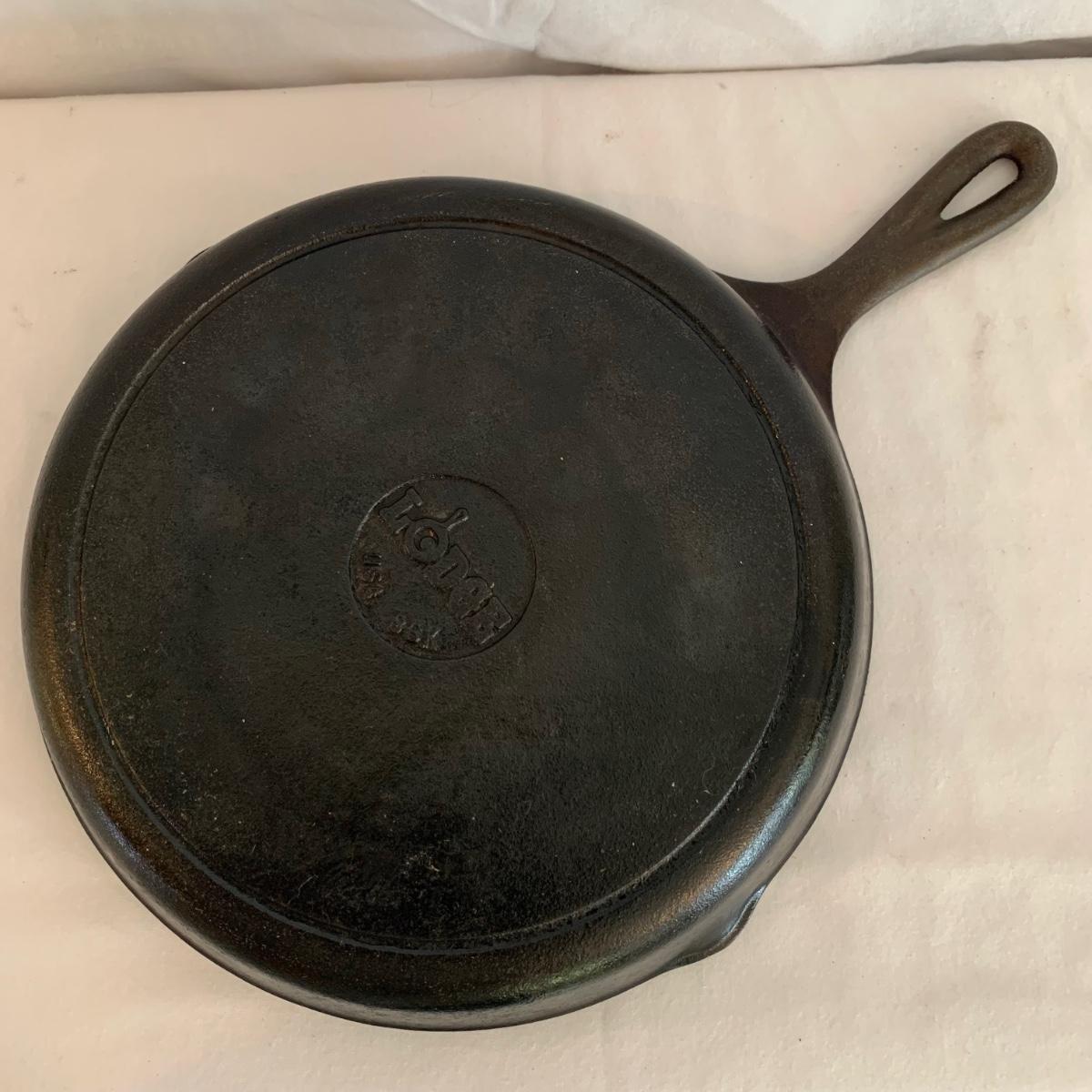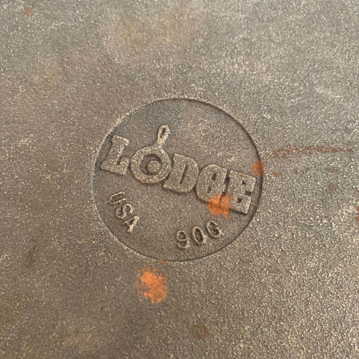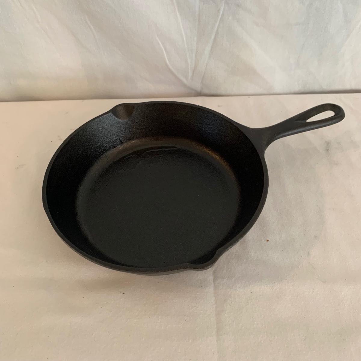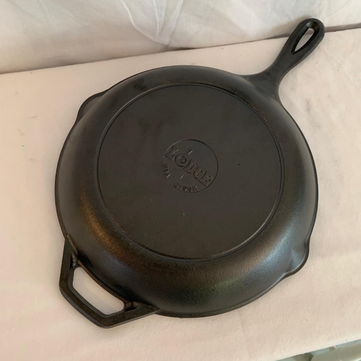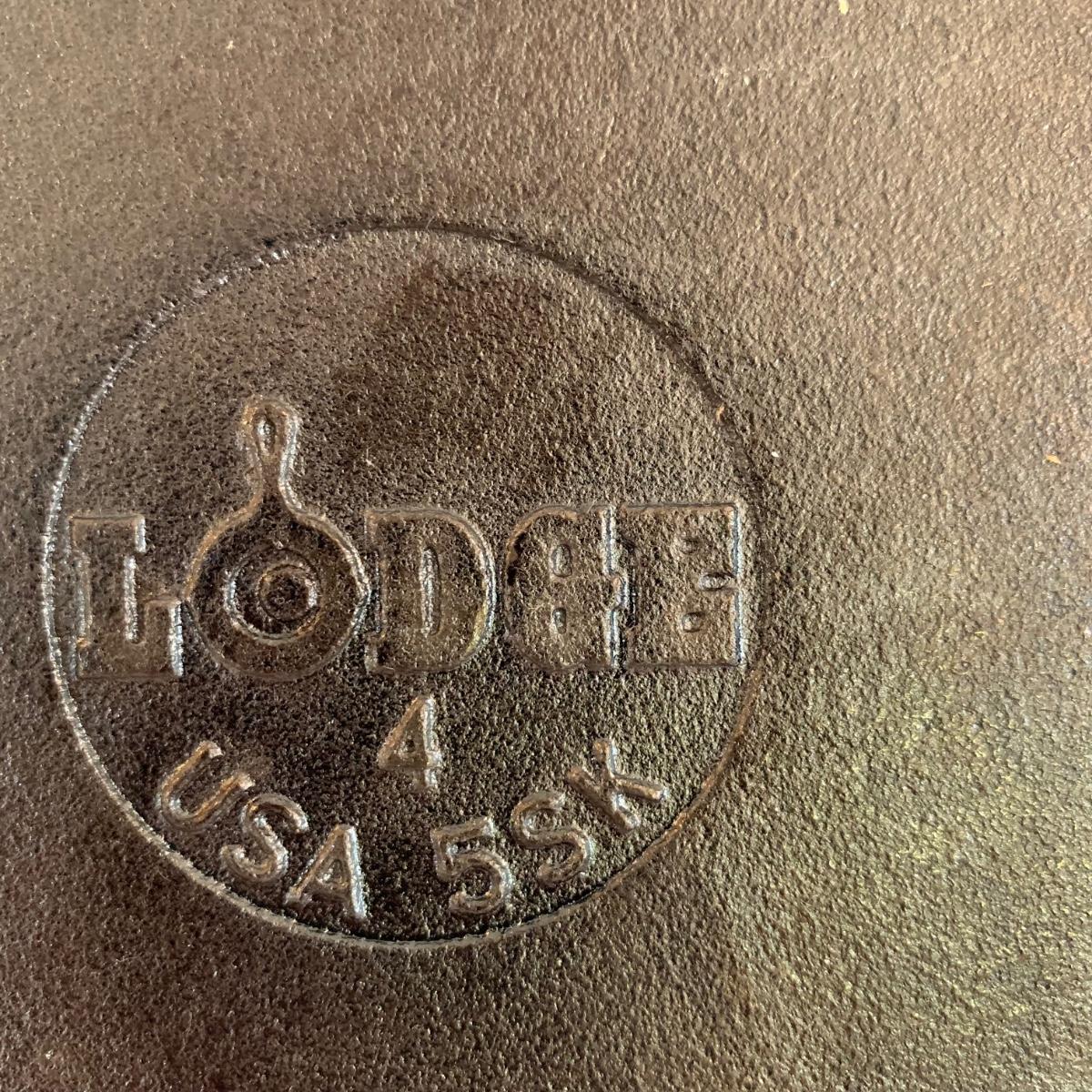 Four Lodge cast iron skillets. Two are about 10”D, one is 8”D, and the last is a 10”D round flat skillet. One of the larger skillet appears to be unused, the rest appear to be used. Two new with tags Lodge silicone hot handle holders are included as well.