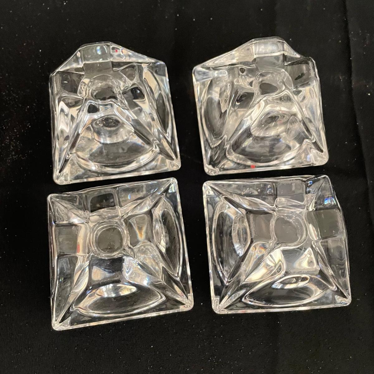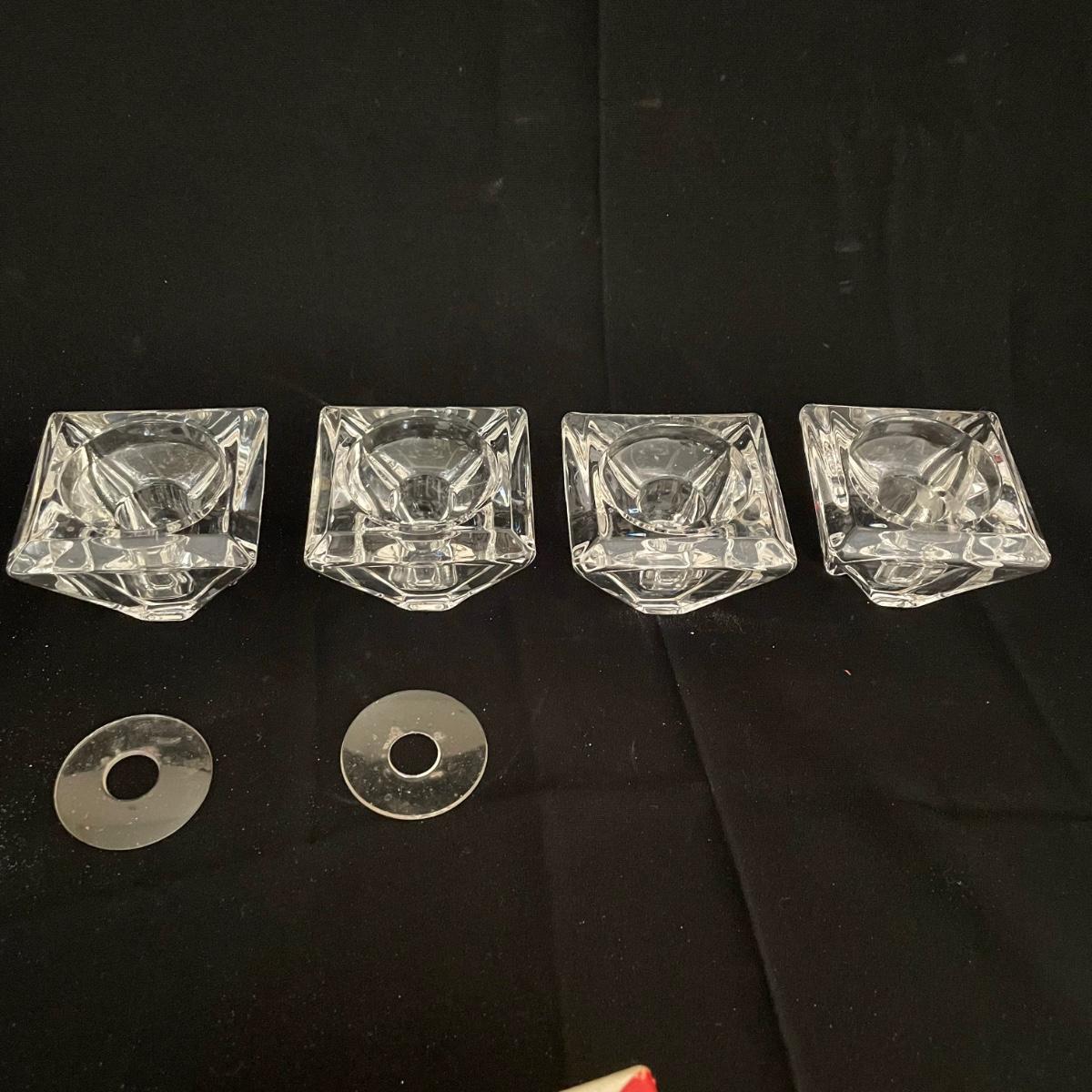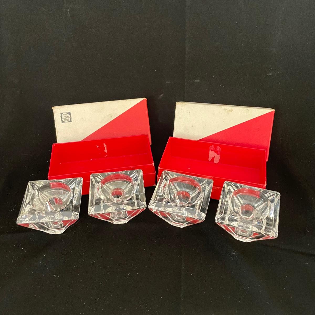 Four Maastricht crystal candle holders. These beauties appear to be converted for both taper and votive candles. They all measure 2.75” x 2.75” x 1.75” with a 1.75”d cutout for the votive. They are complete with matching boxes, but only one Maastricht label. Two delicate glass disks are included to catch wax. See images. Shipping available.