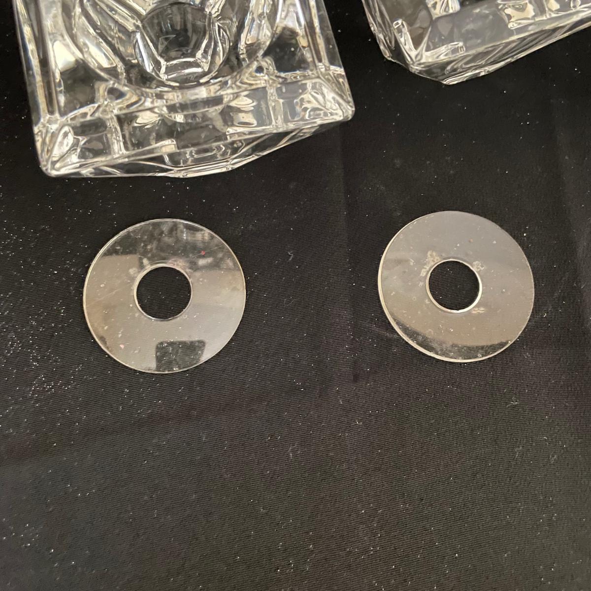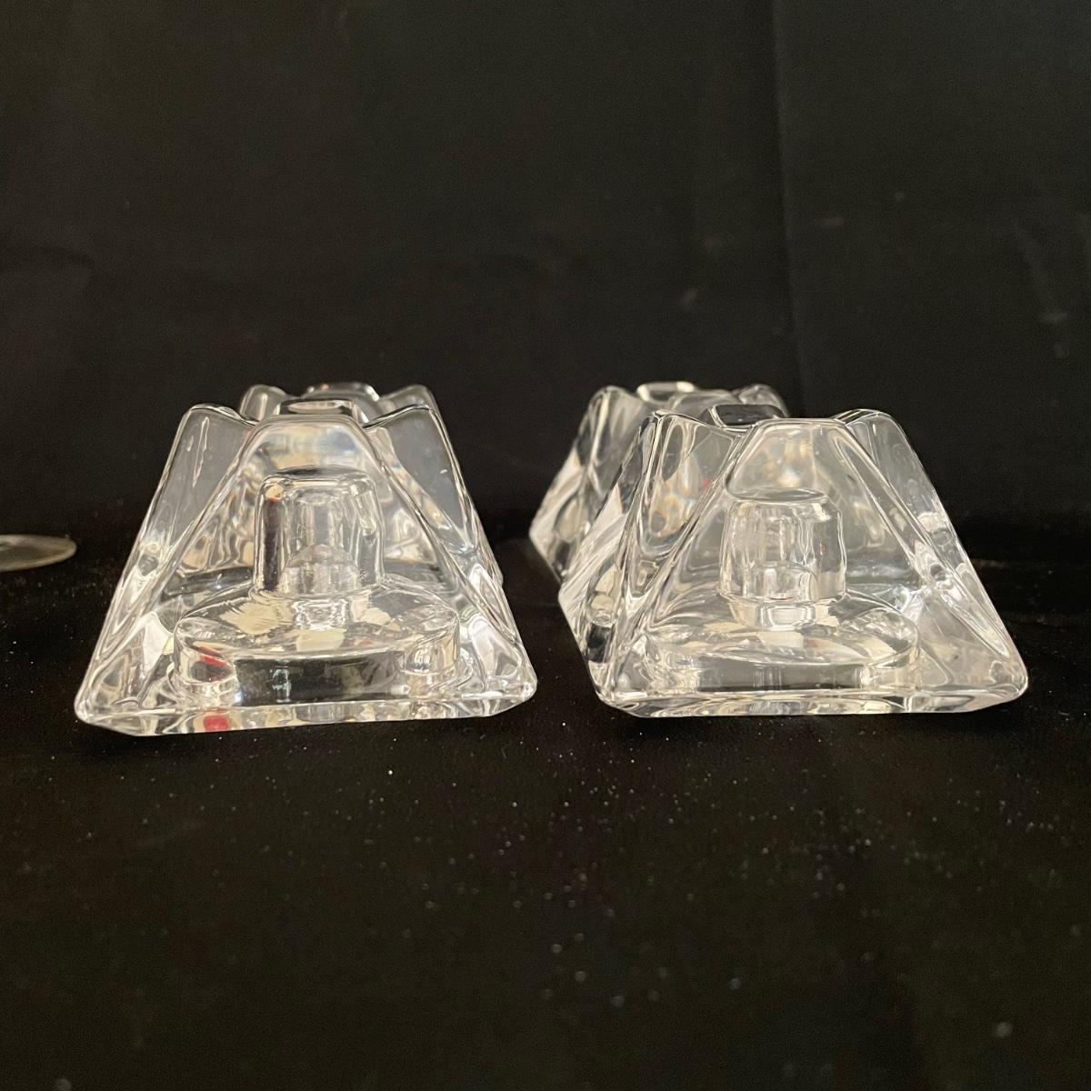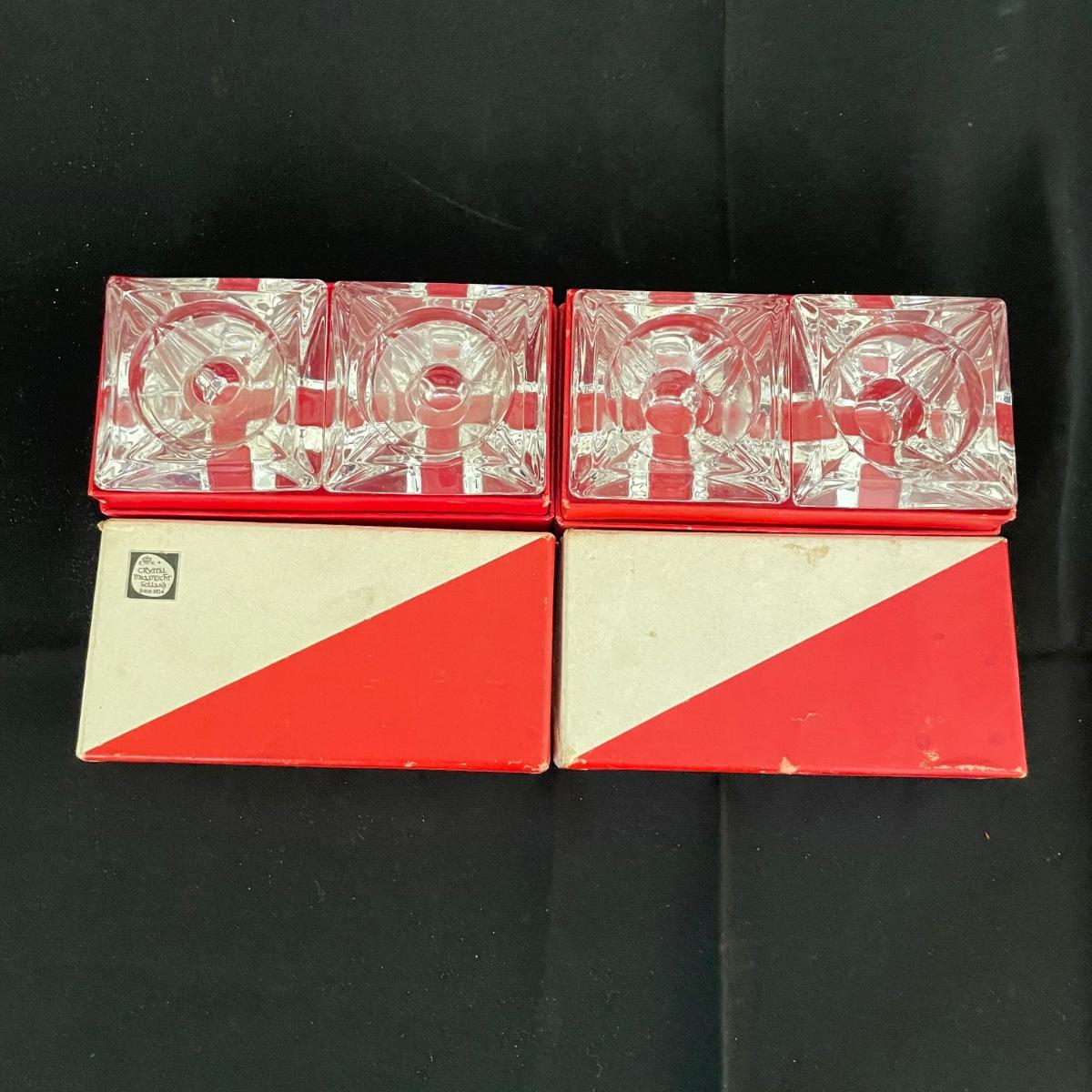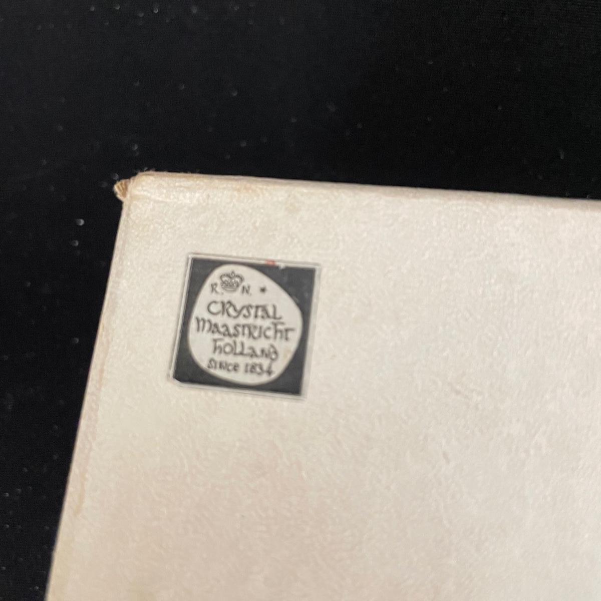 Four Maastricht crystal candle holders. These beauties appear to be converted for both taper and votive candles. They all measure 2.75” x 2.75” x 1.75” with a 1.75”d cutout for the votive. They are complete with matching boxes, but only one Maastricht label. Two delicate glass disks are included to catch wax. See images. Shipping available.