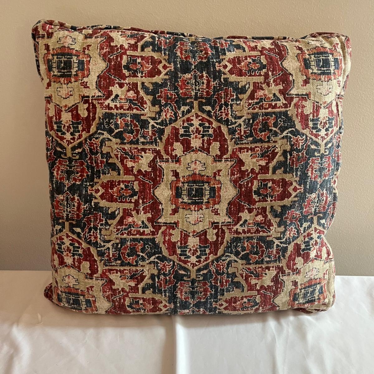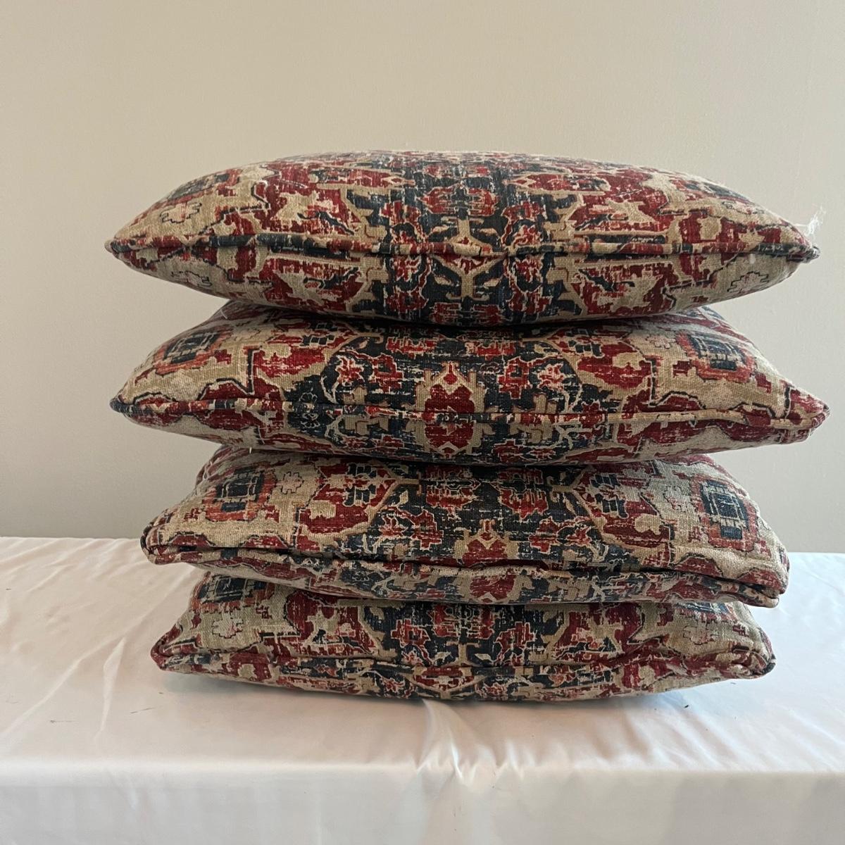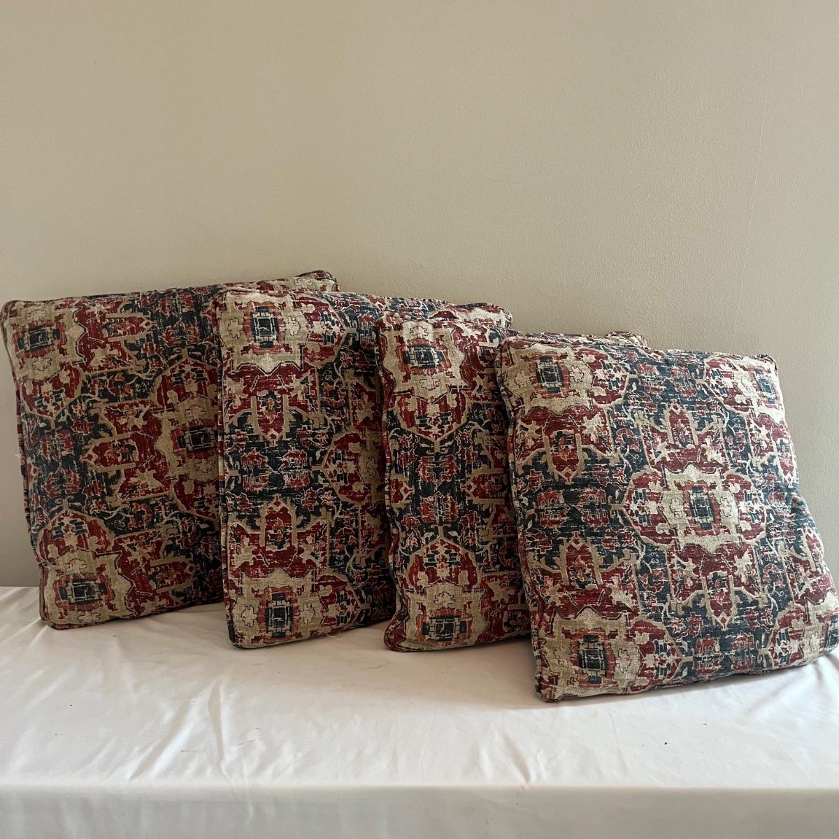 Lot includes four 18” x 18” matching accent pillows in red, blue and cream colors with removable fabric covers. Pillows are in good condition with no rips or stains.