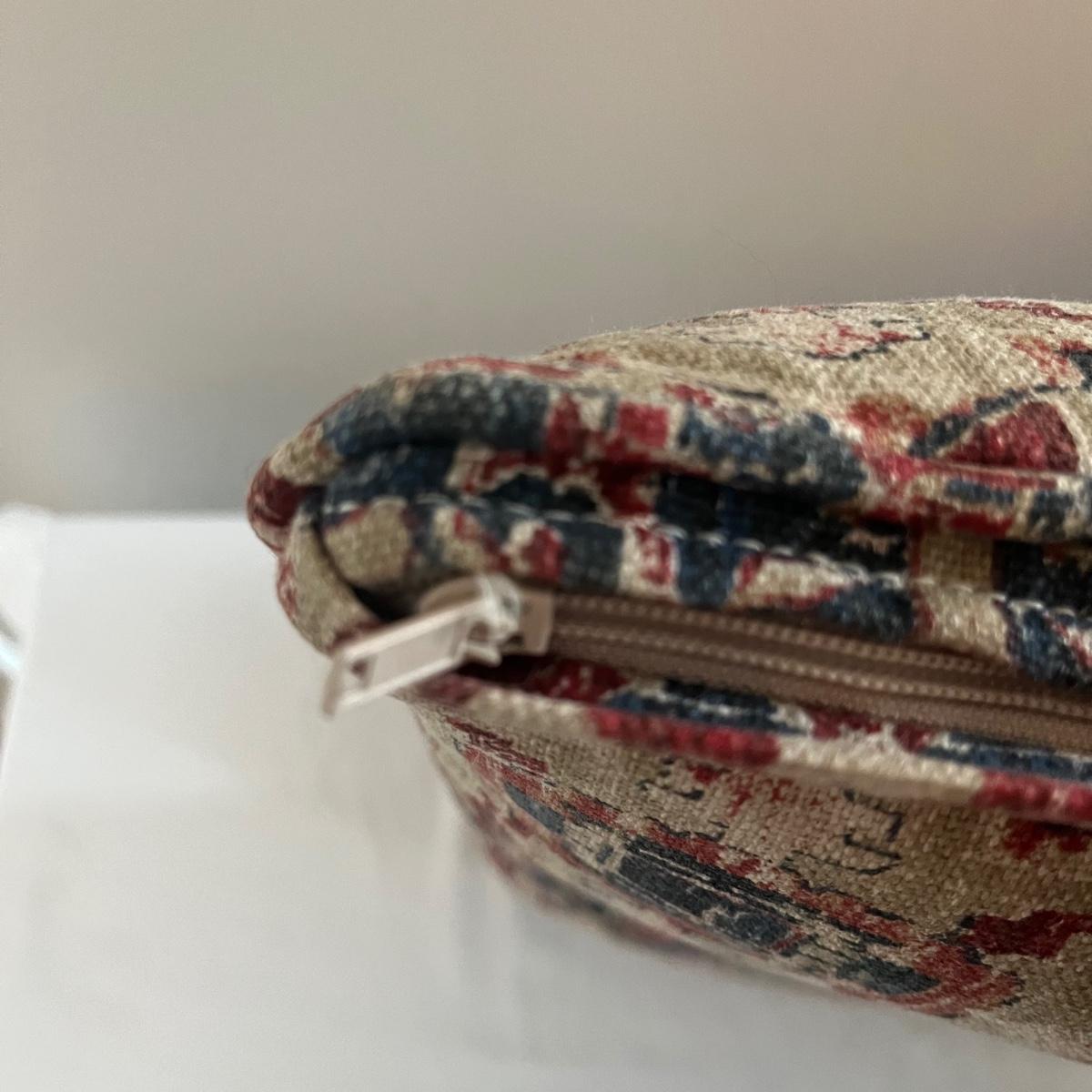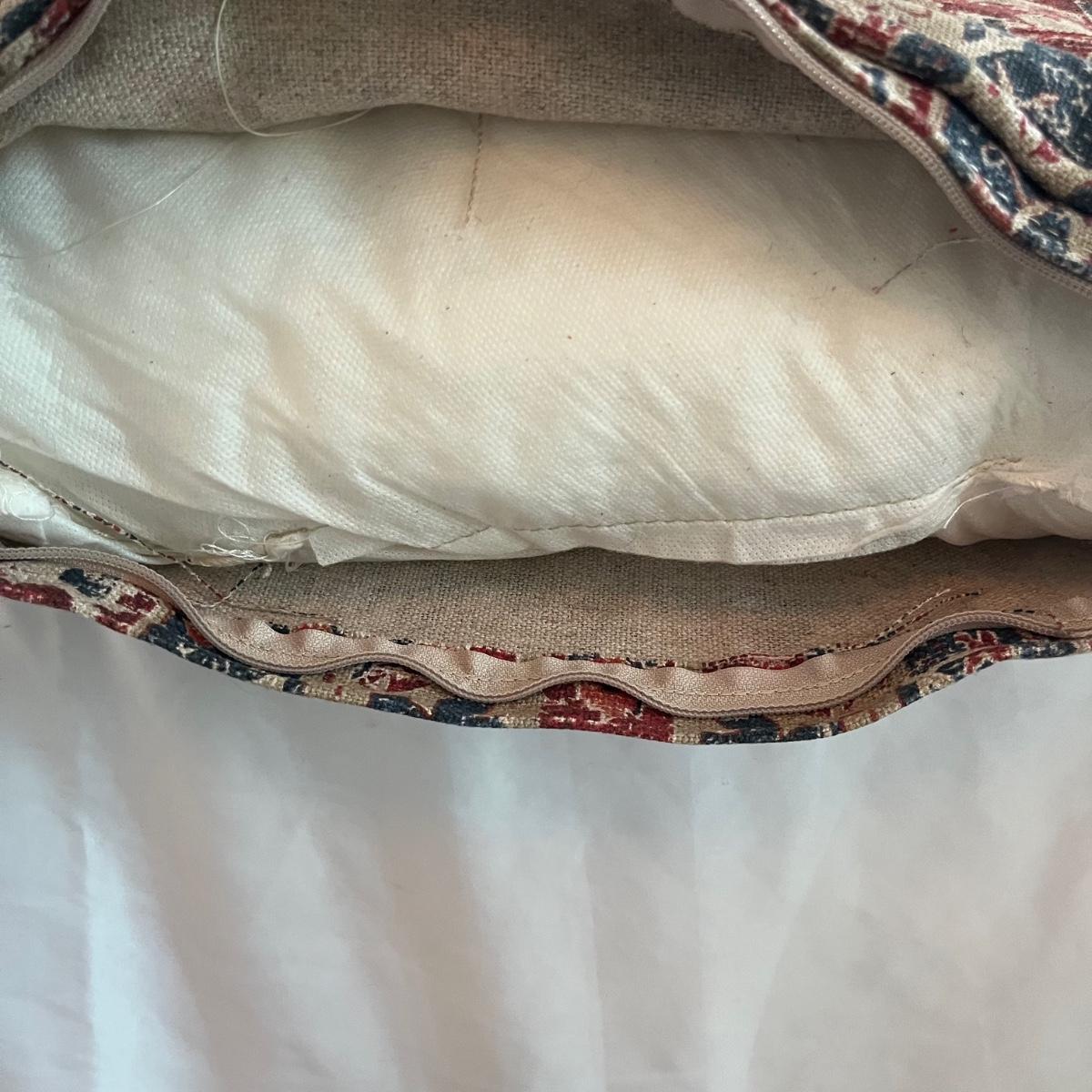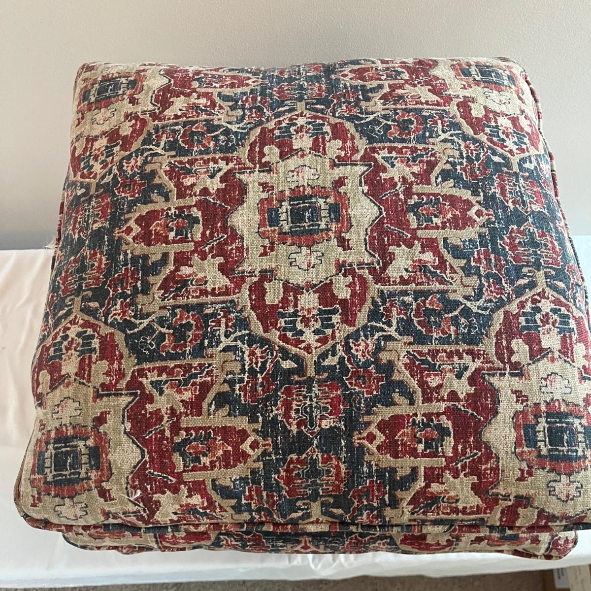 Lot includes four 18” x 18” matching accent pillows in red, blue and cream colors with removable fabric covers. Pillows are in good condition with no rips or stains.