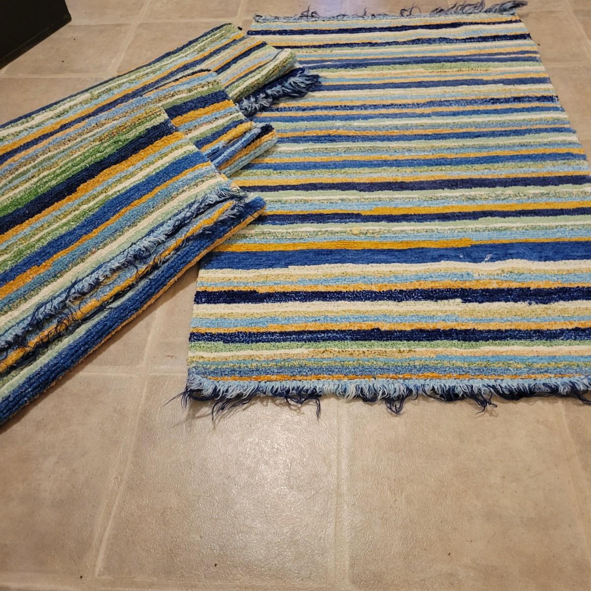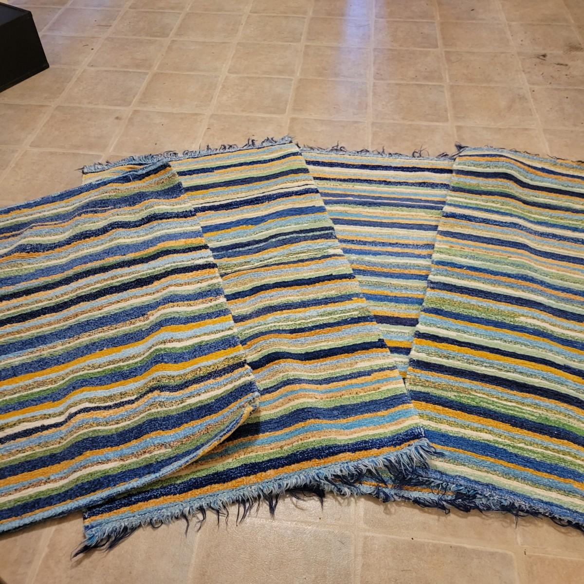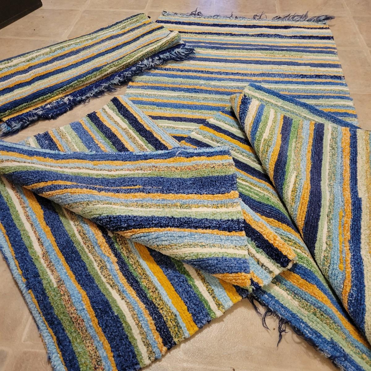 A set of four matching rugs in good condition with no notable stains, but one rug is missing its tassels. These rugs are soft and have a mix of vibrant blues, greens, orange and white. Three are the same size and one is slightly smaller. Measures approximately 37" x 22". Shipping available