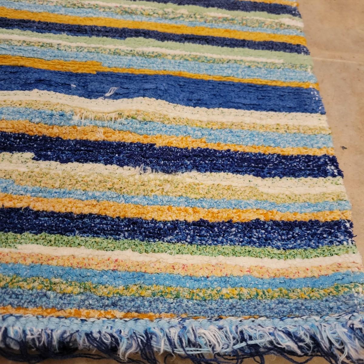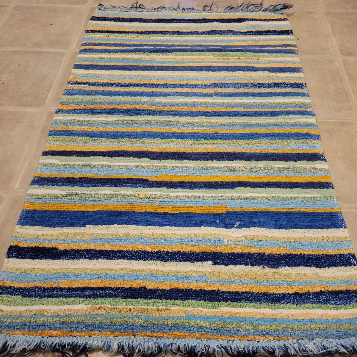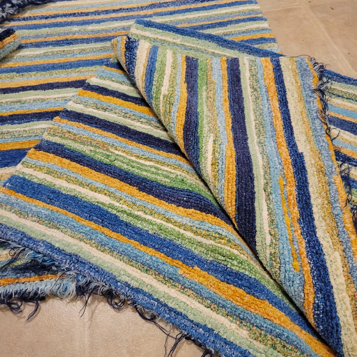 A set of four matching rugs in good condition with no notable stains, but one rug is missing its tassels. These rugs are soft and have a mix of vibrant blues, greens, orange and white. Three are the same size and one is slightly smaller. Measures approximately 37" x 22". Shipping available