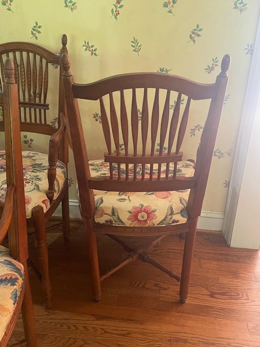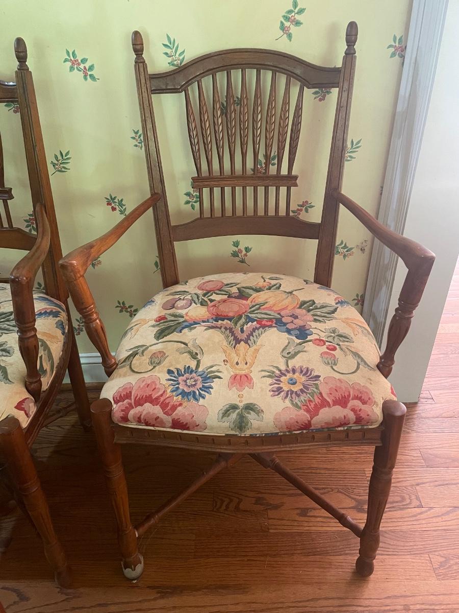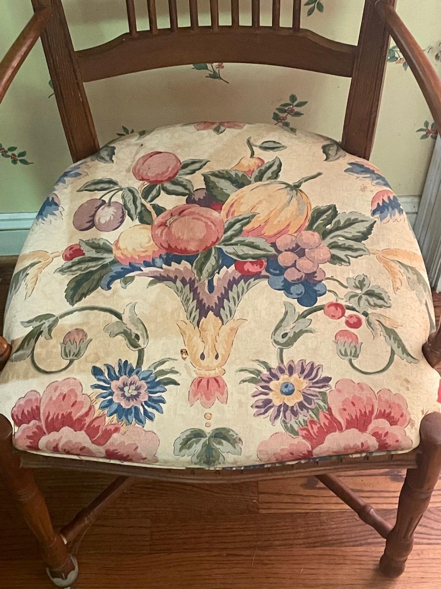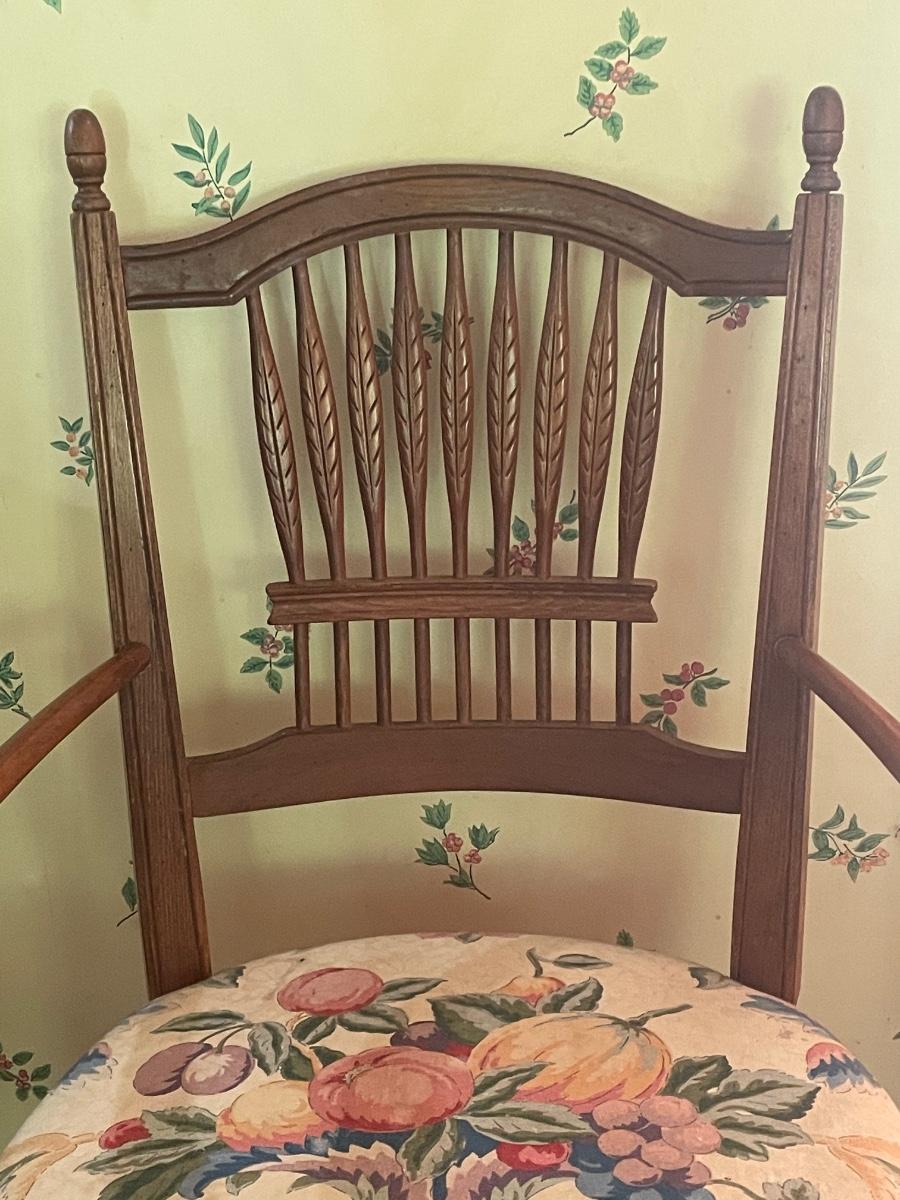 These four maple wood dining chairs from Ethan Allen Legacy Collection have comfortable padded seats upholstered with a jacquard type fabric adorned with fruit that are in very good condition. A matching table is also in this auction in another lot. They are in great condition, some but not all legs have protective rubber feet and all chairs have arms. They measure 23.5” wide x 20” deep x 39” tall with 18” seat height.