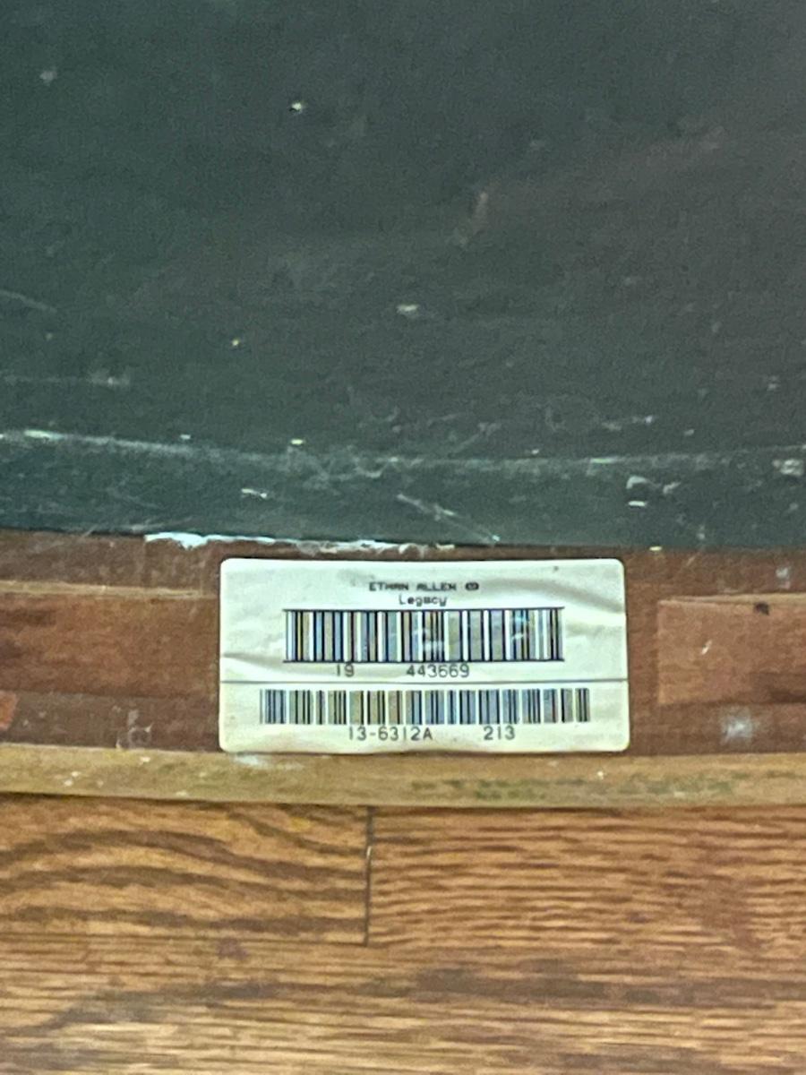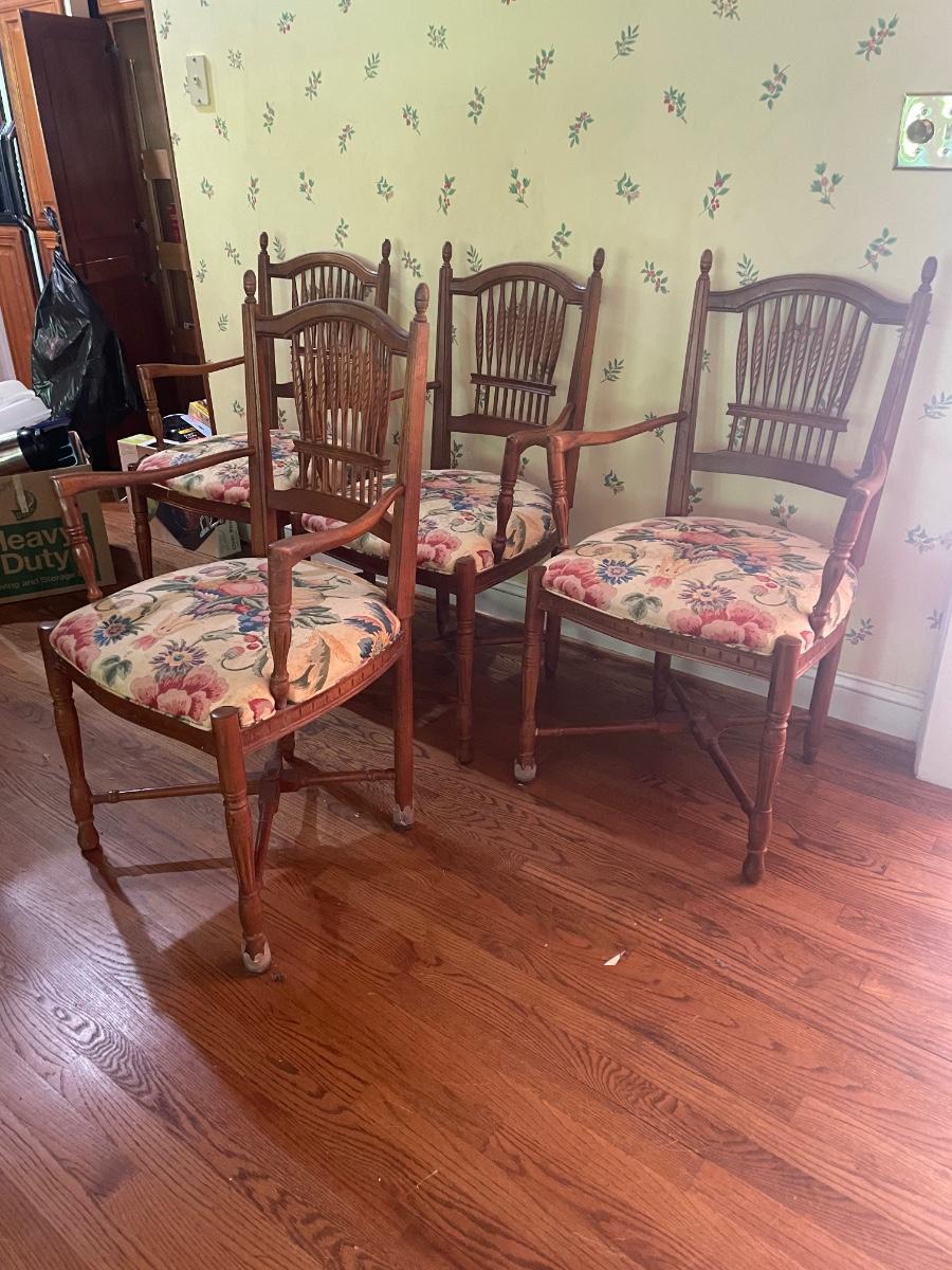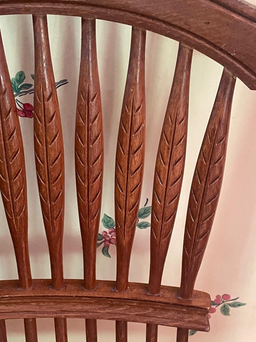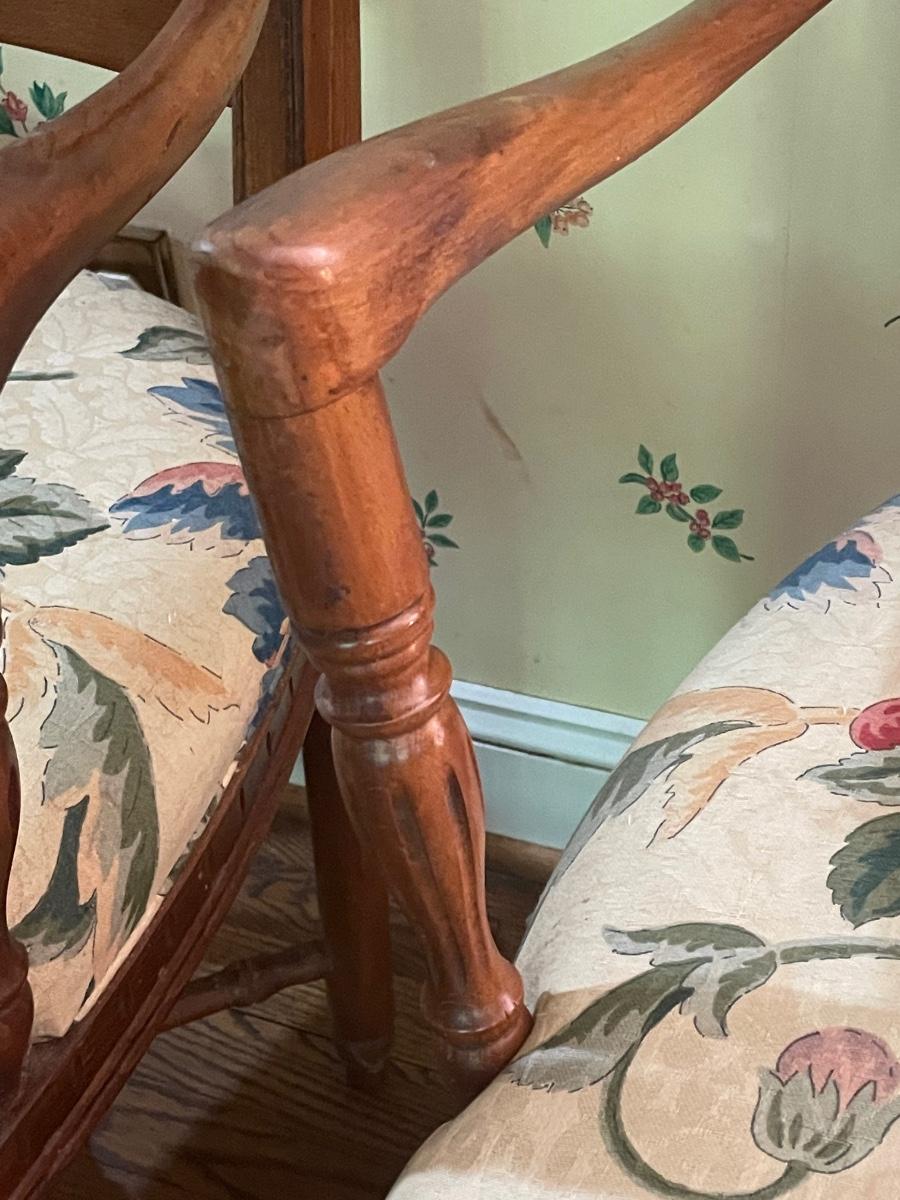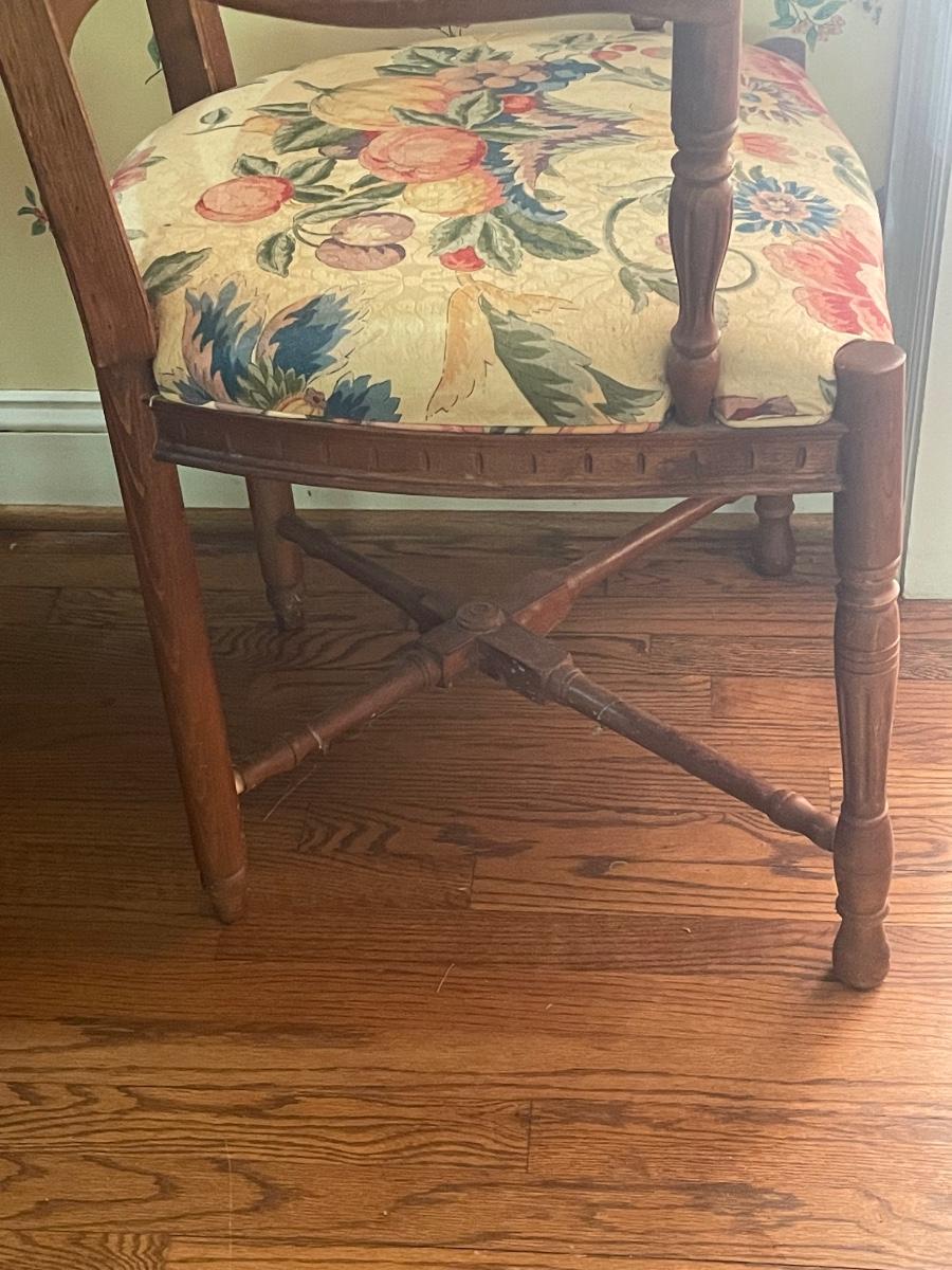 These four maple wood dining chairs from Ethan Allen Legacy Collection have comfortable padded seats upholstered with a jacquard type fabric adorned with fruit that are in very good condition. A matching table is also in this auction in another lot. They are in great condition, some but not all legs have protective rubber feet and all chairs have arms. They measure 23.5” wide x 20” deep x 39” tall with 18” seat height.