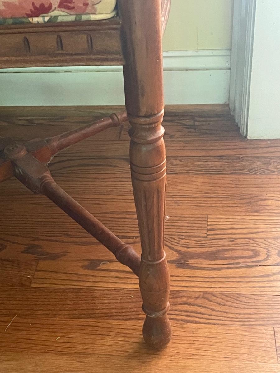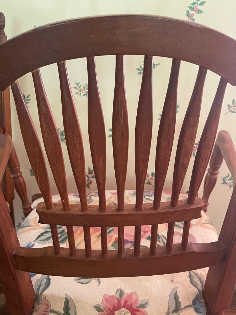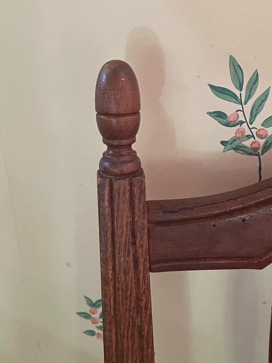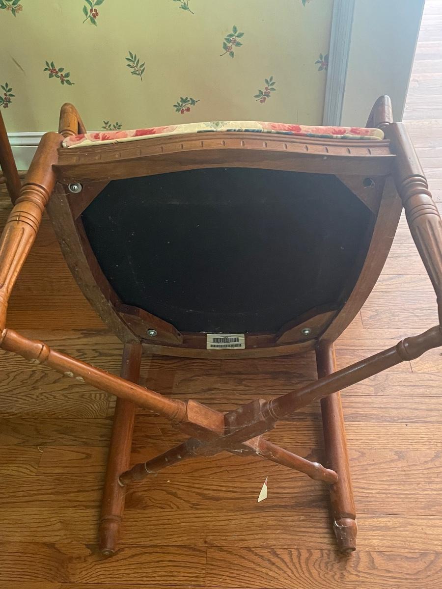 These four maple wood dining chairs from Ethan Allen Legacy Collection have comfortable padded seats upholstered with a jacquard type fabric adorned with fruit that are in very good condition. A matching table is also in this auction in another lot. They are in great condition, some but not all legs have protective rubber feet and all chairs have arms. They measure 23.5” wide x 20” deep x 39” tall with 18” seat height.