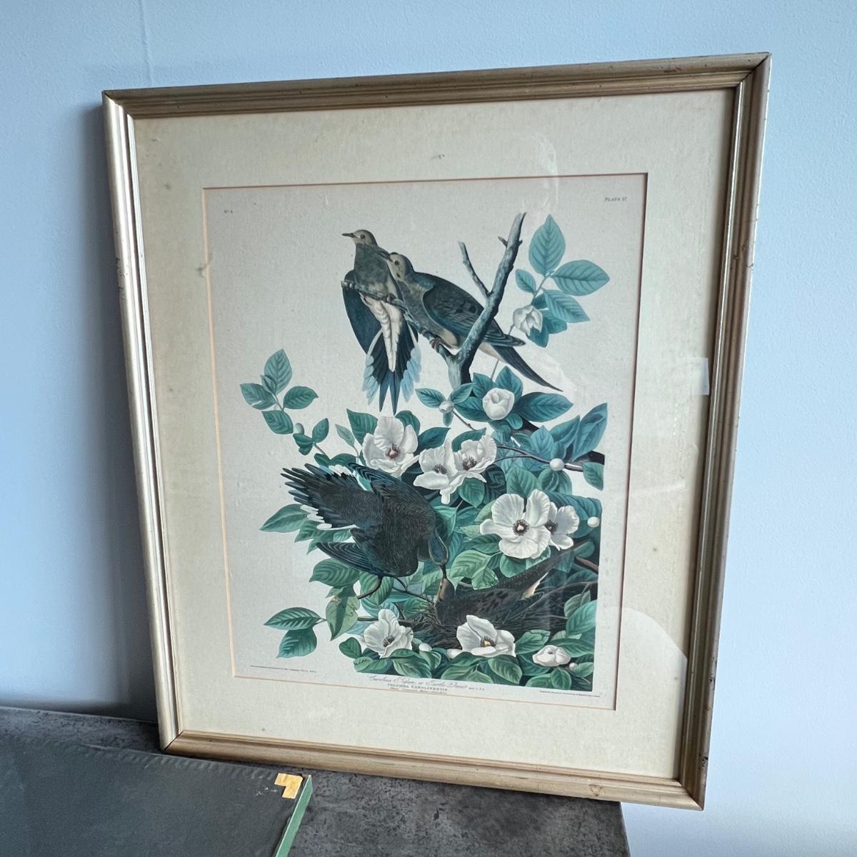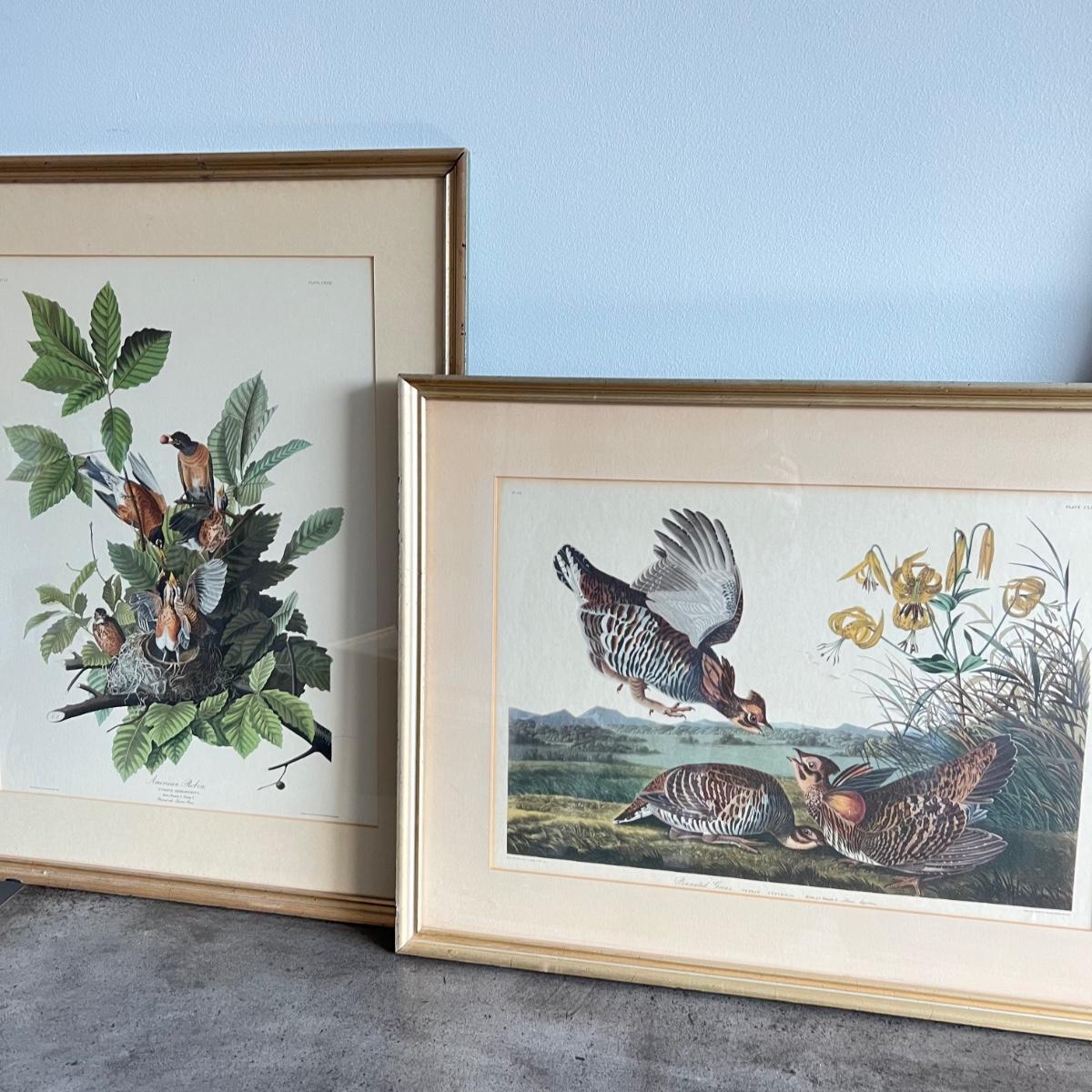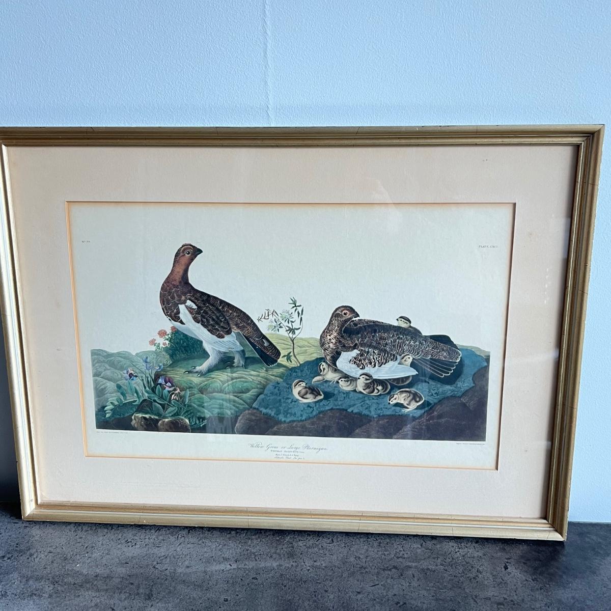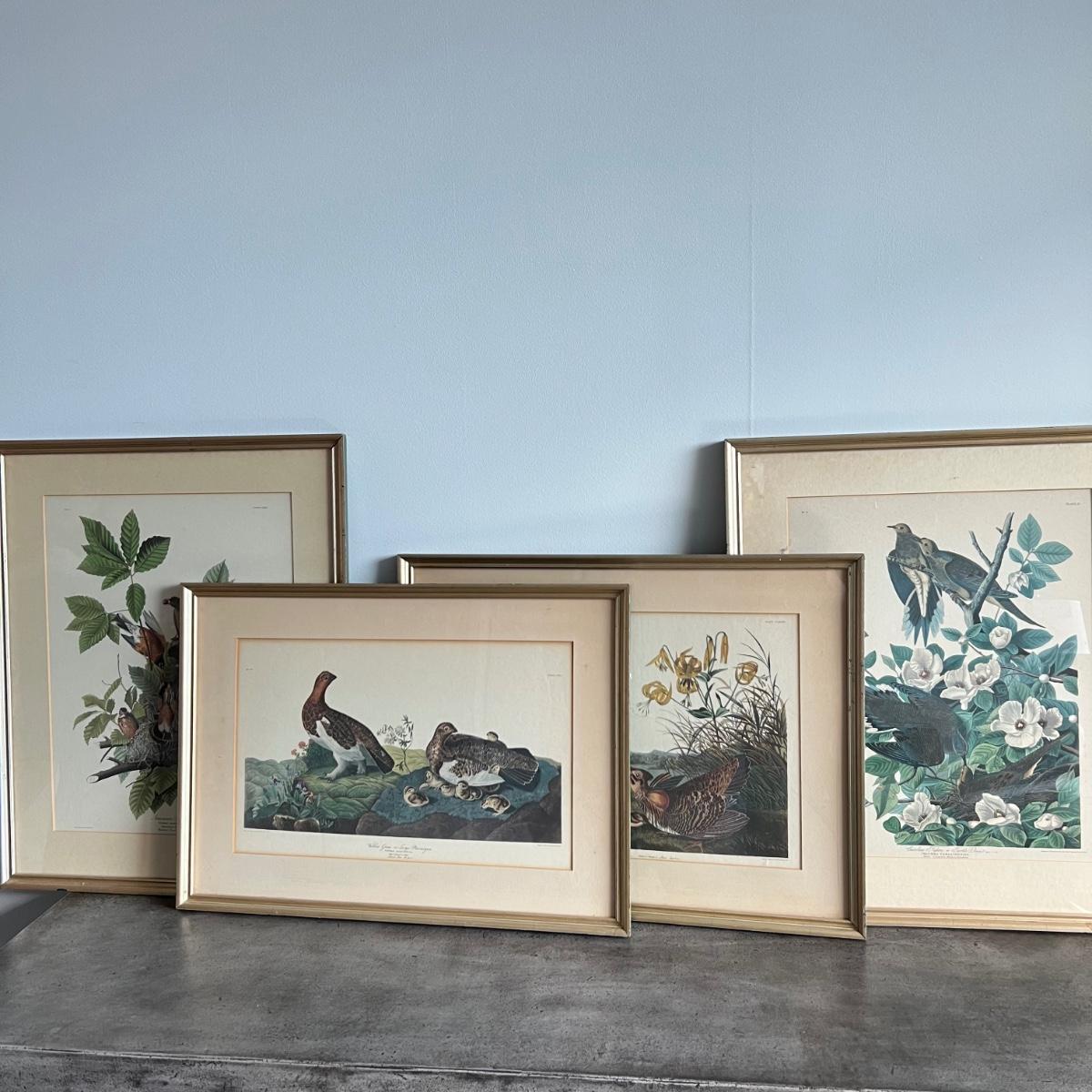These 4 Audubon prints come under glass and in matching gilt and green frames that have some very minor signs of age with a few dings shown in images. They are all slightly different in size with the Autumn Robins frame being the largest at 21” x 25.5” and smallest being Willow Gross“🦆 at 17.5” x 24.5”. Each print is titled and has a plate number, see images. Note that there are some light moisture marks on some prints and matting also shown in images.
