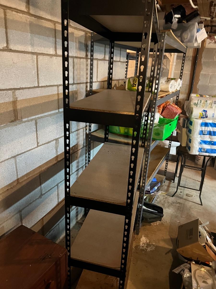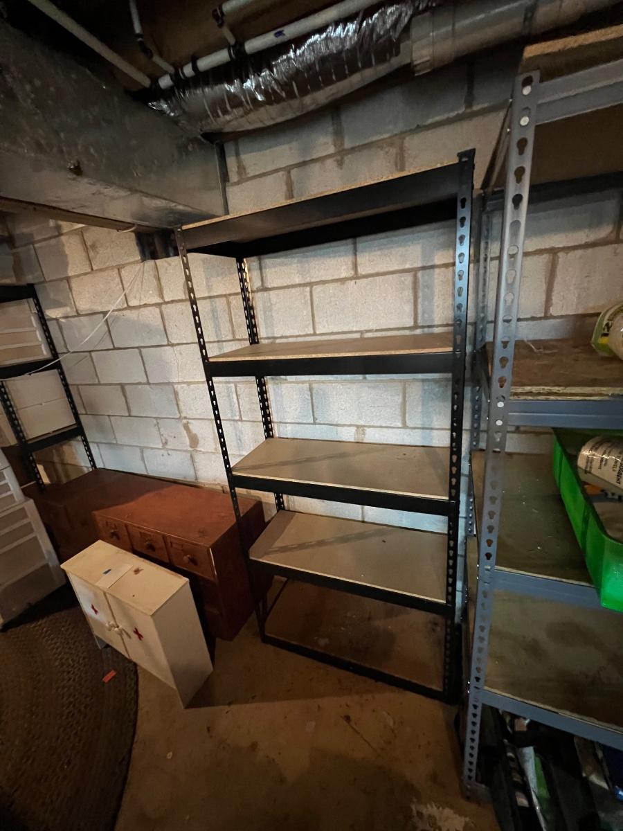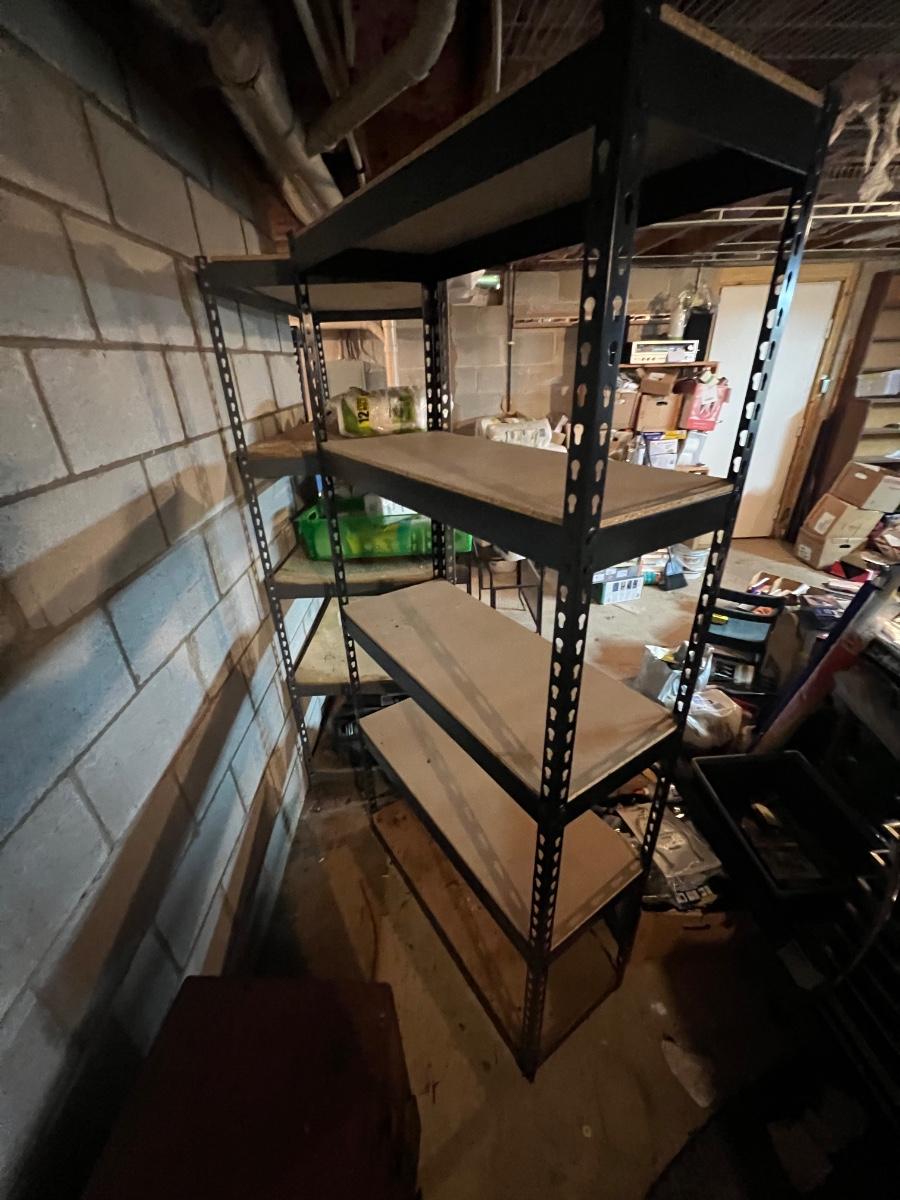 Here four shelf units each measure 34” x 14” x 72”H. The pressed wood shelves are removable, note the bottom on each unit has heavy stains, likely from moisture. One unit is pictured with tubs that are NOT included but are available in a lot in this auction.