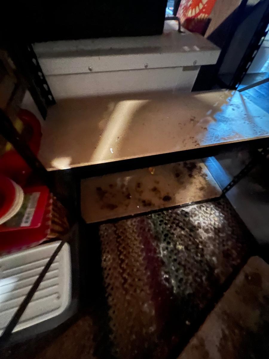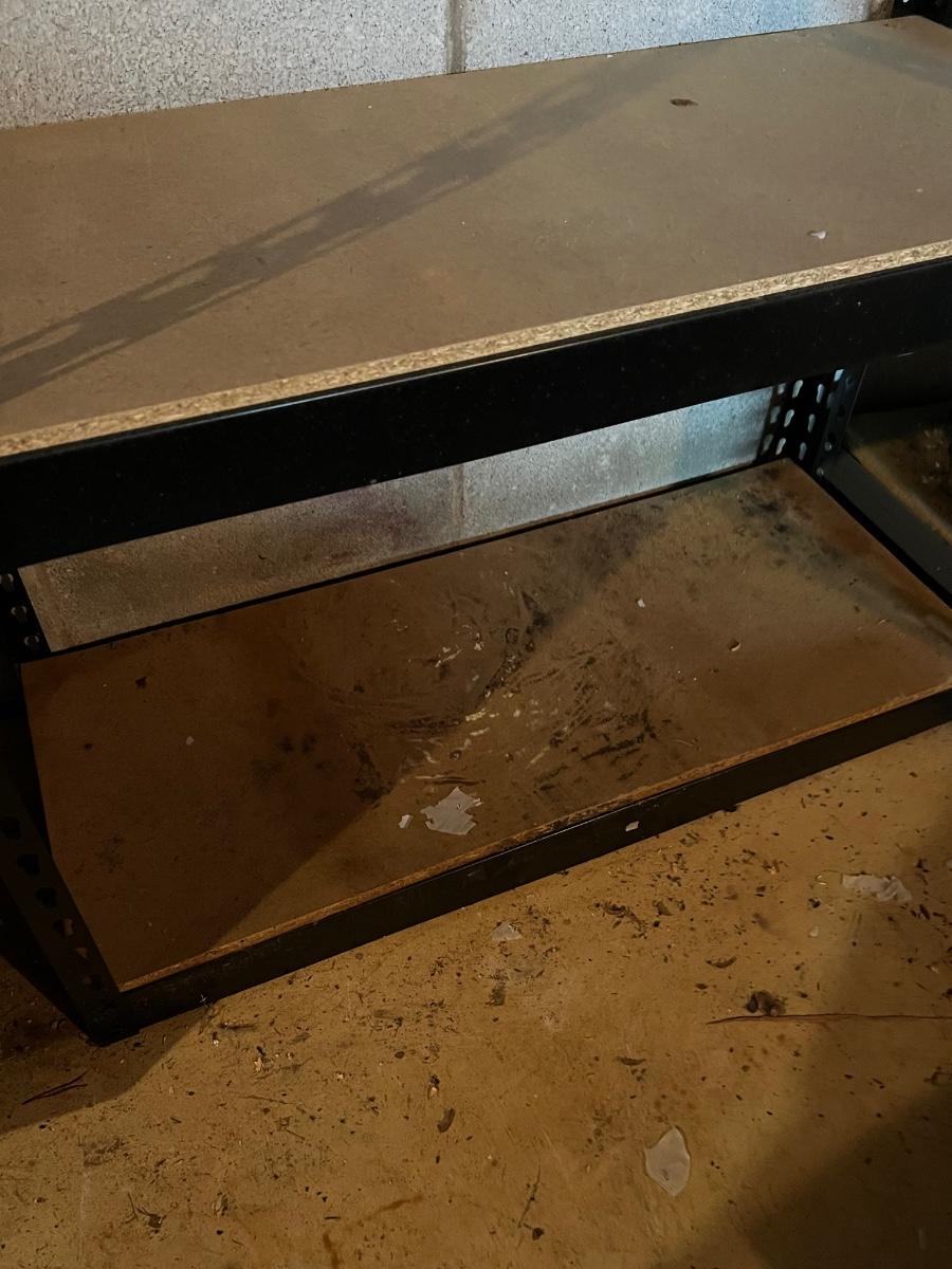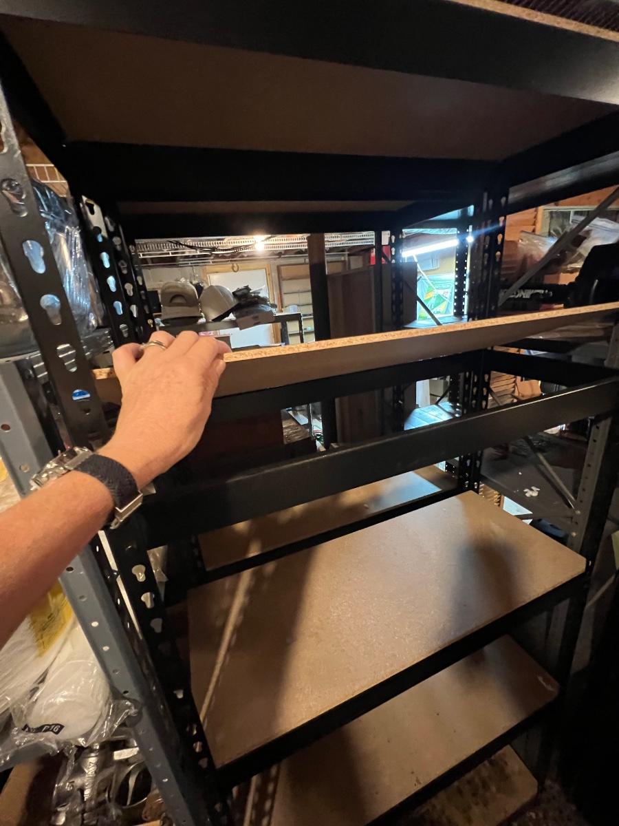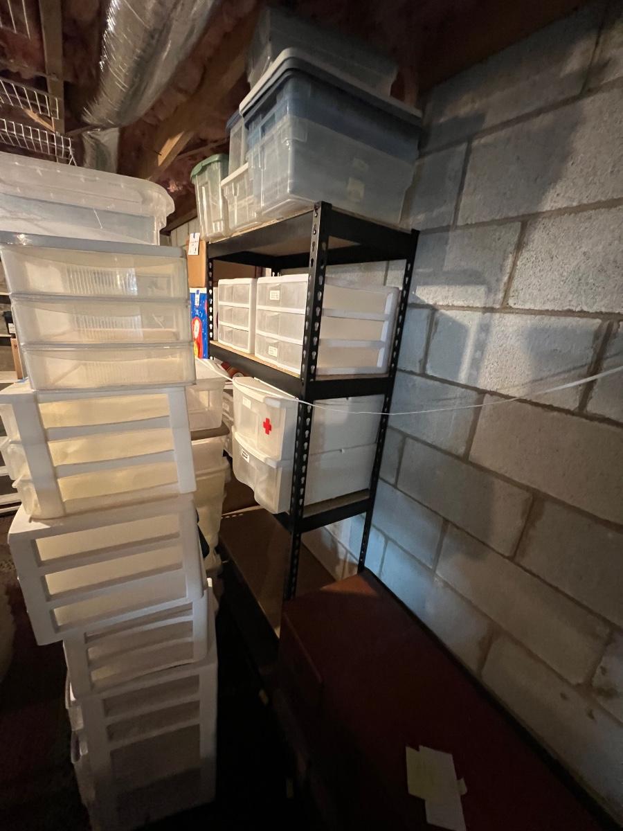 Here four shelf units each measure 34” x 14” x 72”H. The pressed wood shelves are removable, note the bottom on each unit has heavy stains, likely from moisture. One unit is pictured with tubs that are NOT included but are available in a lot in this auction.