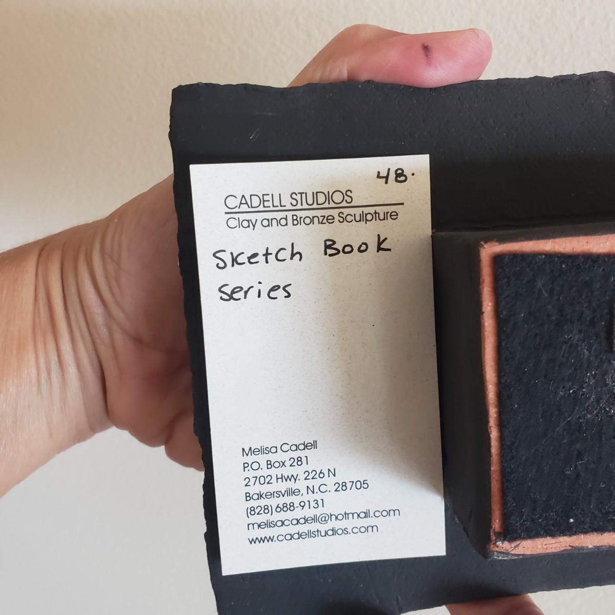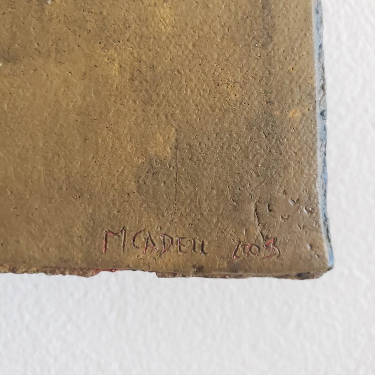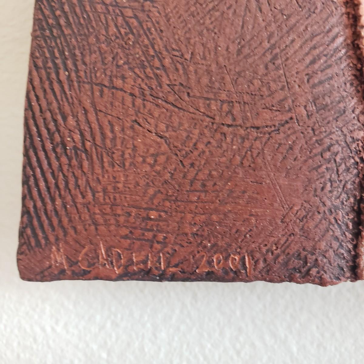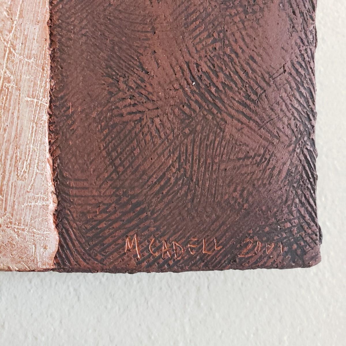This four piece clay sculpture lot is by artist Melisa Cadell from Bakersfield, NC. The top two sculptures pictured do not have titles, however the bottom two have labels on the back. They all have felt adhered to the back with a hole for mounting. Each piece measures approximately 5" x 7". They come off the wall 1.5".