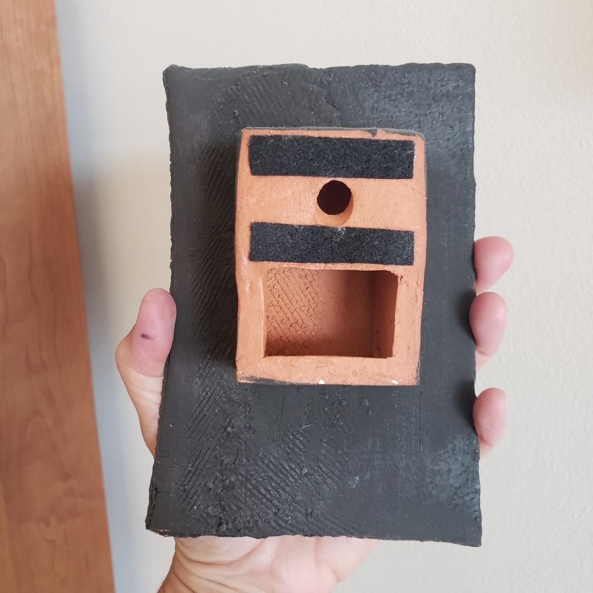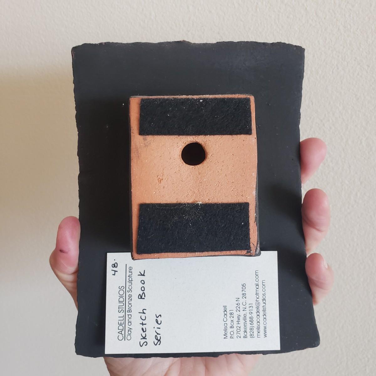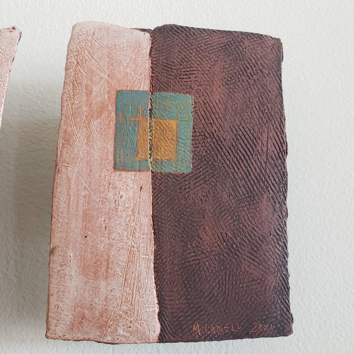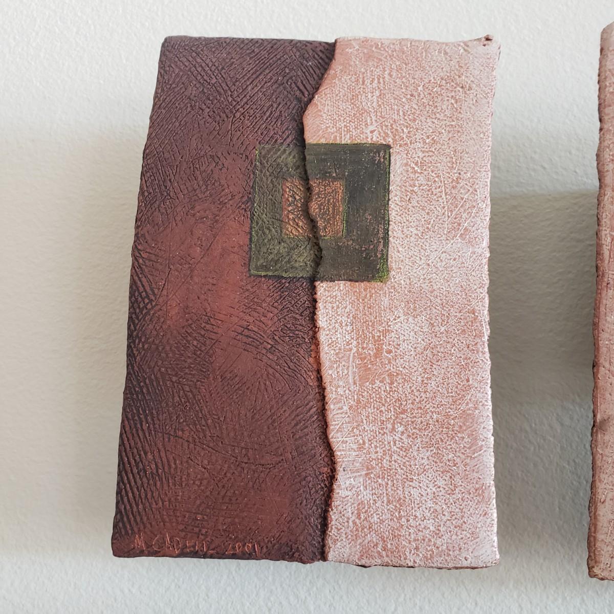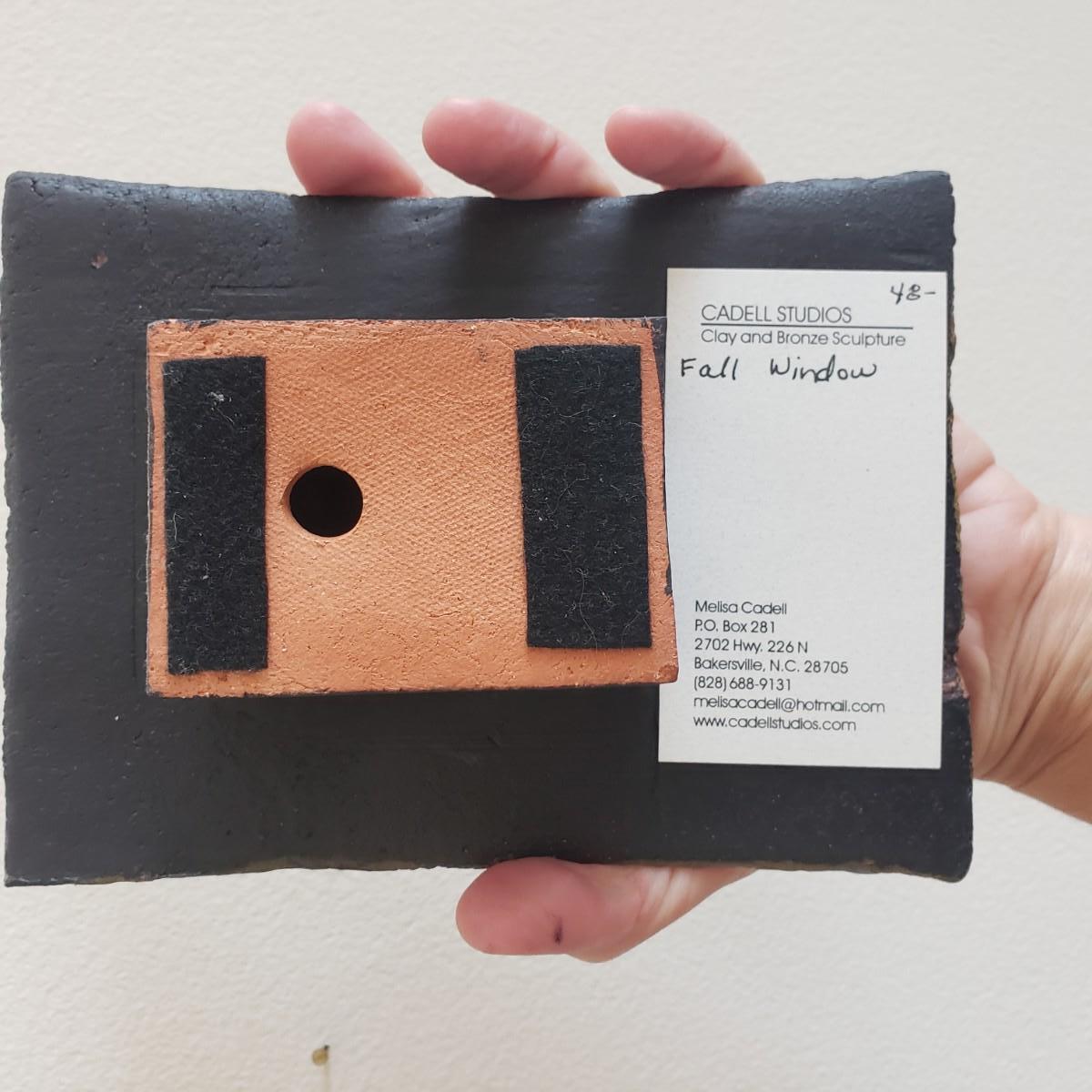 This four piece clay sculpture lot is by artist Melisa Cadell from Bakersfield, NC. The top two sculptures pictured do not have titles, however the bottom two have labels on the back. They all have felt adhered to the back with a hole for mounting. Each piece measures approximately 5" x 7". They come off the wall 1.5".