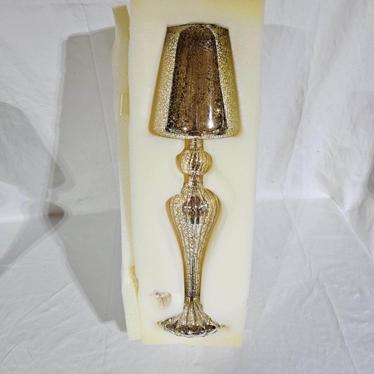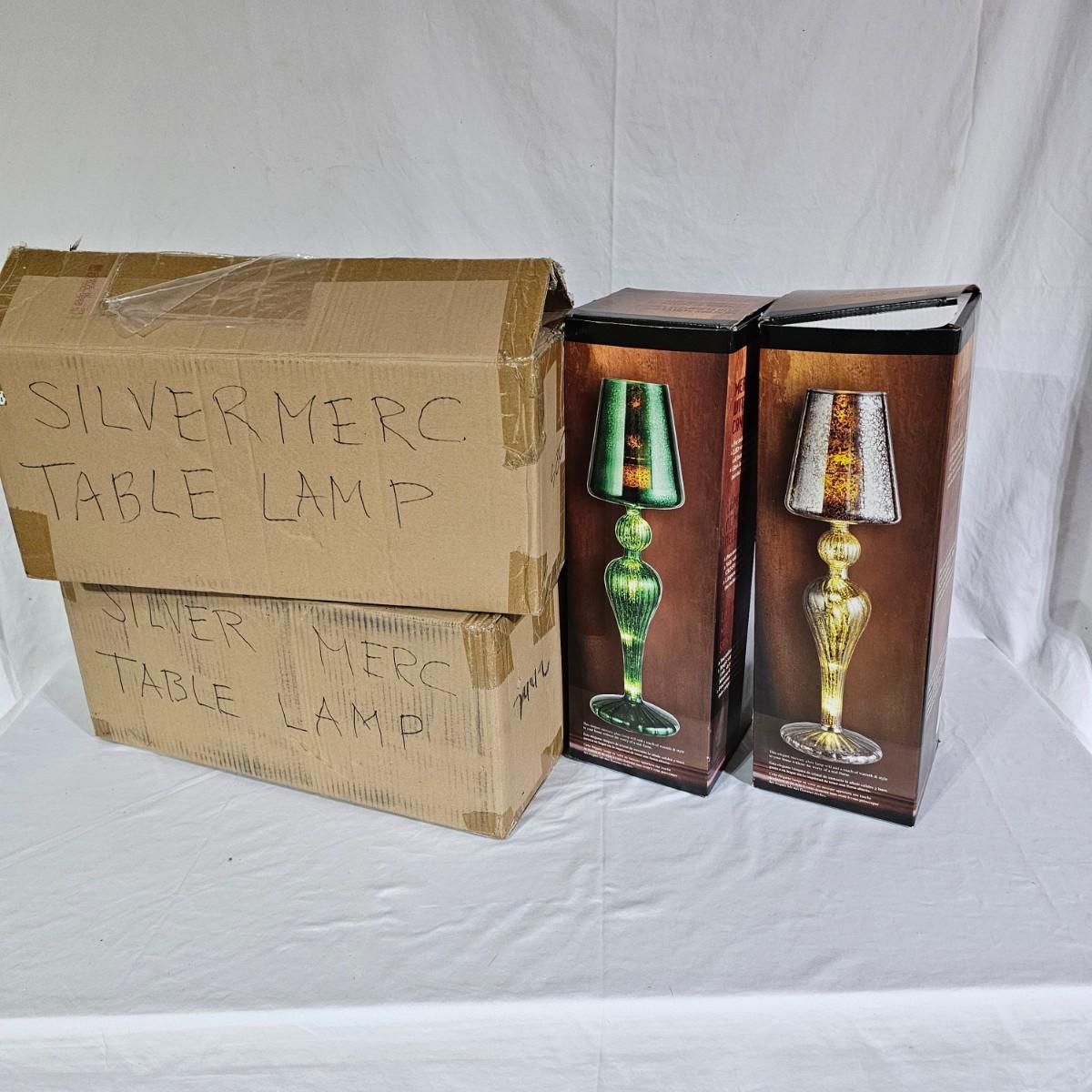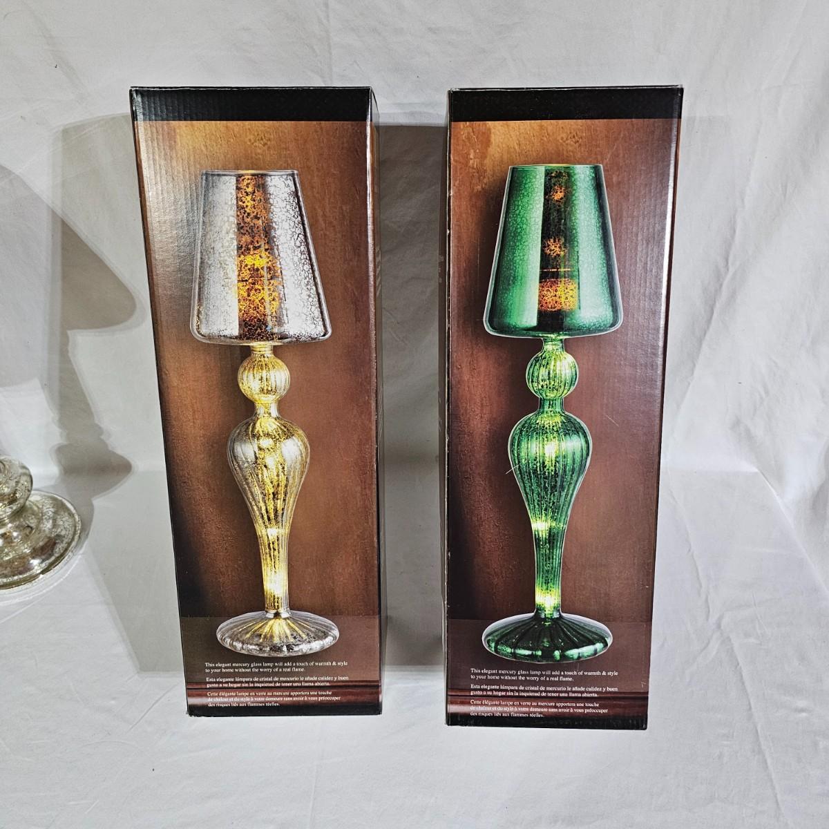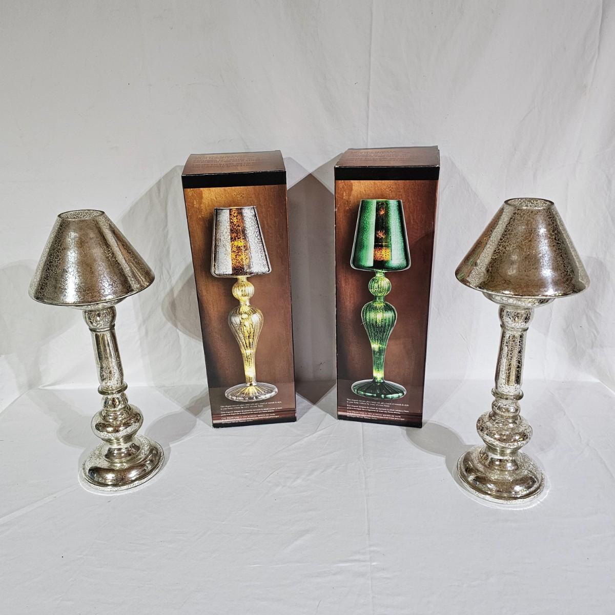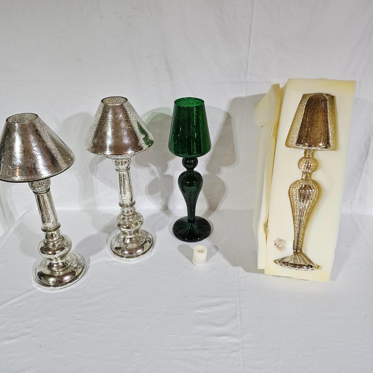 Two silver, one gold and one green Mercury Glass battery operated table lamps. Silver lamps have removable top piece which holds the battery compartment. 7"D x 18"H. Gold and green lamps are one piece, are 5"D x 15"H, have lights in base and also a separate candle unit for the top, included. All items untested. See photos for details. Shipping available.