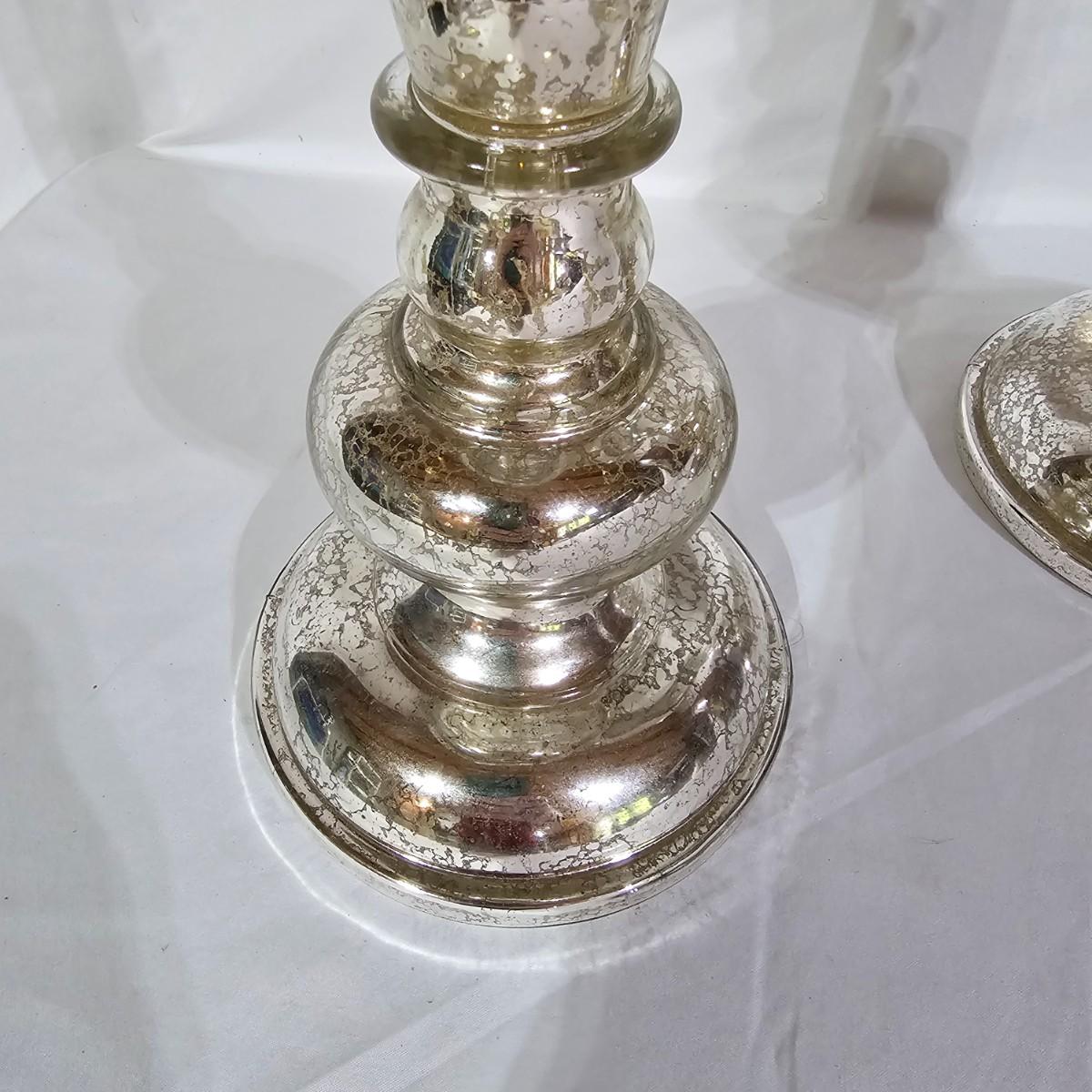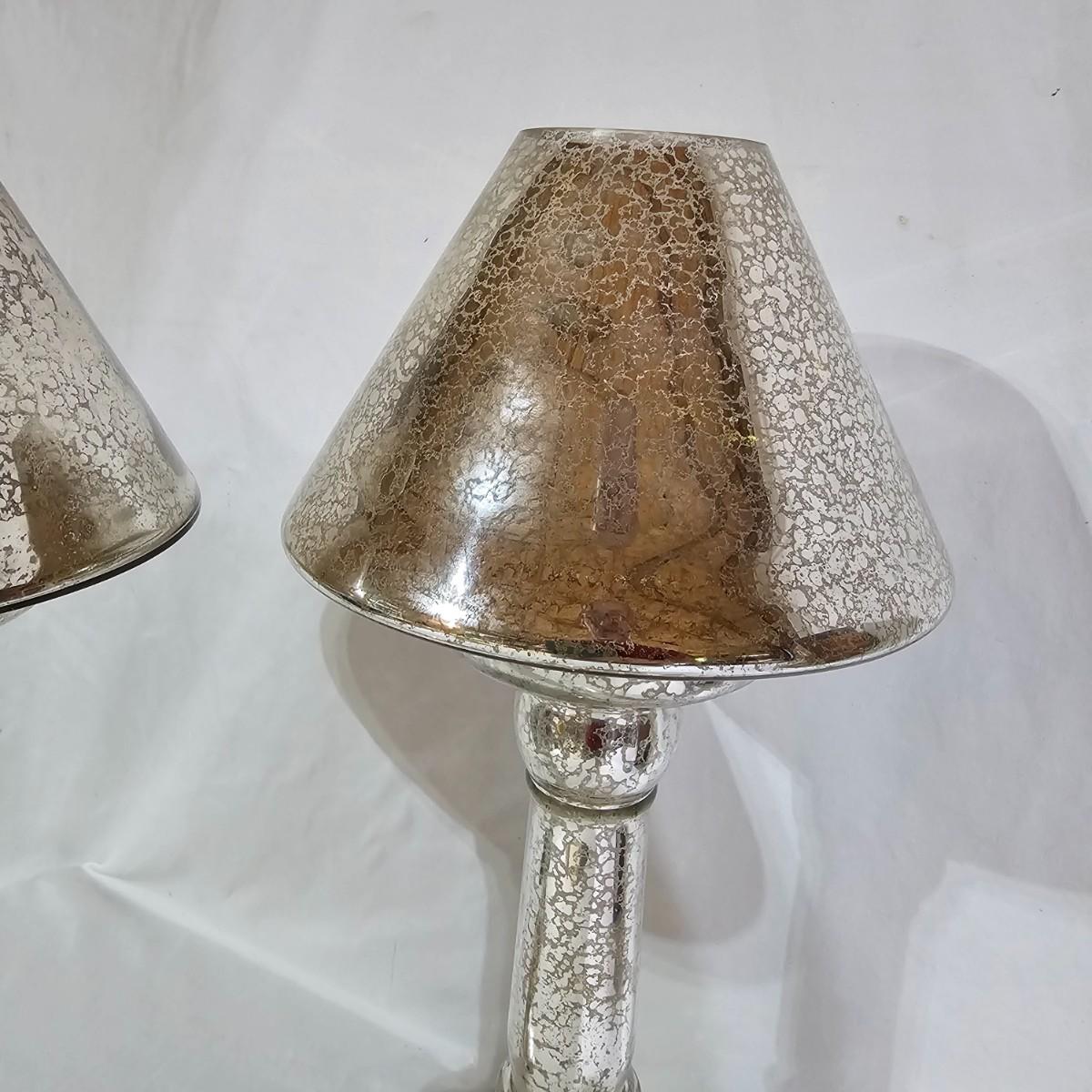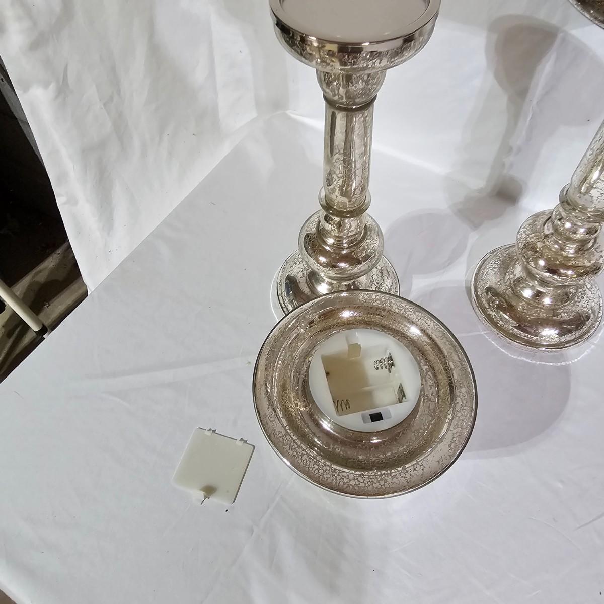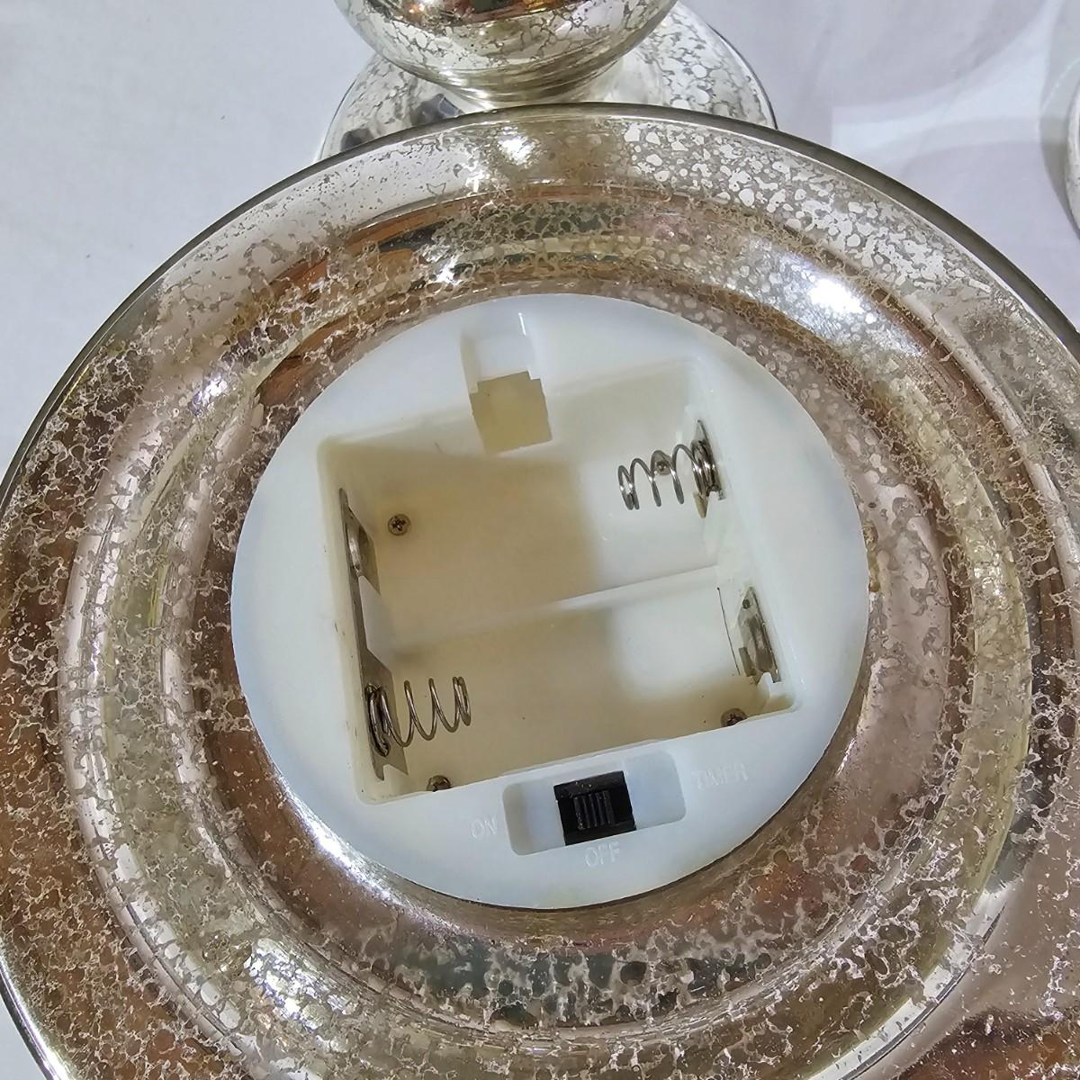 Two silver, one gold and one green Mercury Glass battery operated table lamps. Silver lamps have removable top piece which holds the battery compartment. 7"D x 18"H. Gold and green lamps are one piece, are 5"D x 15"H, have lights in base and also a separate candle unit for the top, included. All items untested. See photos for details. Shipping available.