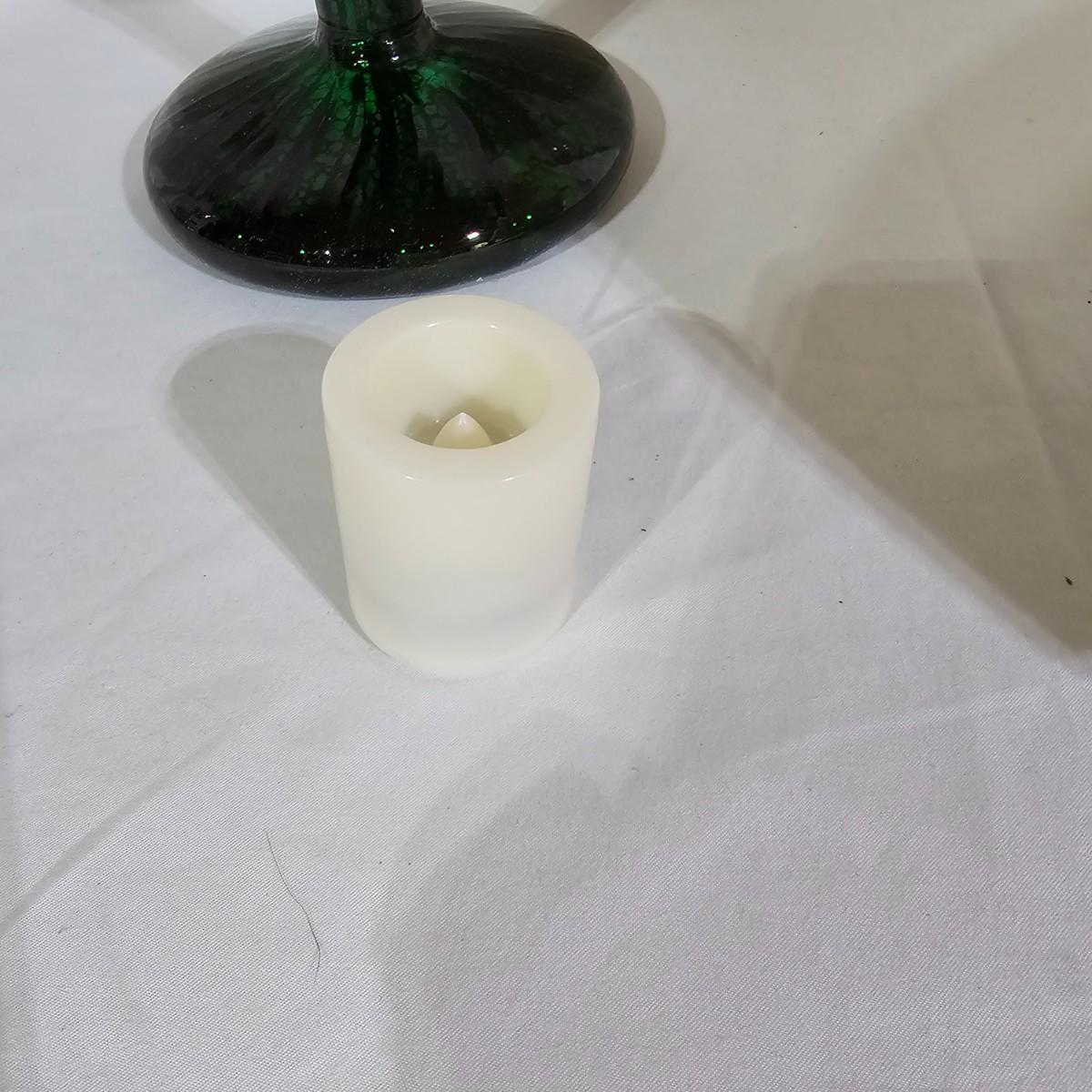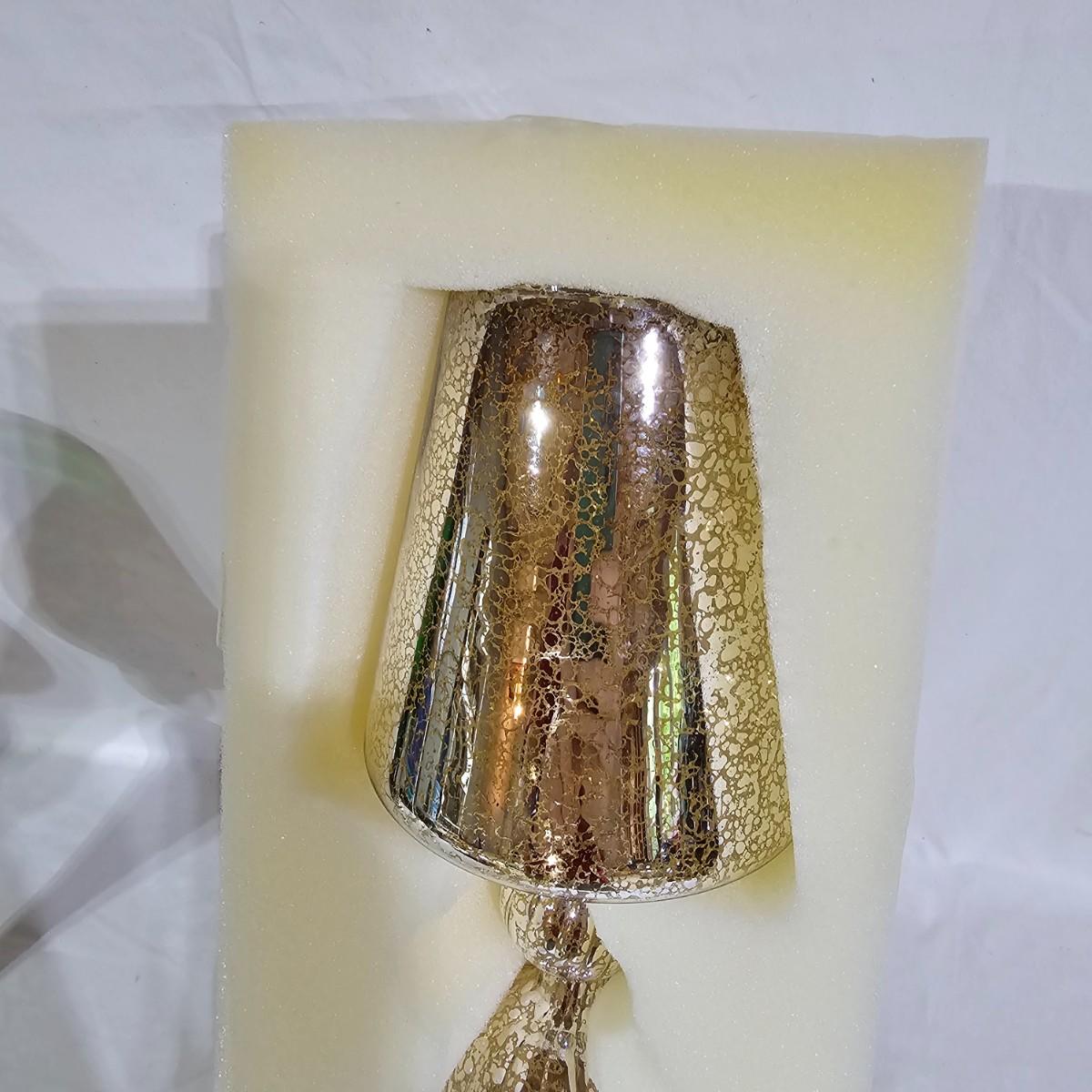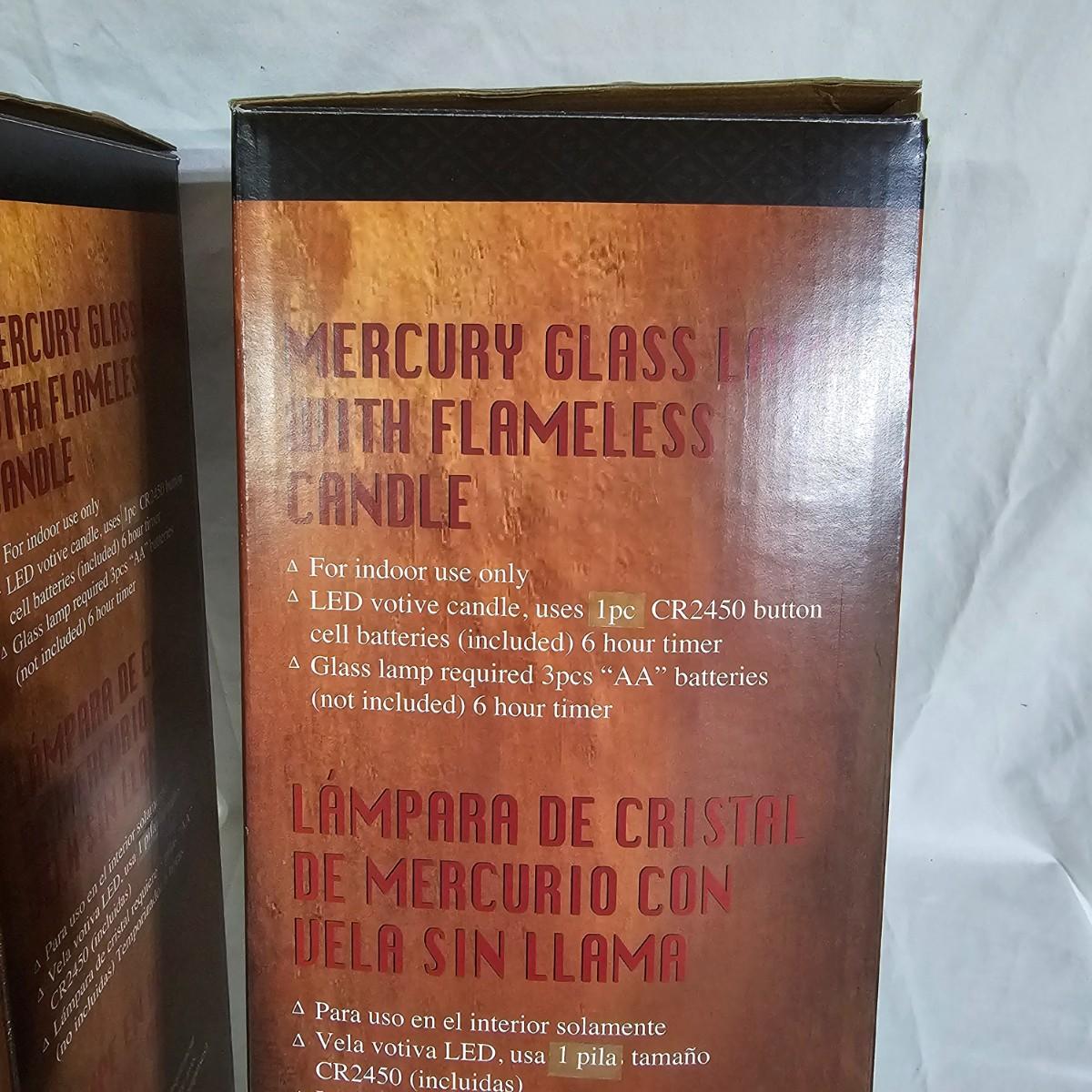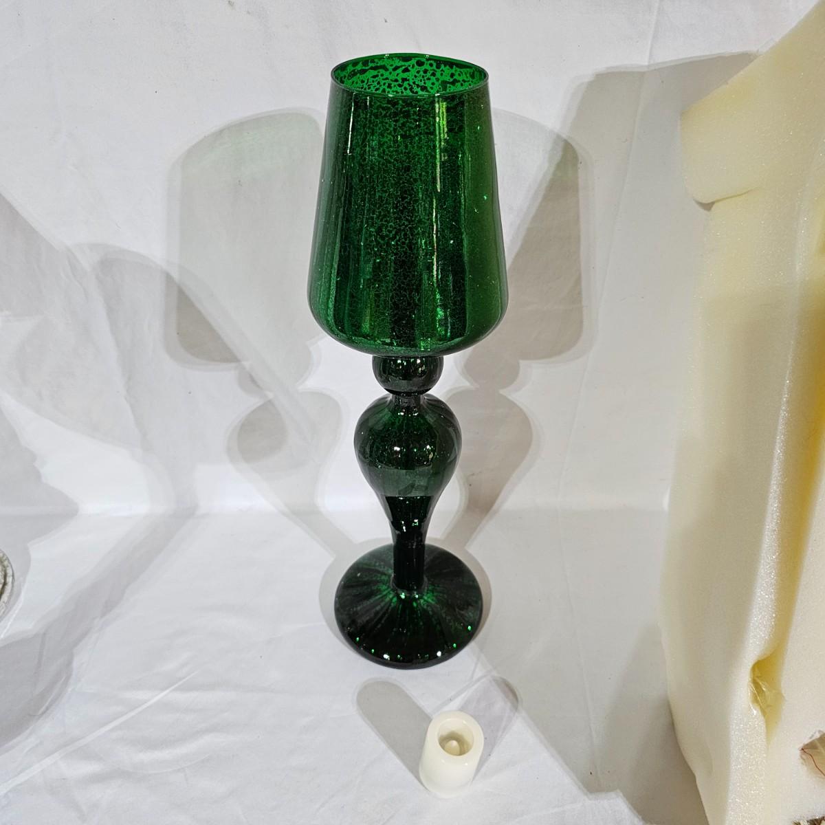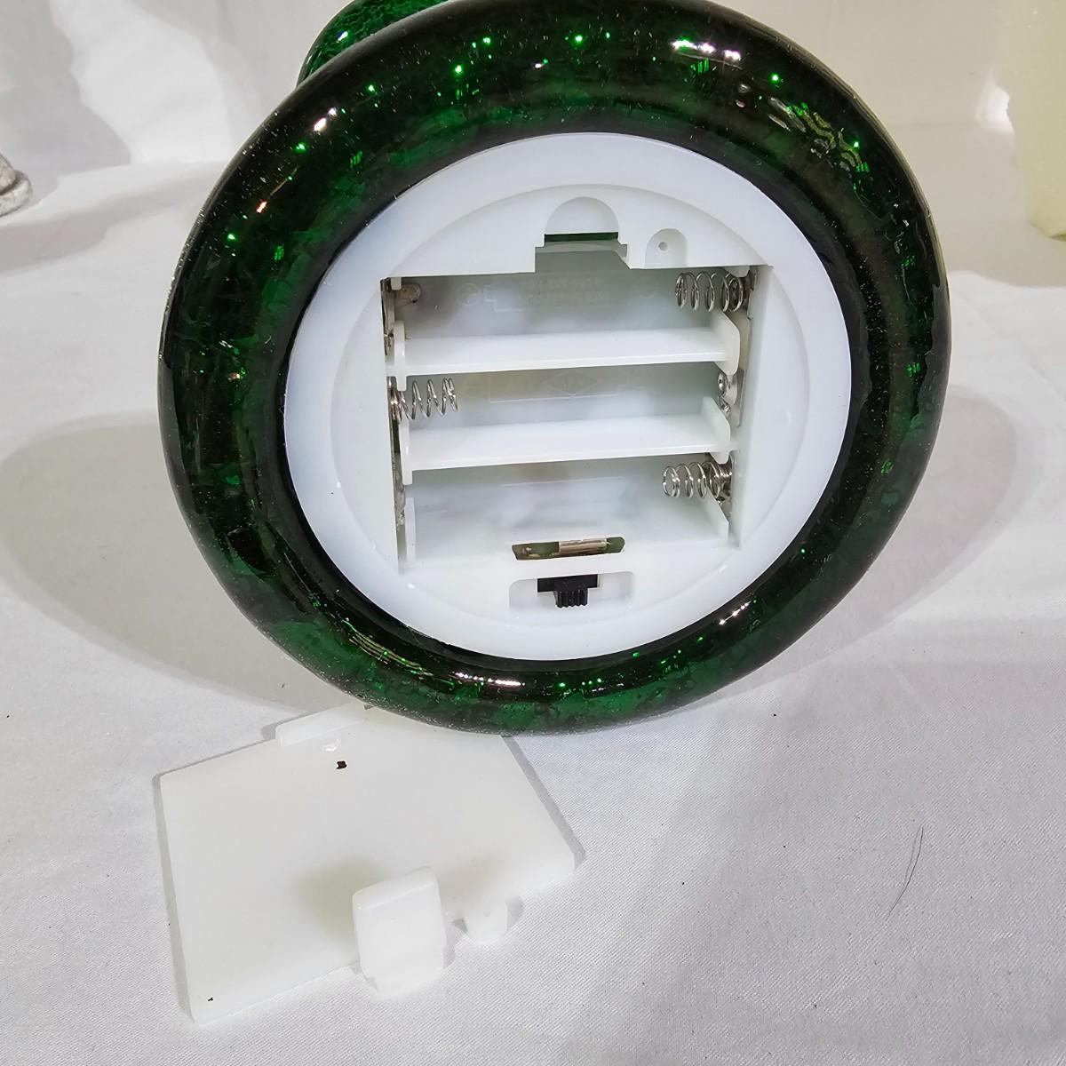 Two silver, one gold and one green Mercury Glass battery operated table lamps. Silver lamps have removable top piece which holds the battery compartment. 7"D x 18"H. Gold and green lamps are one piece, are 5"D x 15"H, have lights in base and also a separate candle unit for the top, included. All items untested. See photos for details. Shipping available.
