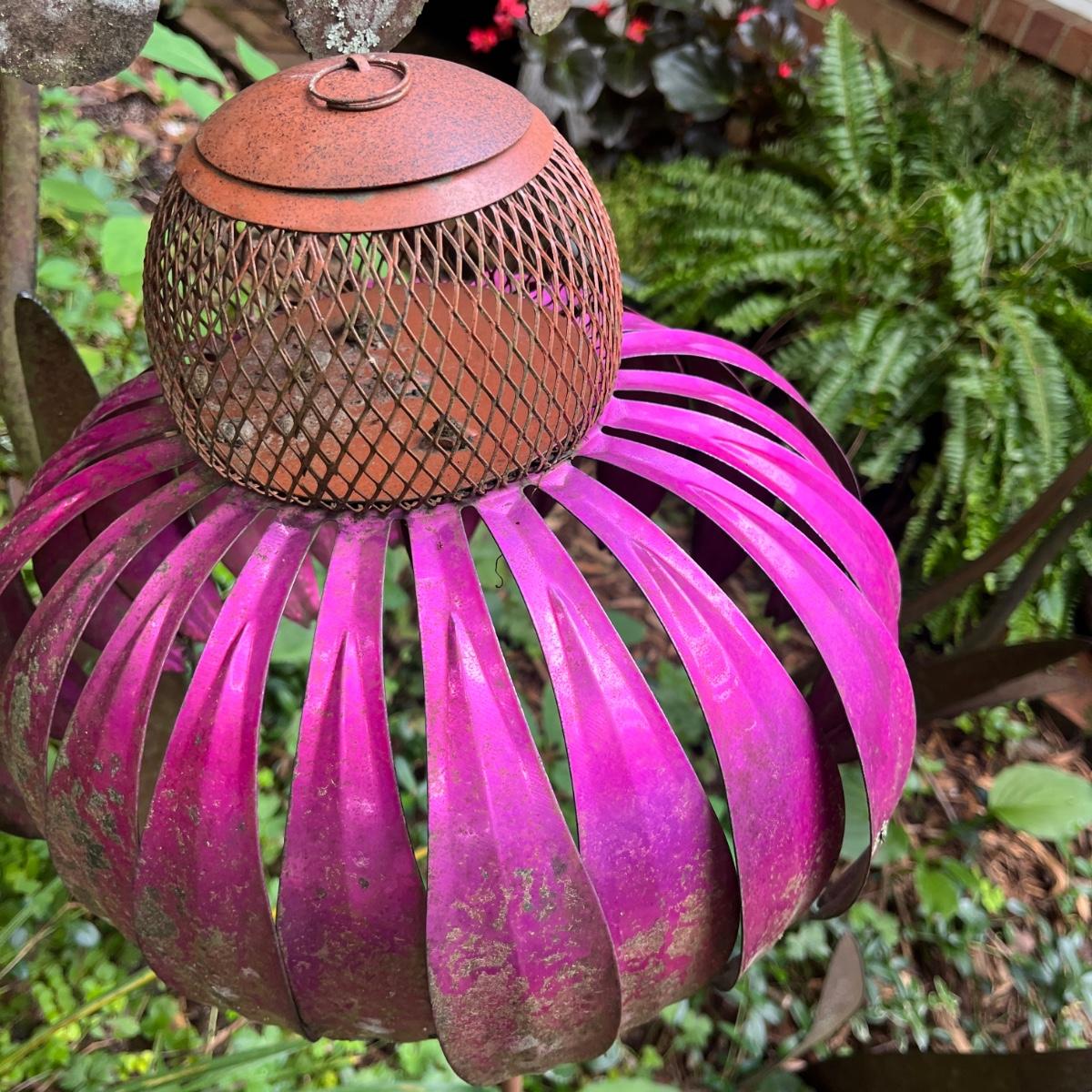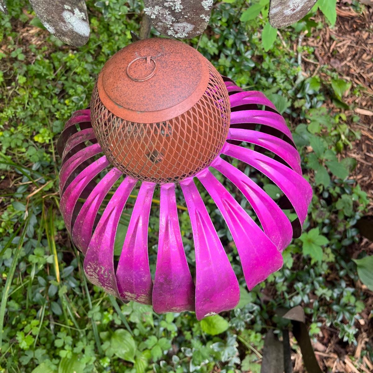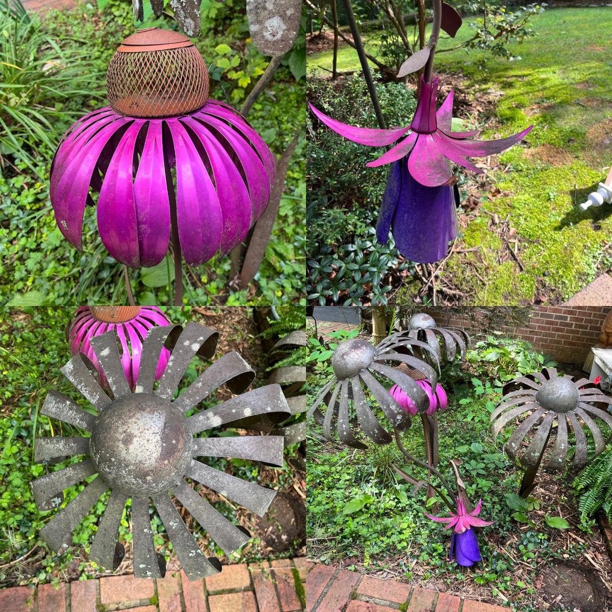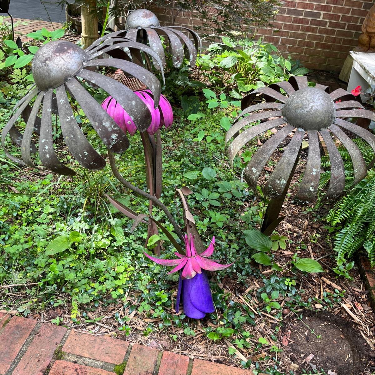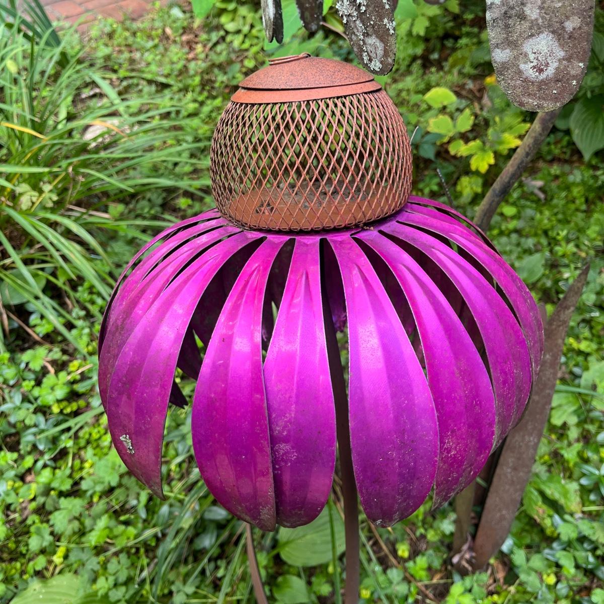 Lot includes 3 metal coneflowers in standard metal colors, one metal coneflower with vibrant colors and a metal hummingbird feeder also with vibrant colors. Largest flower measures 20”D x 48”H. Iron hanger that hummingbird feeder is shown on is not included.