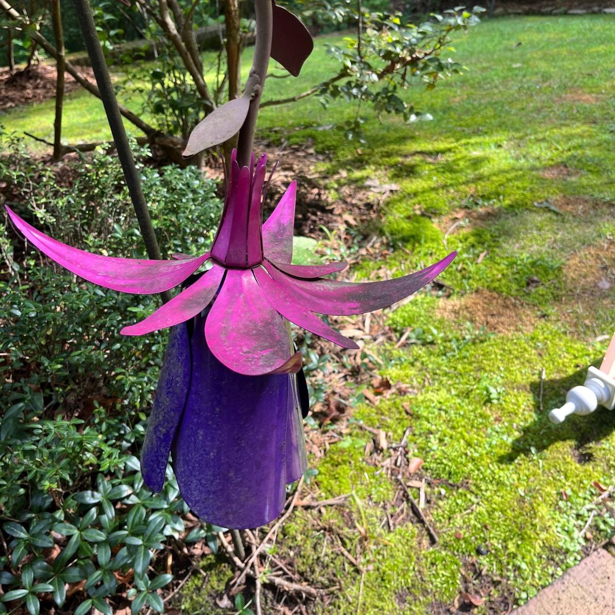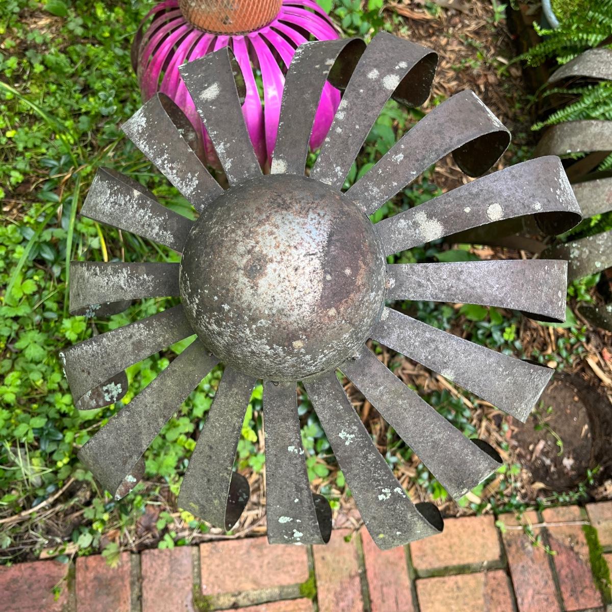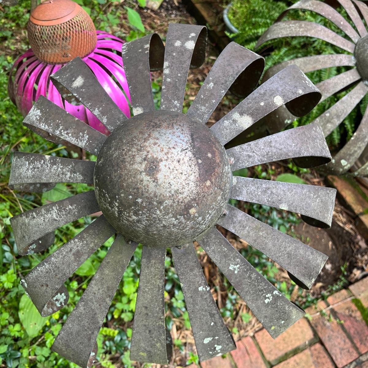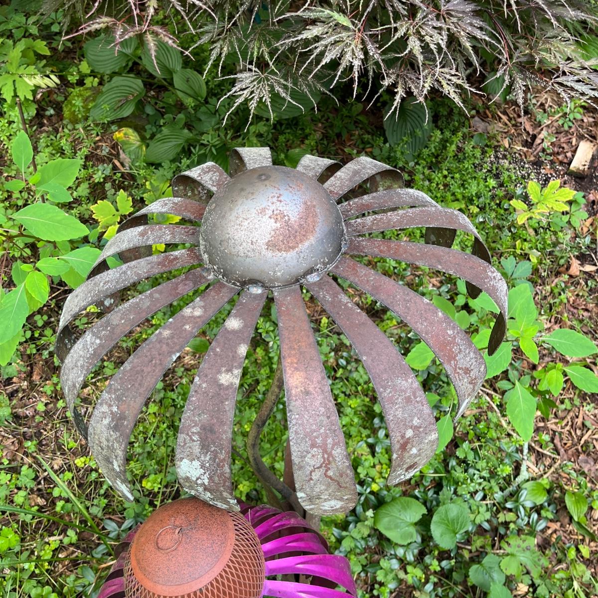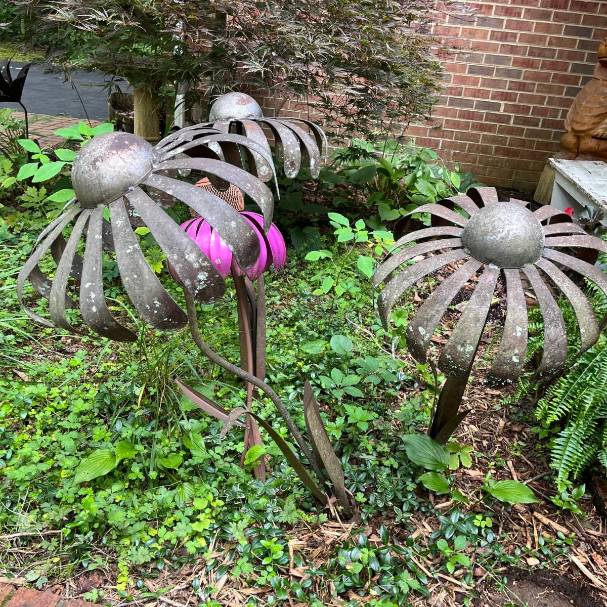 Lot includes 3 metal coneflowers in standard metal colors, one metal coneflower with vibrant colors and a metal hummingbird feeder also with vibrant colors. Largest flower measures 20”D x 48”H. Iron hanger that hummingbird feeder is shown on is not included.