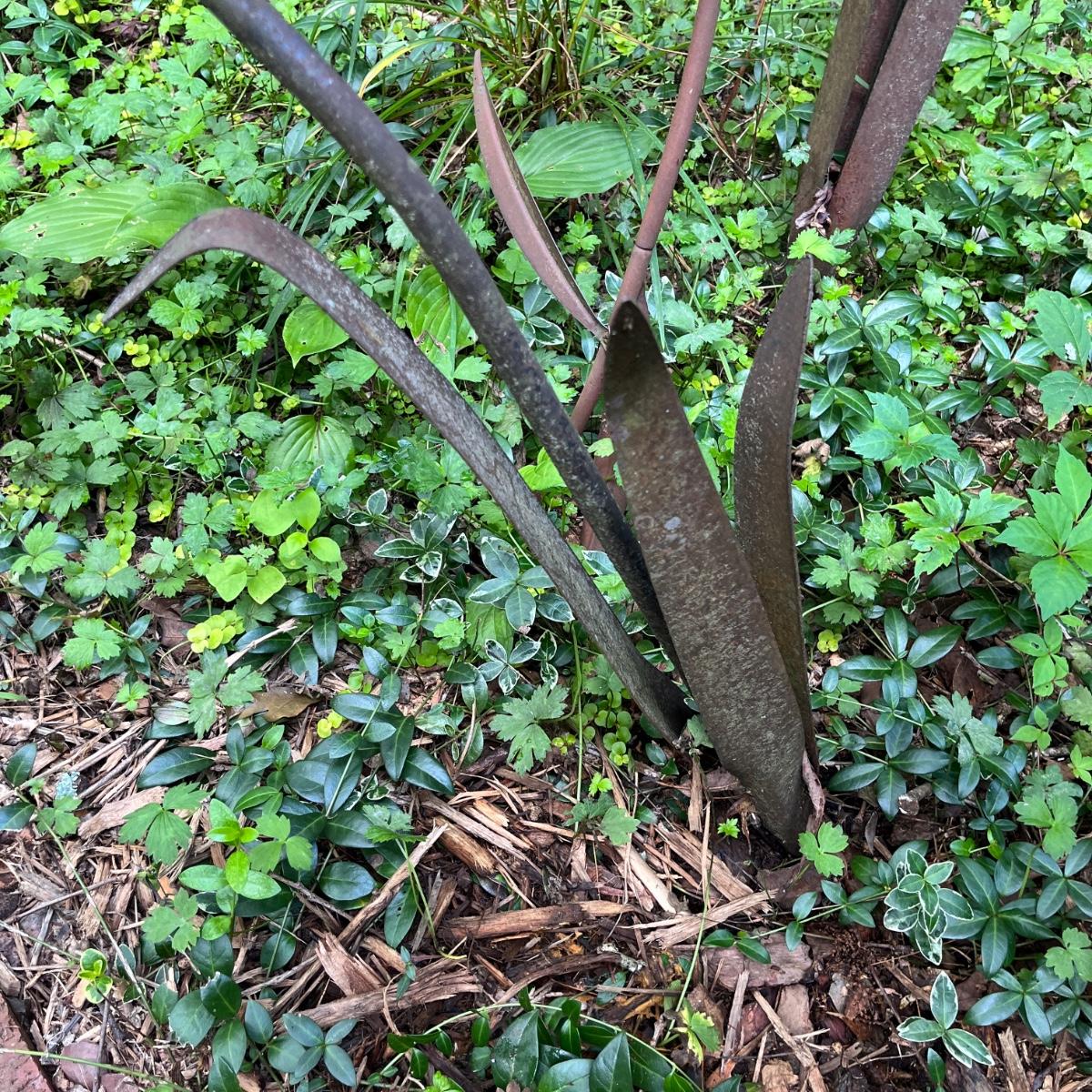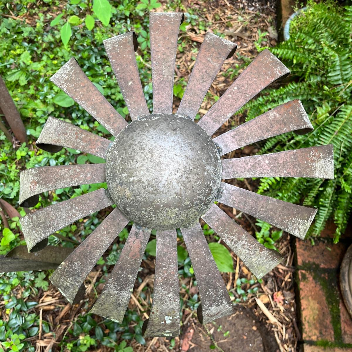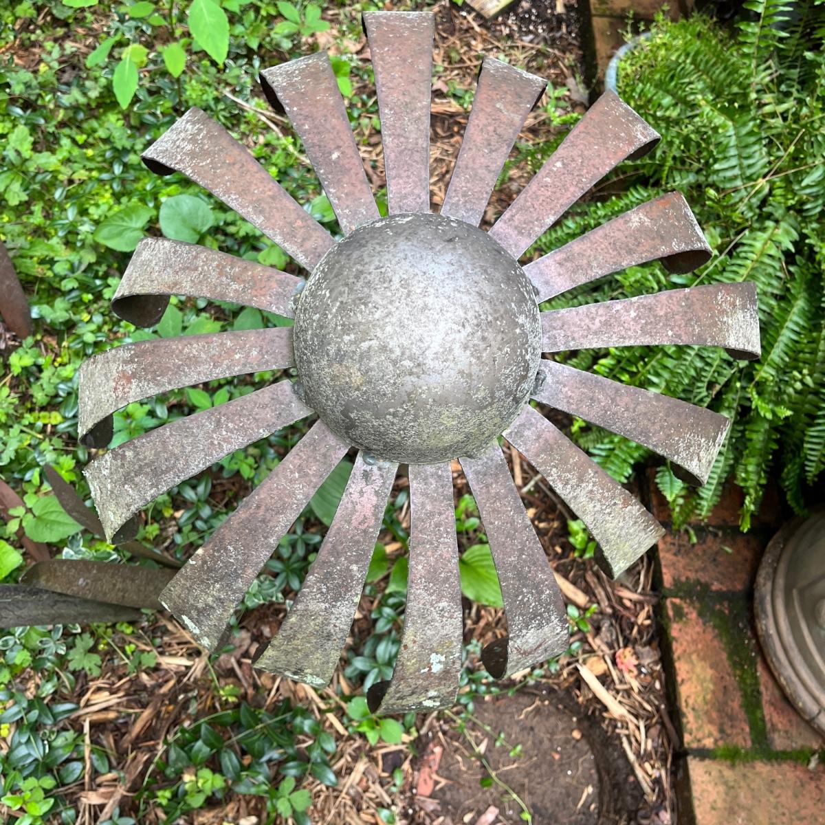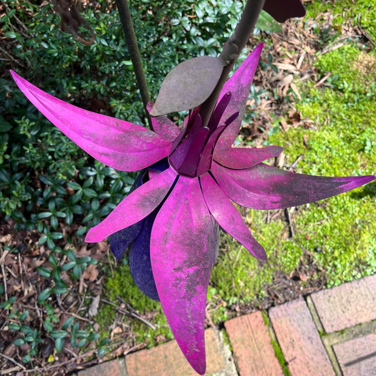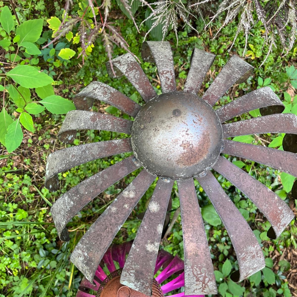 Lot includes 3 metal coneflowers in standard metal colors, one metal coneflower with vibrant colors and a metal hummingbird feeder also with vibrant colors. Largest flower measures 20”D x 48”H. Iron hanger that hummingbird feeder is shown on is not included.